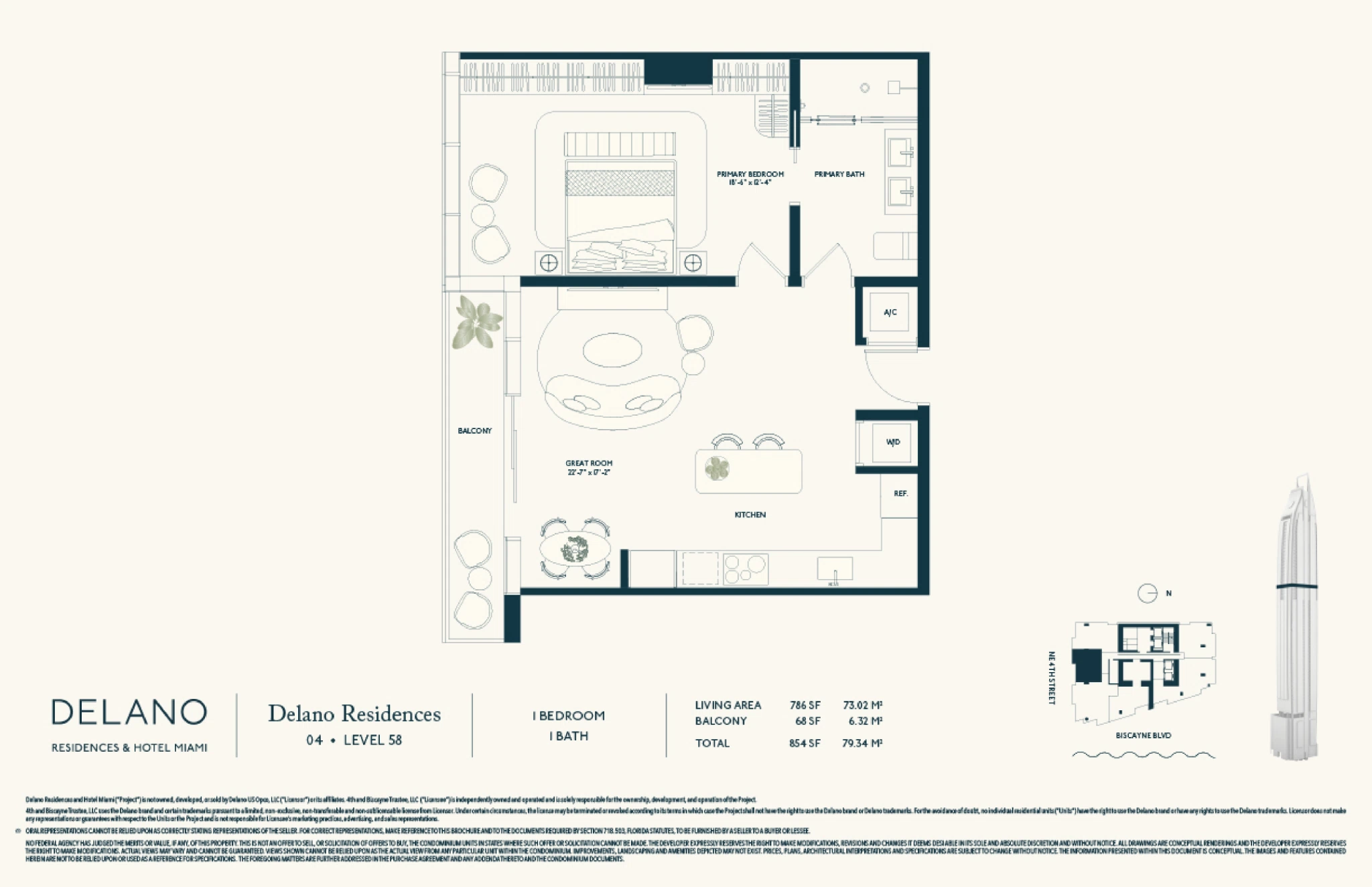 Delano Residences & Hotel Miami is not simply another luxury tower on the city skyline. It is a project with a strong hotel identity, a thoughtfully designed amenity program, a wide selection of residences, and a location in the center of one of Miami’s most dynamic districts.
