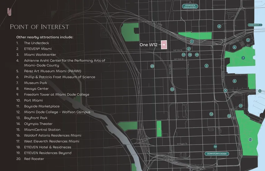 One West Twelve Residences Downtown Miami is strategically located in the vibrant heart of a vibrant city that embodies rich cultural heritage, glamorous style and modern appeal. Living here, you are among the city's elite, enjoying fantastic infrastructure, services and activities. Nearby you will find 60 historic buildings, 130 art galleries, top restaurants from culinary superstars, signature bars, shopping, entertainment centers and more.