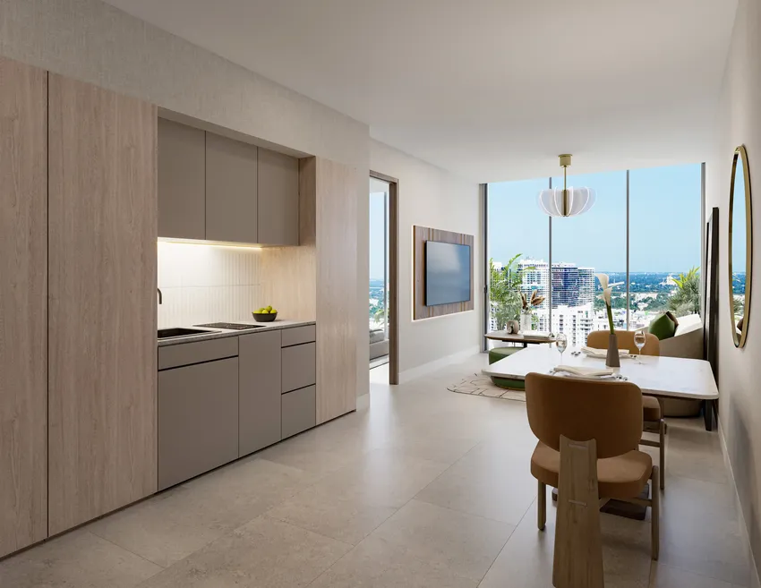 Residences at Edge House Miami are beautifully designed, decorated, and fully equipped with custom furniture, kitchen appliances, and European cabinets created by renowned interior decorator Adriana Hoyos. Select from impeccably appointed studios, one-bedroom, one-bedroom residences with a den, two-bedroom, and three-bedroom residences, with the possibility to split into two apartments with separate entrances.