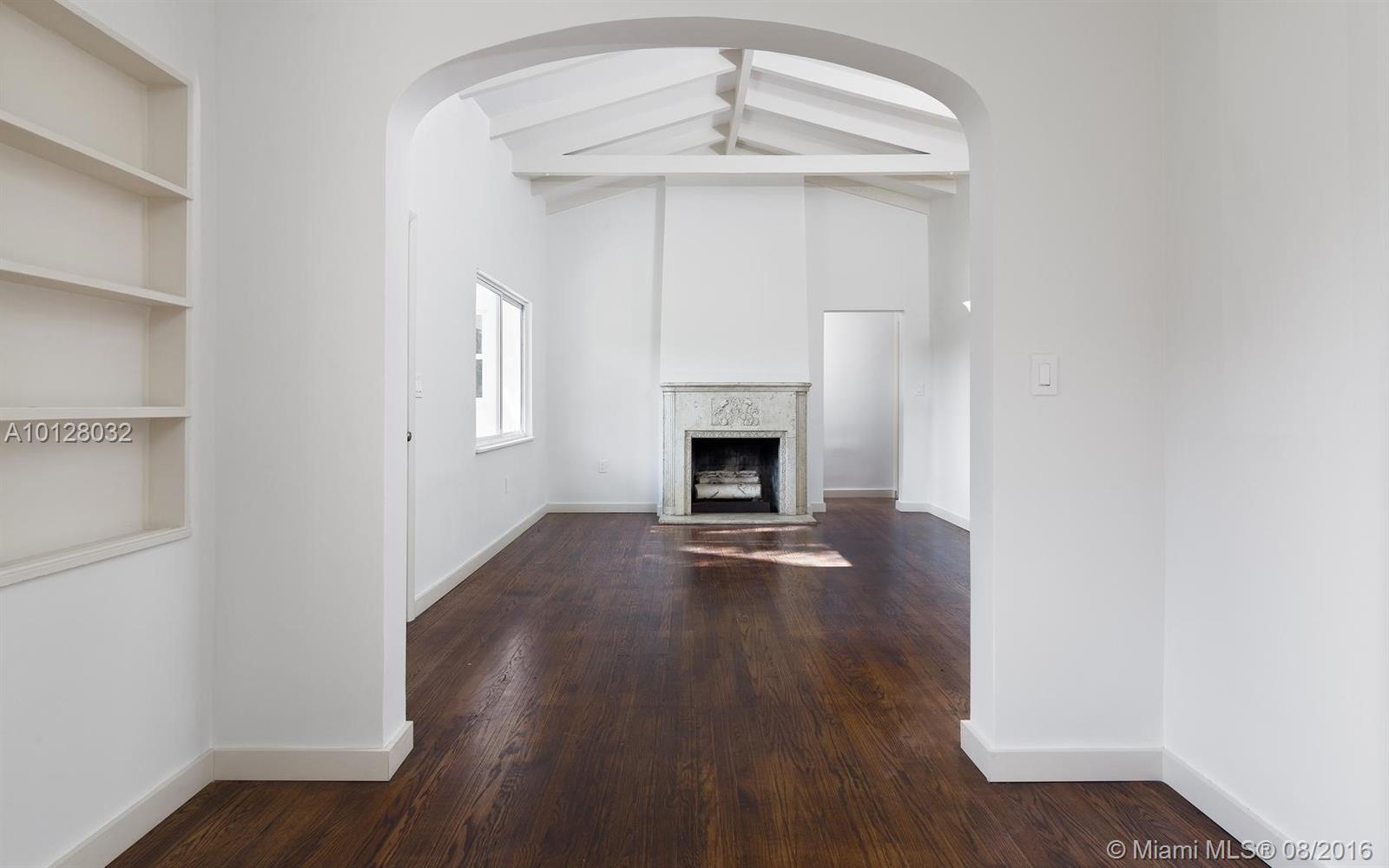 Completely renovated & detailed 2 bedroom, 1 bath home is situated on a raised corner lot centrally located in an excellent Miami Shores neighborhood. This 1939 home features open beam ceilings, arches, original oak flooring & a carved stone fireplace. Gourmet quartz kitchen with slate GE appliances & gas stove. The bathroom has floor to ceiling Italian marble & whirlpool tub. Attached 2-car garage with driveway off the alley includes new Samsung washer & dryer. Landscaping & patios in from & back yards.