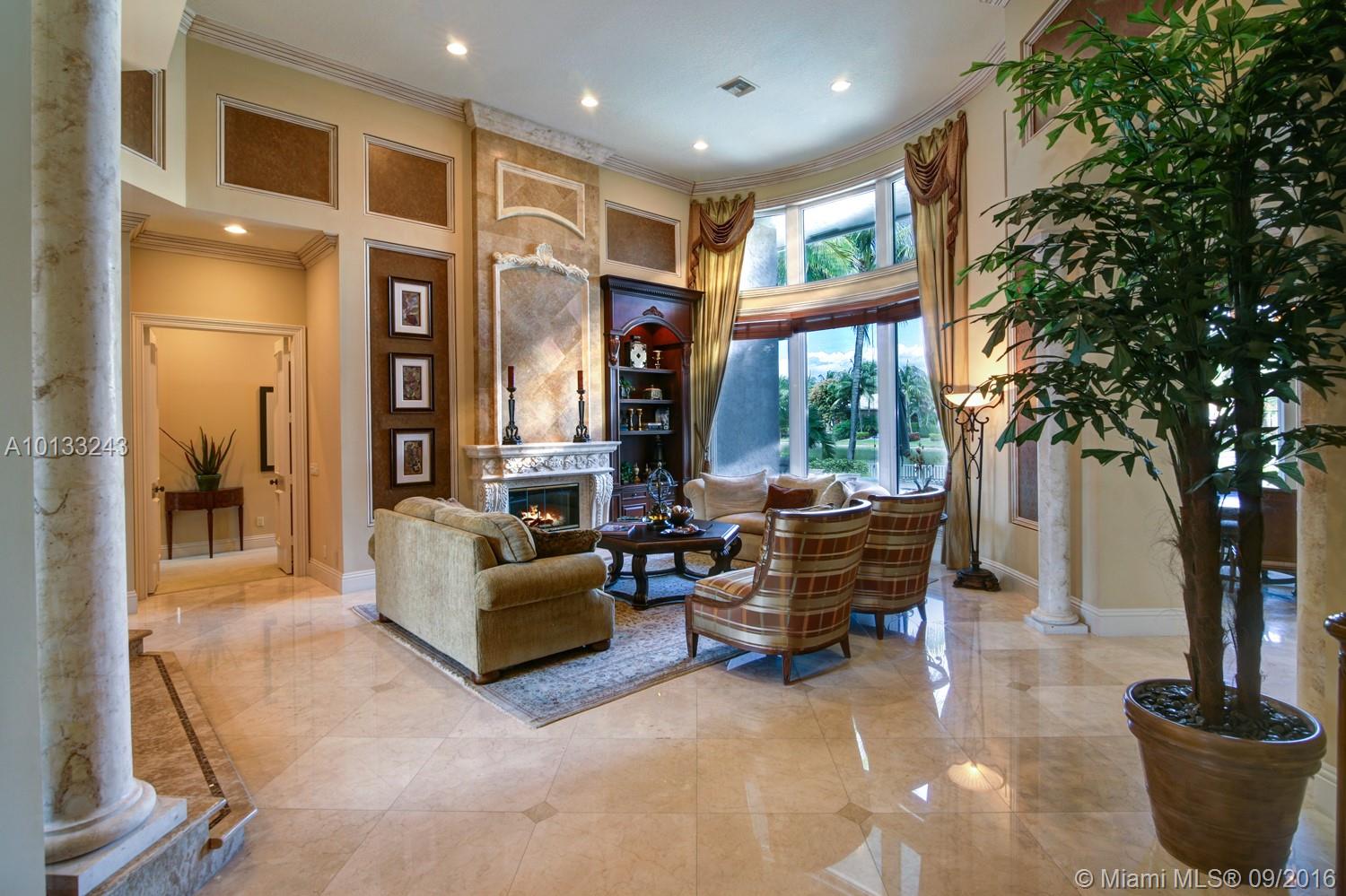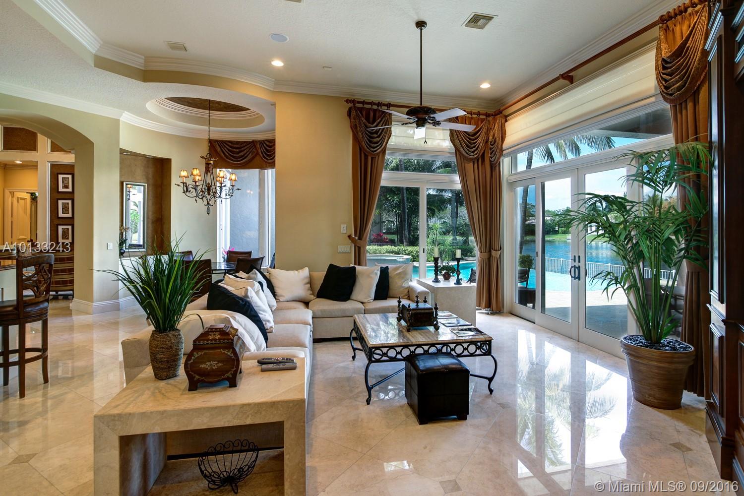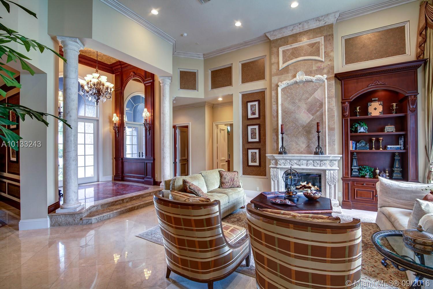 State of the art two story home located on a private waterfront cul-de-sac lot in the prestigious gated community Hawks Landing. This former model home has only been used as a second home and it looks brand new! 6 bedrooms, 6 1/2 bathrooms, a library, a chef's kitchen and an upstairs living room/loft area. Imported marble, exotic hardwoods and hurricane impact glass. Every room will astonish you with its unique touches. A vanishing edge pool and spa overlooks a water view. Must see!