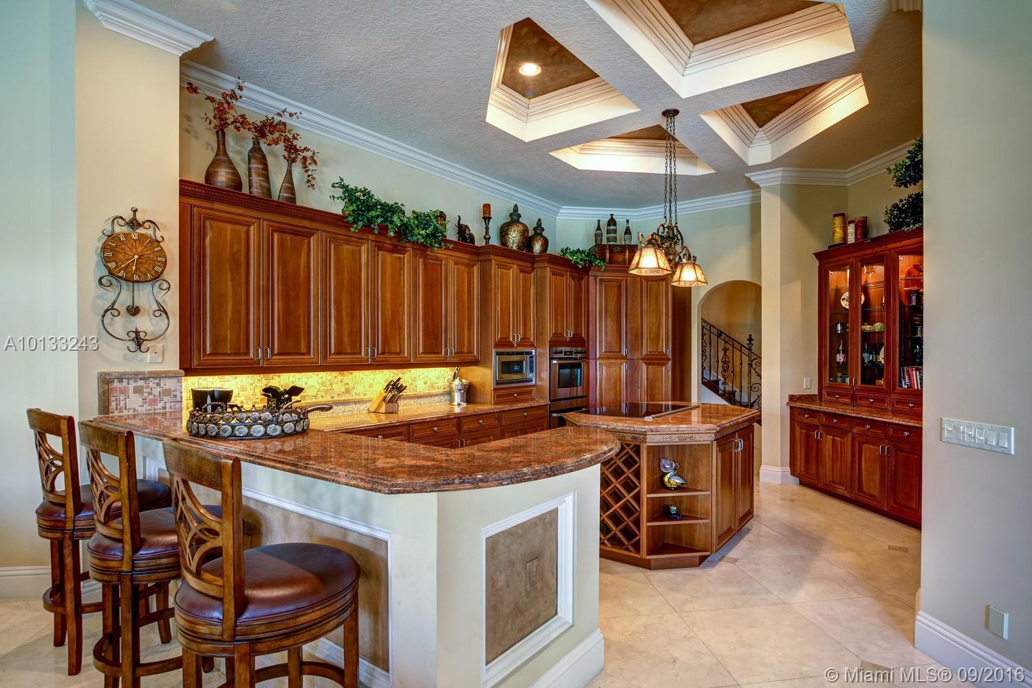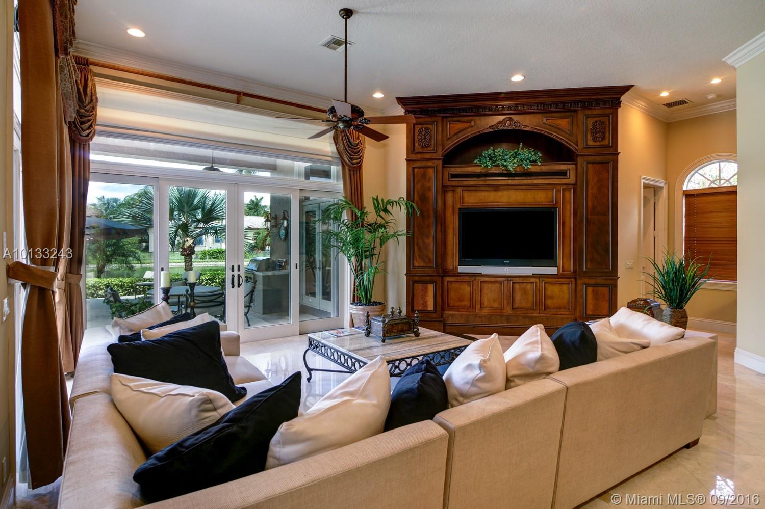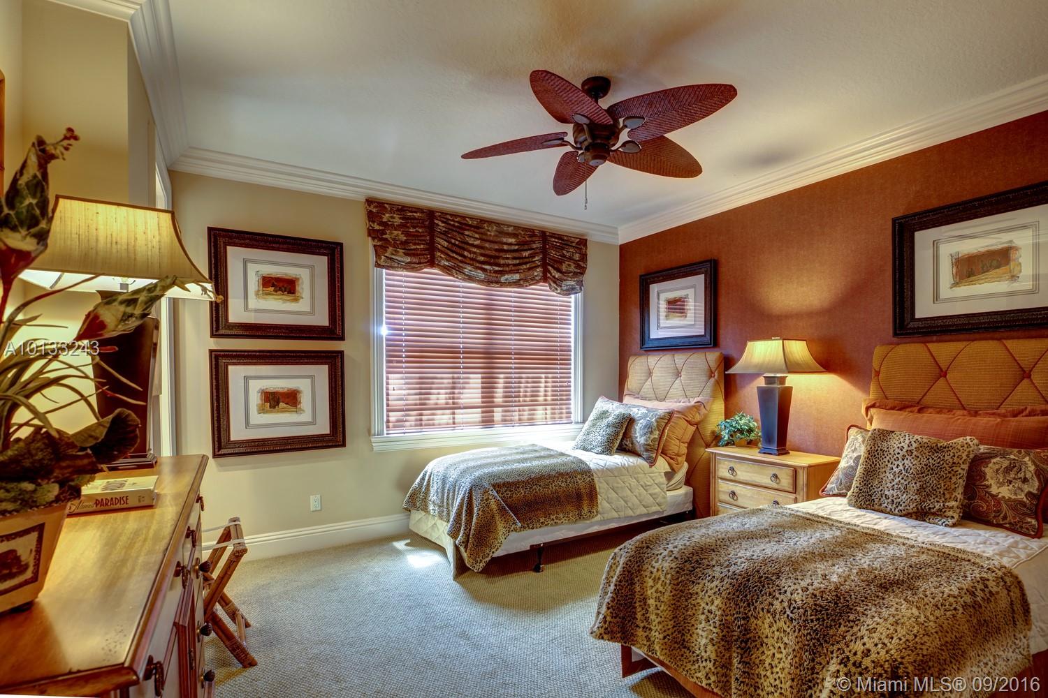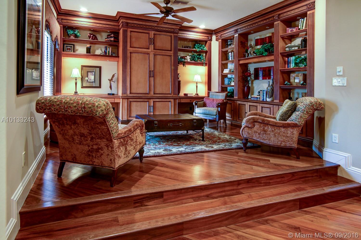 State of the art two story home located on a private waterfront cul-de-sac lot in the prestigious gated community Hawks Landing. This former model home has only been used as a second home and it looks brand new! 6 bedrooms, 6 1/2 bathrooms, a library, a chef's kitchen and an upstairs living room/loft area. Imported marble, exotic hardwoods and hurricane impact glass. Every room will astonish you with its unique touches. A vanishing edge pool and spa overlooks a water view. Must see!