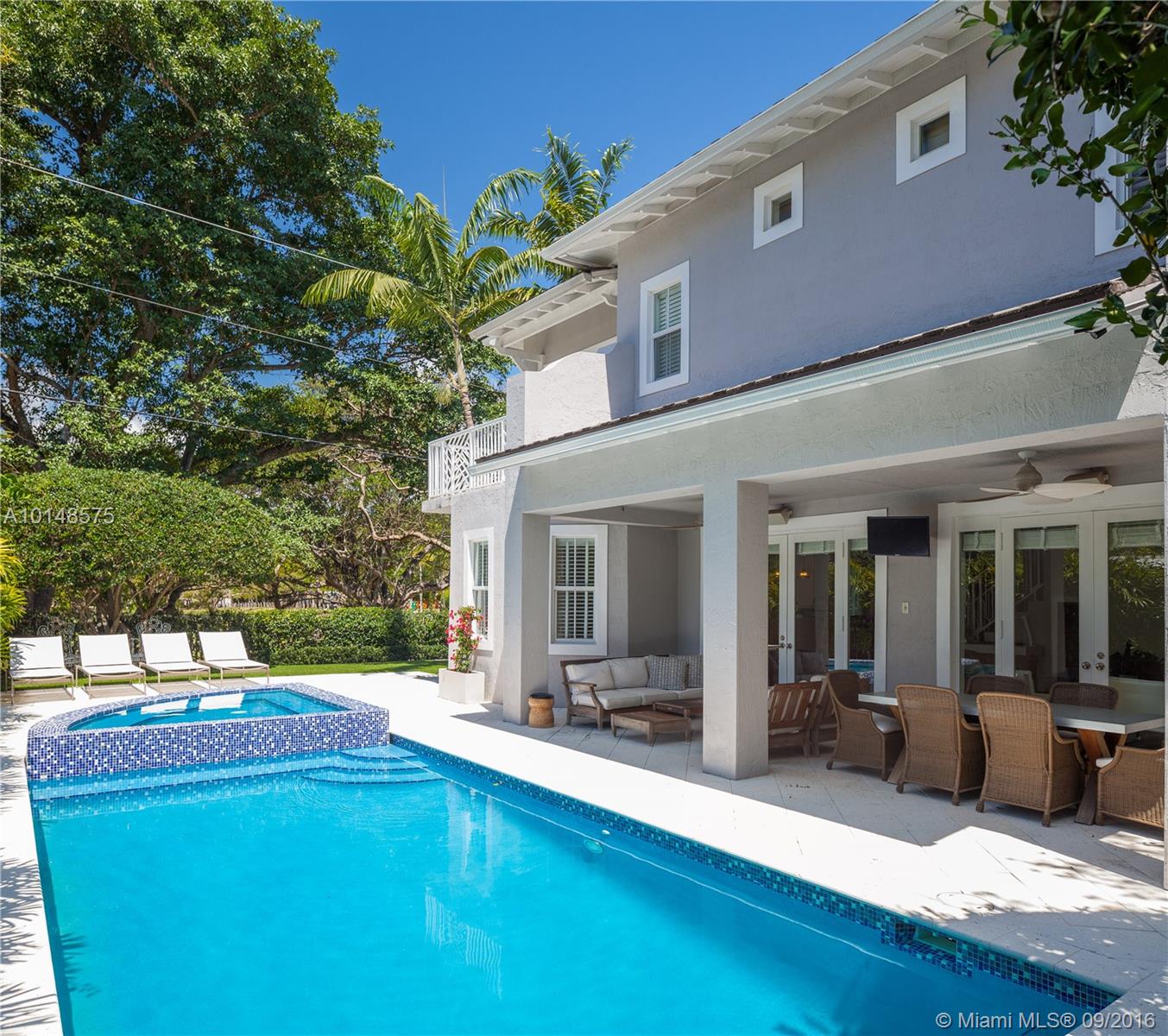 Coveted location next to Merrie Christmas Park in S. Coconut Grove is a stunning 5 bed/4 bath, magazine quality home on quiet tree lined street. Features limestone & Brazilian cherry wood floors, impact windows, 11' tray ceilings, custom cabinetry, & double crown moldings, gourmet kitchen w/professional quality appliances, heated pool and spa, laundry room, maid's quarters and garage. This spacious and sun filled home was designed w/family living & great entertaining in mind.