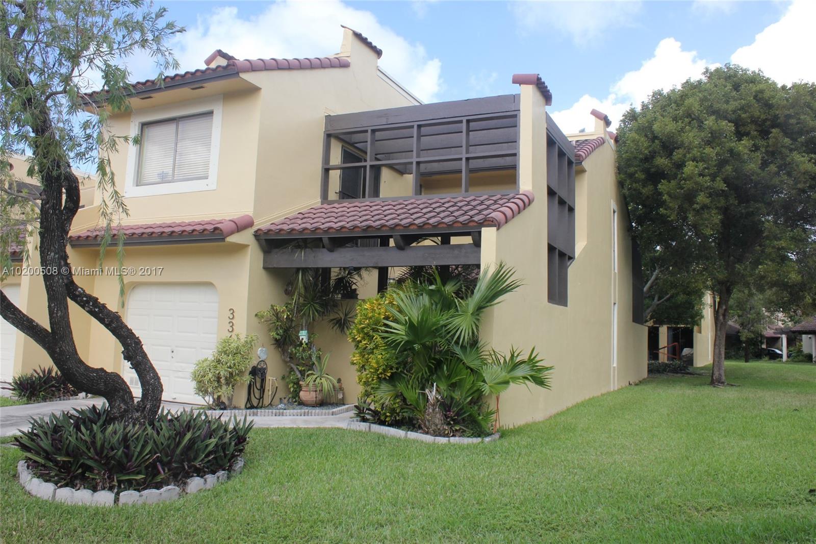 Spacious two story 3/2.5 townhome in gated Costa del Sol golf community, one of Doral's most desirable locations! Corner unit with screened back patio and golf course views. 3 Parking spaces in front of unit. New a/c and water heater 2015, new range & refrigerator, hurricane shutters. Maint. fee includes: insurance, roof, water, basic cable, 24-7 security patrol, pool, tennis, basketball courts, playground, club house, bicycling/jogging paths & more! Restaurant on premises. Will not last!