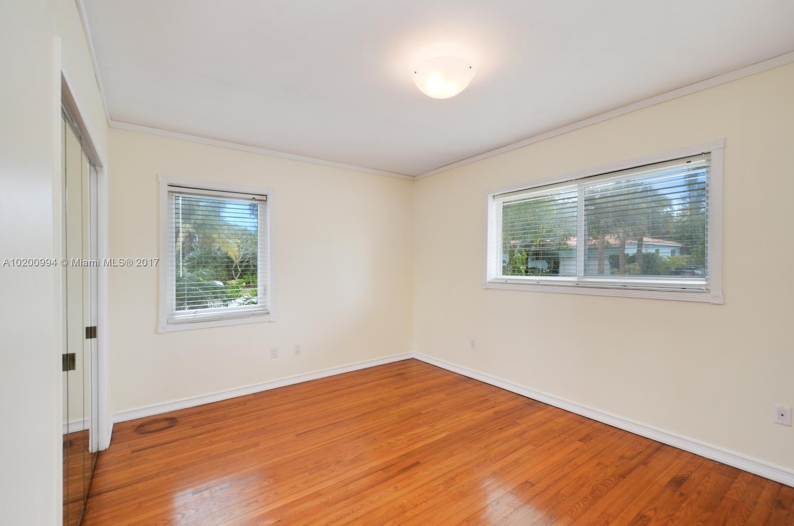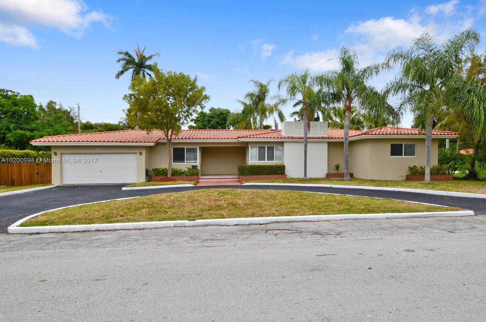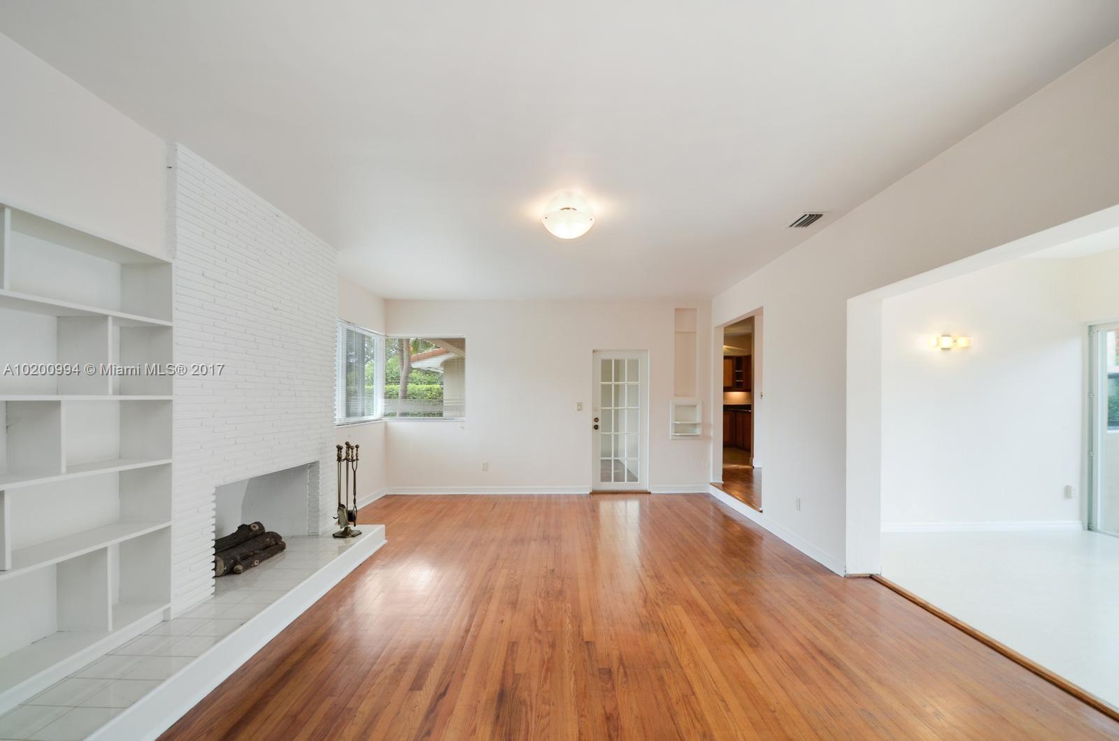 Smartly updated home features sleek mid-century lines & accents. Located in quiet pocket of Miami Shores on corner lot w/circular drive. Charming porch entry & large LR/FR w/wood burning fireplace & custom shelving. Sliding doors to patio & fully-fenced backyard. Completely remodeled kitchen & dramatic formal DR w/step up and wrap-around curved window wall. Split 2/1 private 1/1 off kitchen. Hardwood floors throughout. ALL impact windows/doors. Wide 2-car garage w/laundry, alarm system, newer septic.