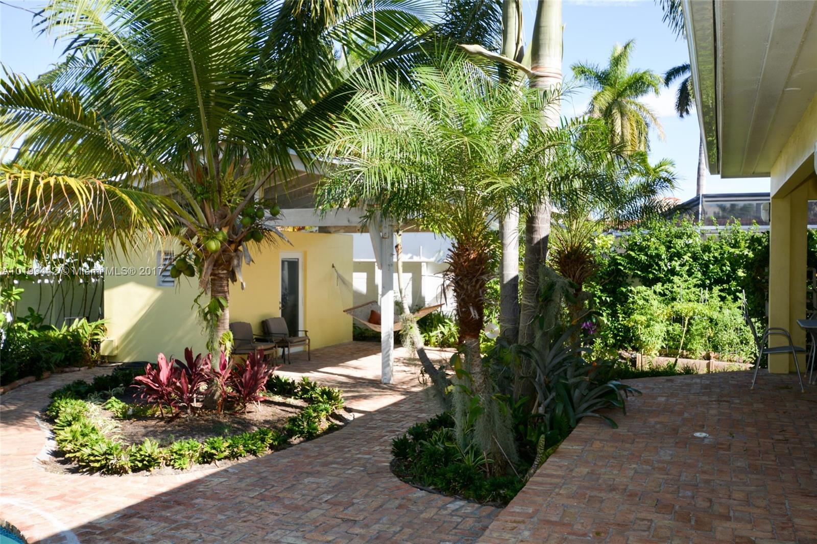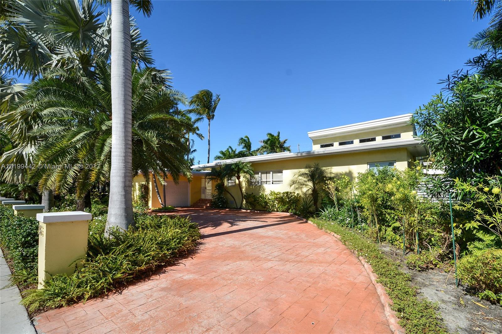 2 Blocks from the beach. Mid-Century Modern Home was remodeled in 2011, almost 3,000 sq. ft on a double lot. Total of 4 BR & 3.5 BA, 1 Car Garage. Spacious kitchen w/wood cabinets, granite countertops. High Vaulted Ceilings. Travertine marble floors. 2 Master suites 1 w/walk in closet. Chicago Brick circle driveway & back patio. Pool w/waterfall. Detached Cabana includes the 1/2 bathroom. Newer roof. Glass inside open patio. Enclosed Fenced backyard has Organic garden with Orchids, fruit & Palm trees.