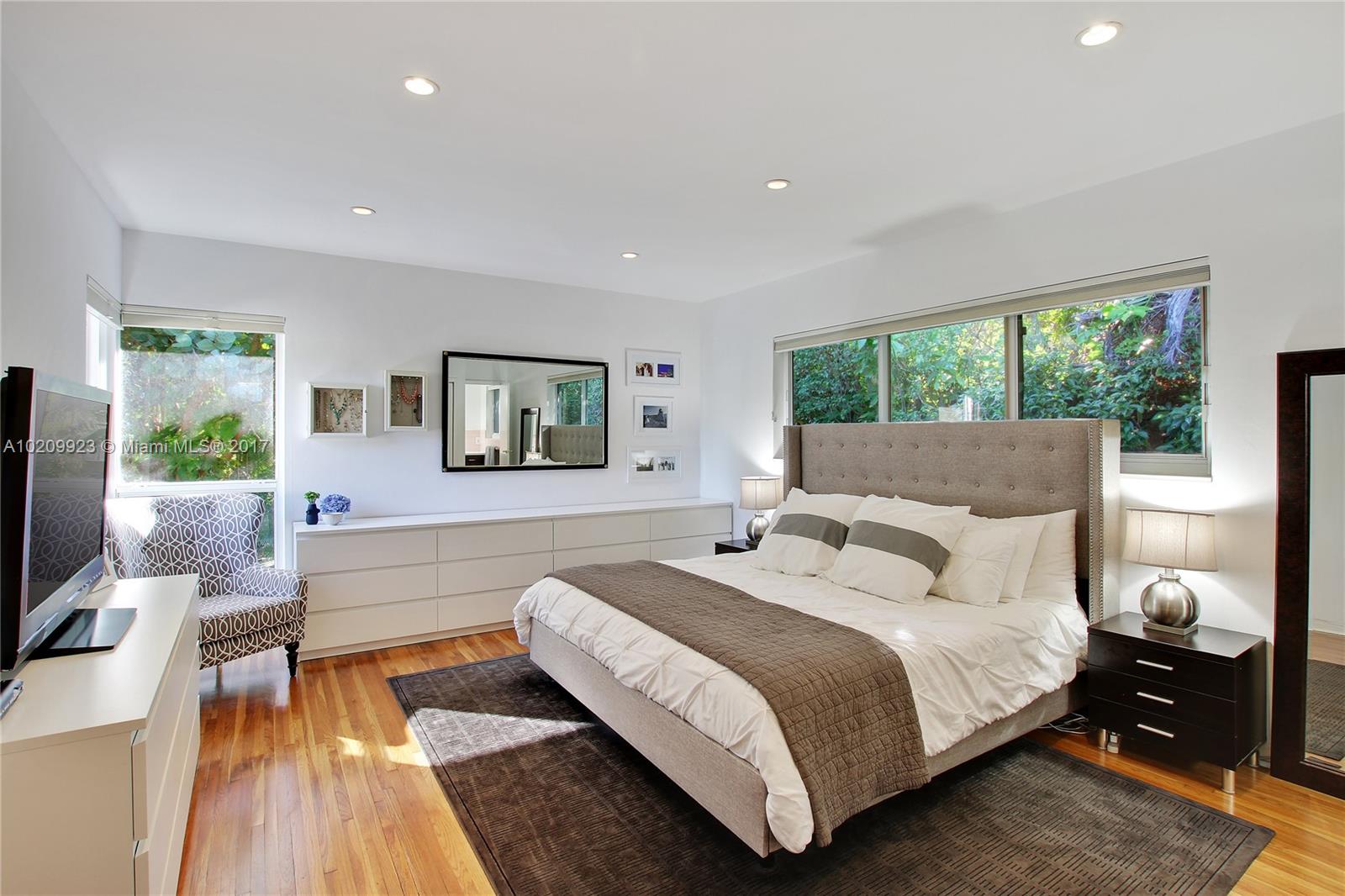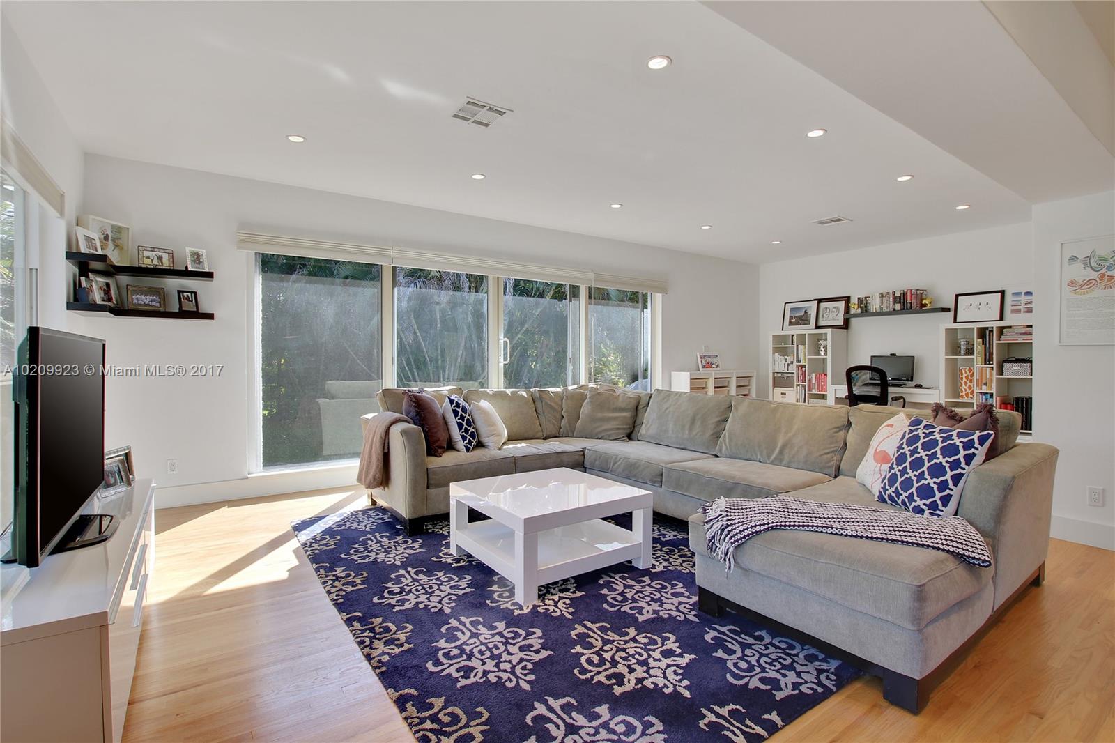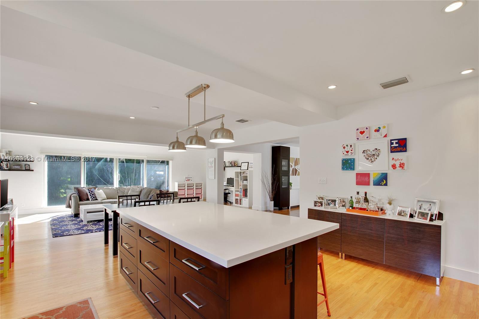 Miami Shores home only half block from the bay! Open floor plan living room, dining room, family room and kitchen w/ oak hardwood floors throughout the house. Stunning remodeled kitchen w/ 8ft center island, quartz counters, double wall oven and glass-top stove. Impact windows provide amazing natural light throughout the house. 3 Large beds w/ custom closets and 2 full baths. 2 car garage with laundry & a half bath. Large patio and private yard w/ room for a pool. New roof being installed as of March