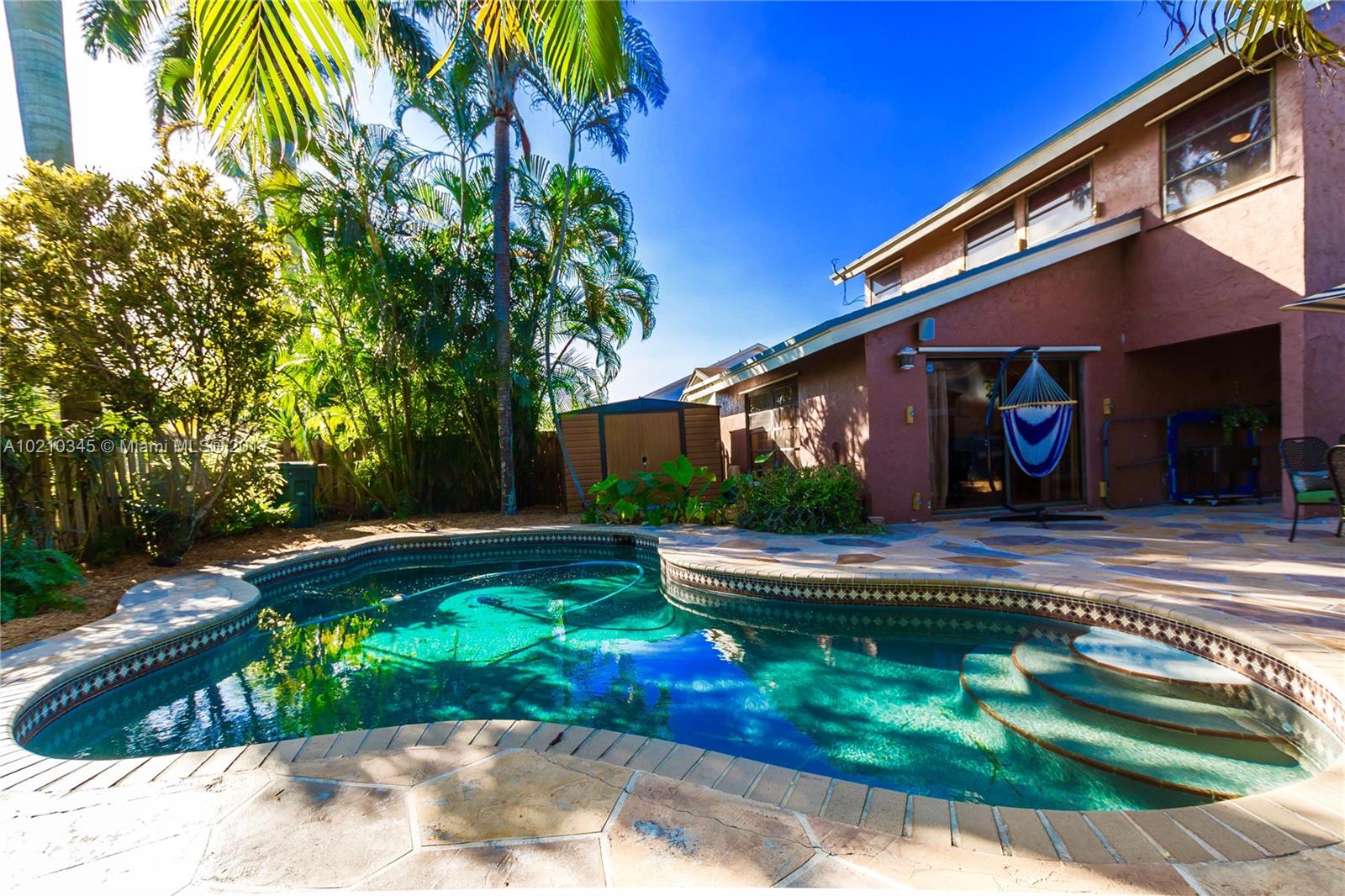 Large home in the community -original from the developer-. Beautiful and spacious, lots of light. Ideal for entertaining, private backyard with pool, extended family room, new kitchen, recently remodeled bathrooms, high ceilings in living area, plenty of space for a large family or the ones who enjoy living surrounded by nature, parks and great schools. The original model was extended through the garage and open porch to enclose and convert them in inside living spaces. Parking available in driveway