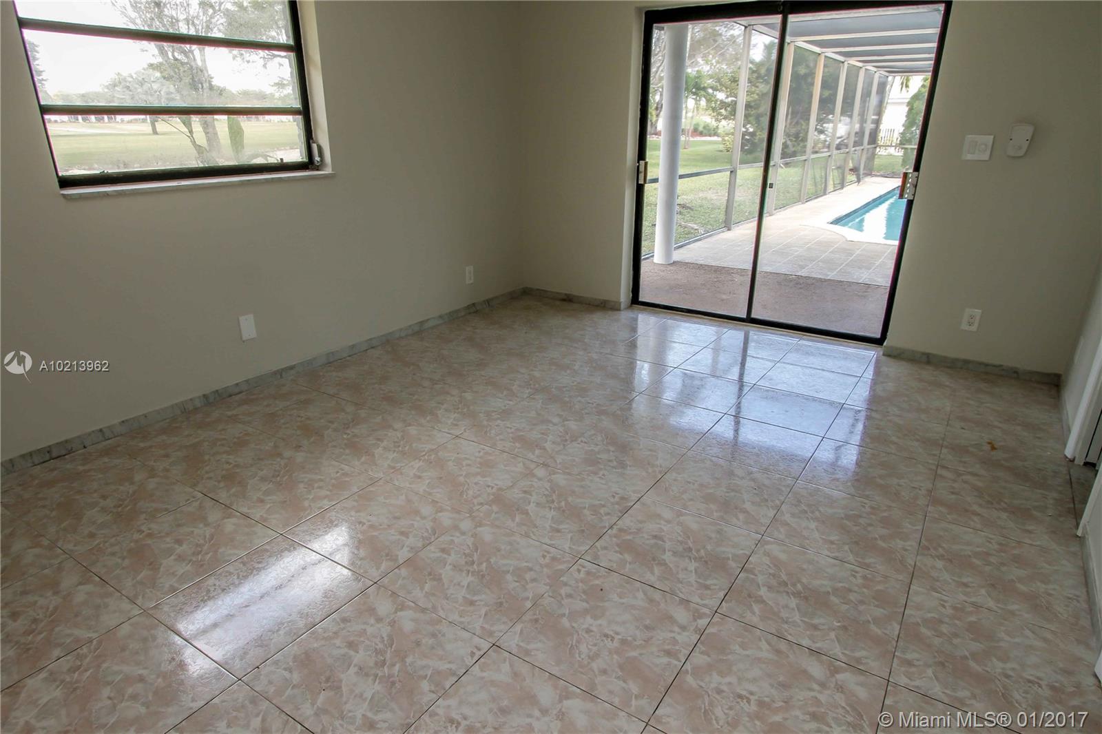 Live on the golf course. Beautiful pool home located in Coral Springs Country Club directly on the golf course on a quiet cul-de-sac. The home features a large screened patio with pool, spacious layout with four bedrooms and 3 bathroom, open kitchen with window to the pool area, formal living room and dining room, master bath with roman tub and shower. New garage door, appliances, AC and water heaters.The entire house has been painted inside and is waiting for your TLC.