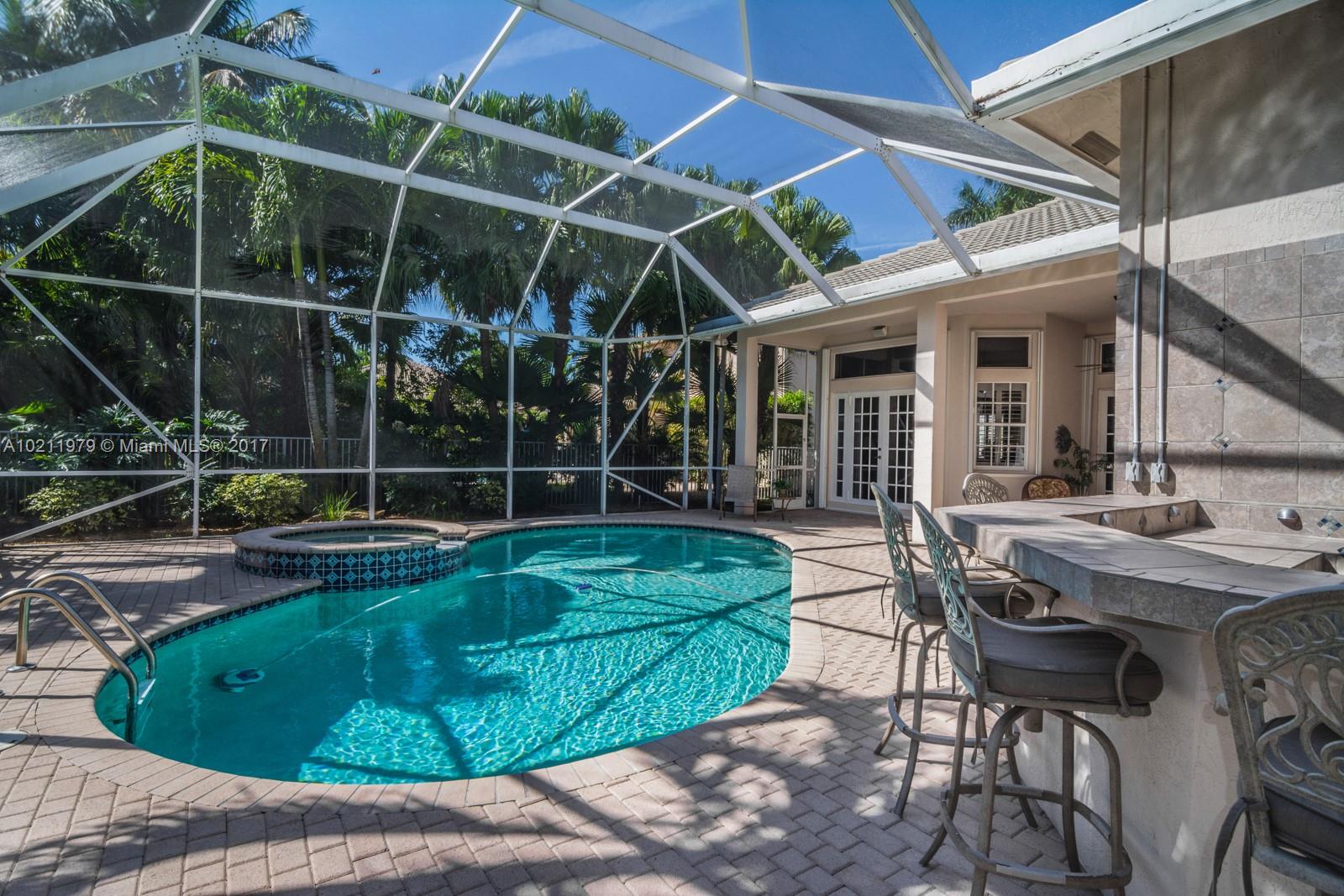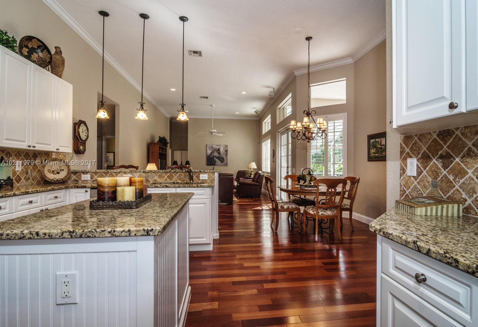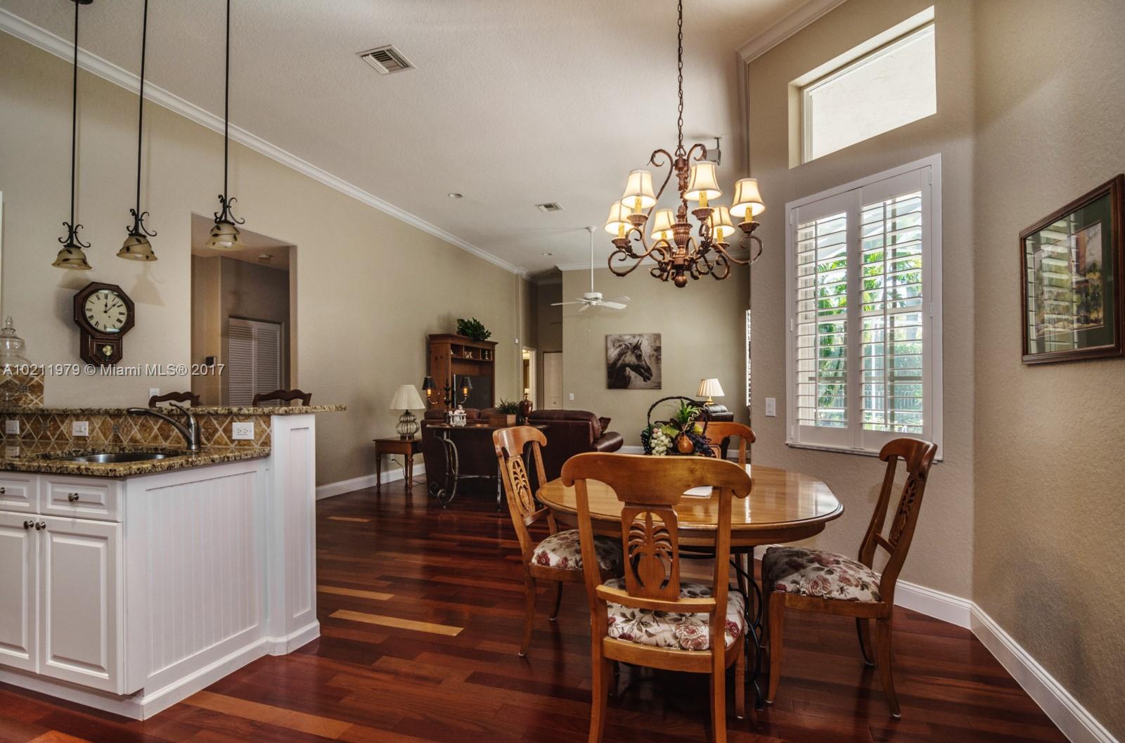 Exquisite curb appeal with lush landscaping.Walking distance to the community park.Quaint paver porch welcomes you. Enter via glass front doors and feel the elegance. Warm wood flooring throughout living areas. Super-sized master bedrooms w/volume ceilings & master bath suite.White kitchen w/ granite countertops, tumbled stone backsplash, stainless steel appliances.Backyard paradise w/ screened heated pool/spa, summer kitchen, hedged for privacy.Freshly painted,Plantation shutters,full accordions,GORGEOUS