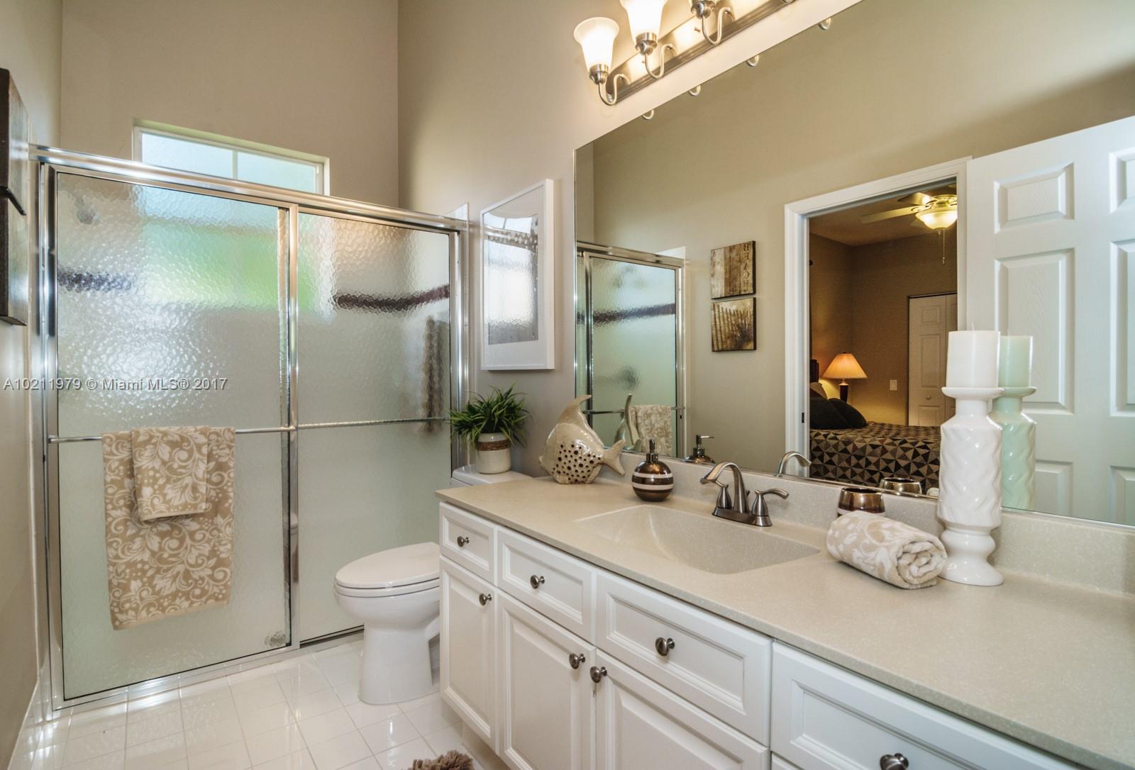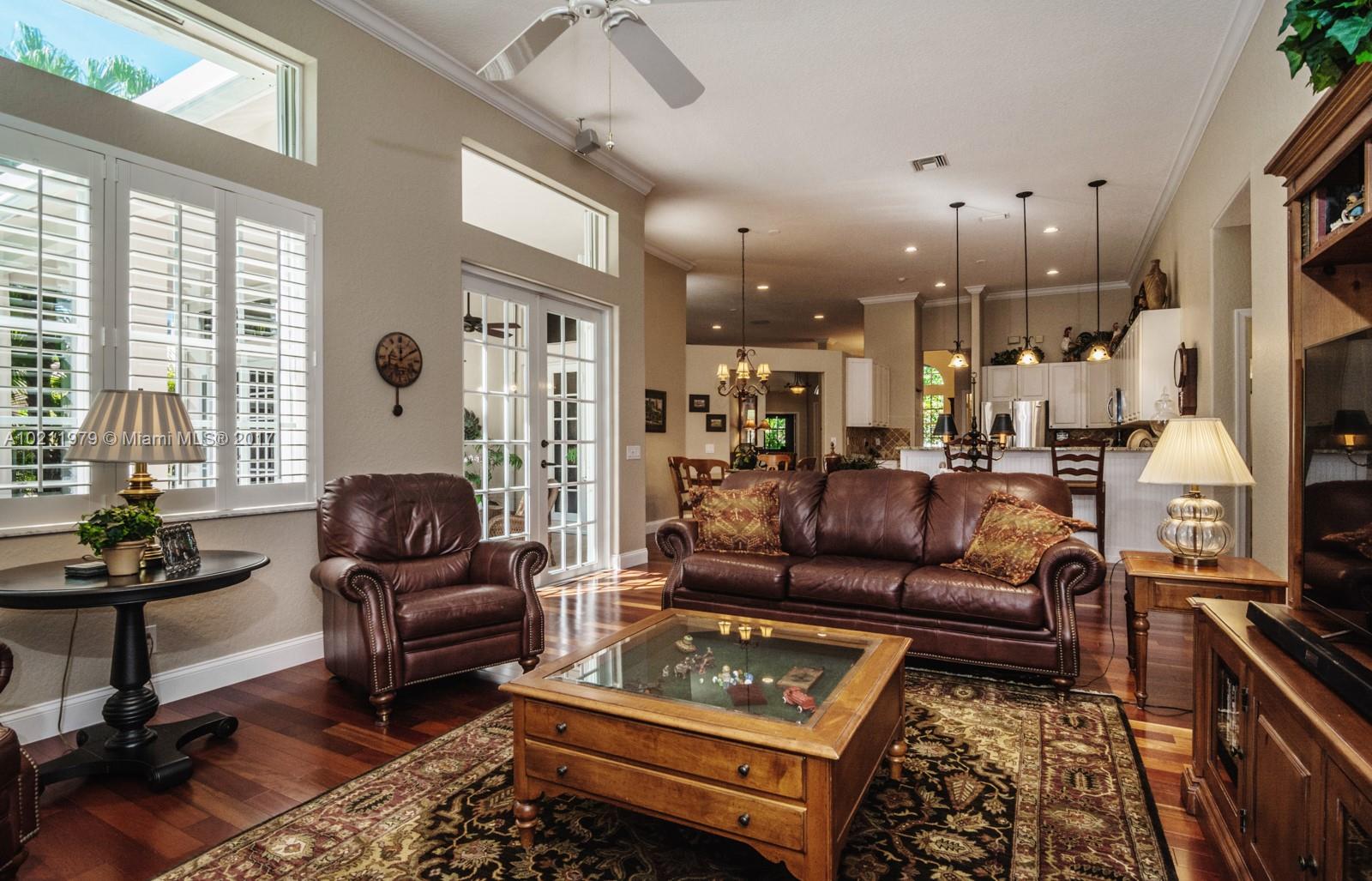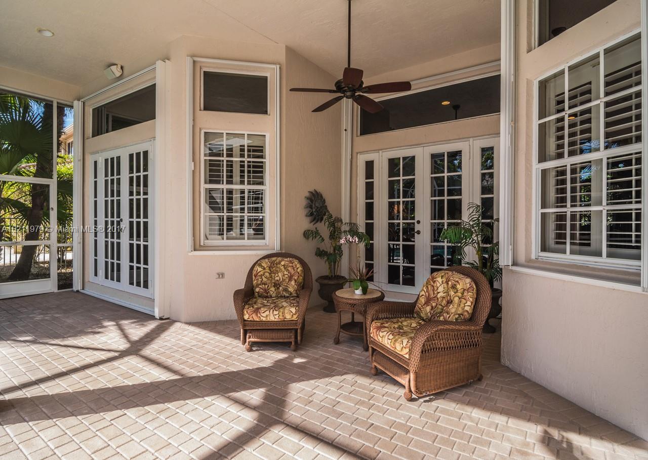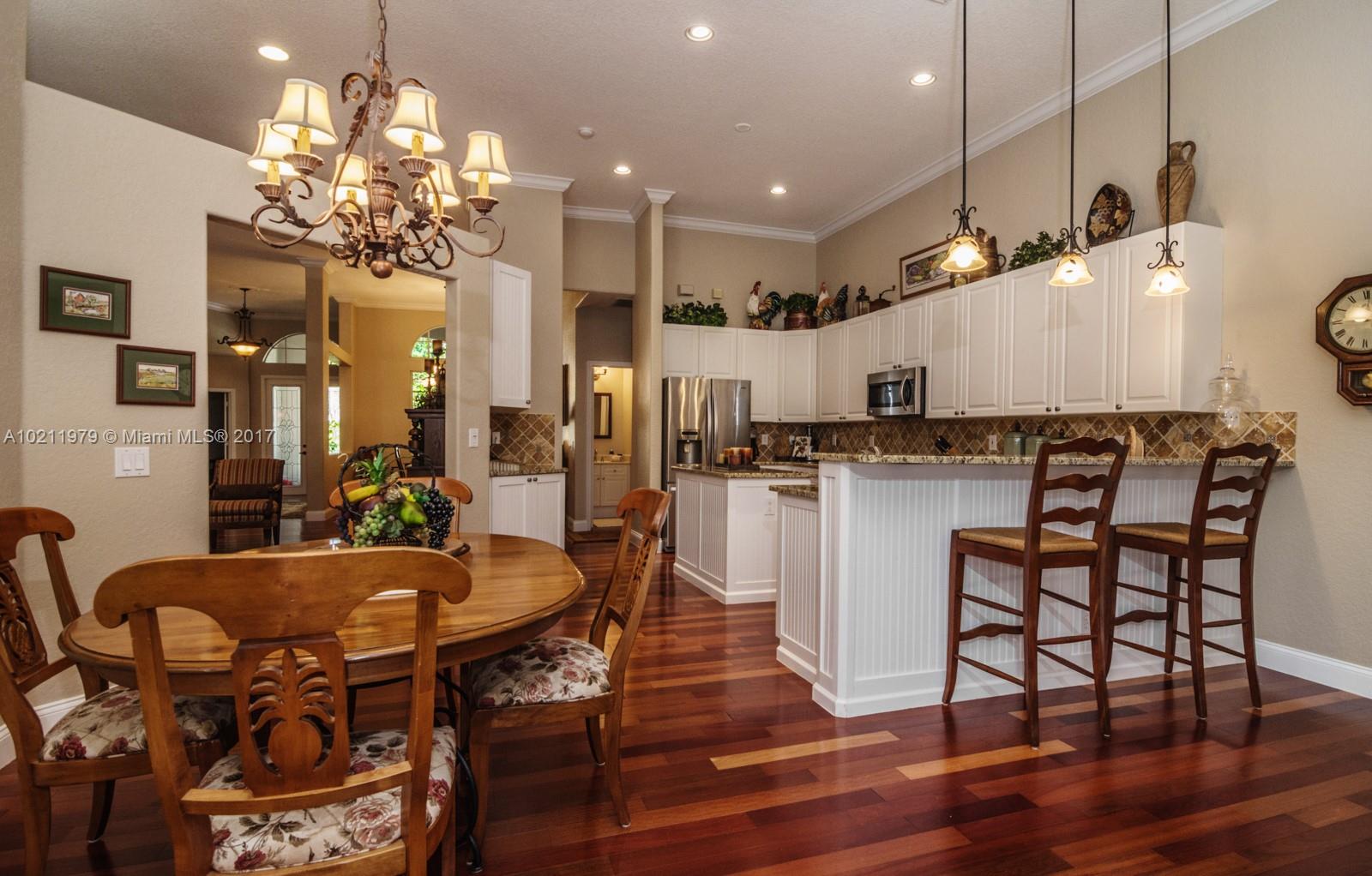 Exquisite curb appeal with lush landscaping.Walking distance to the community park.Quaint paver porch welcomes you. Enter via glass front doors and feel the elegance. Warm wood flooring throughout living areas. Super-sized master bedrooms w/volume ceilings & master bath suite.White kitchen w/ granite countertops, tumbled stone backsplash, stainless steel appliances.Backyard paradise w/ screened heated pool/spa, summer kitchen, hedged for privacy.Freshly painted,Plantation shutters,full accordions,GORGEOUS