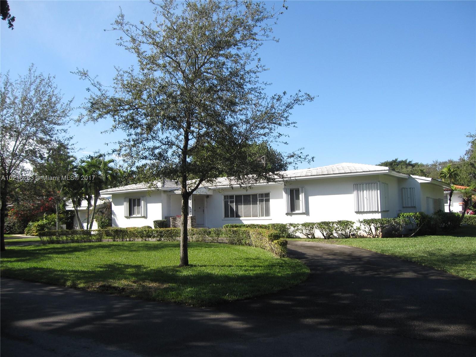 SUPERB CORAL GABLES CORNER LOCATION ON AN 11,330 SF LOT. MAINTAINED, ORIGINAL CONDITION, MID-CENTURY HOME WITH NEW ROOF IN 2014, NEW AC IN 2015. GREAT FLOOR PLAN FOR UPDATING OR RENOVATING W/FORMAL LIVING AND DINING ROOMS, FAMILY ROOM WITH VAULTED WOOD BEAMED CEILING, OAK FLOORS, SPLIT FLOOR PLAN, AND 2 CAR GARAGE W/GARDENER'S HALF BATH. ALSO A GREAT OPPORTUNITY TO RAZE AND BUILD NEW.