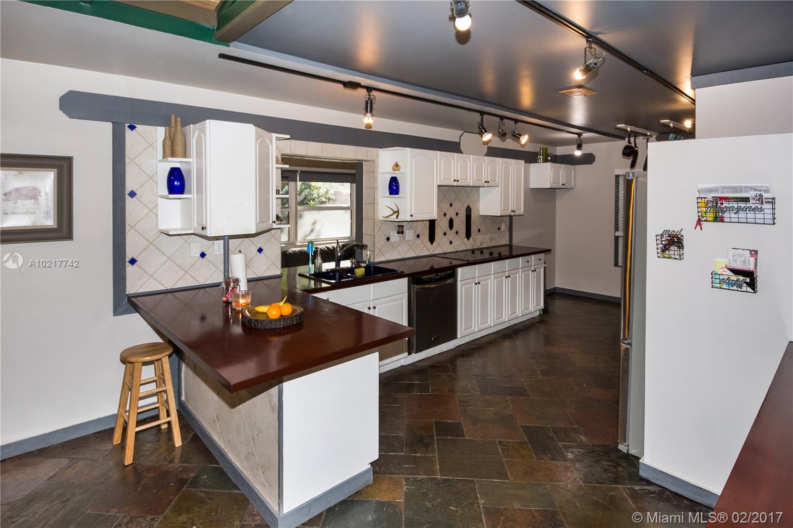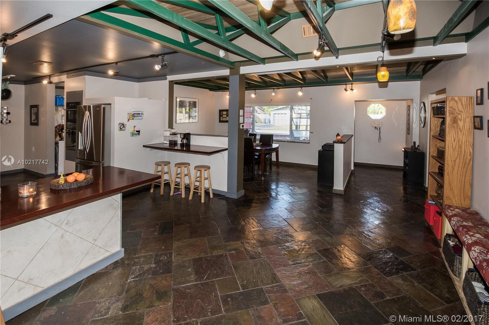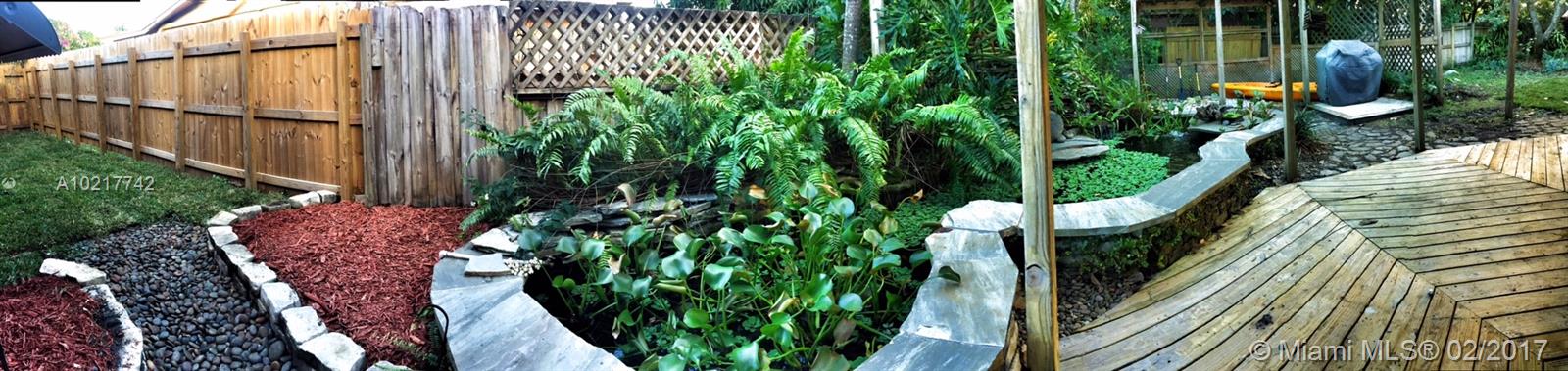 Beautiful and Stylish 2-Bedroom Home in a Quiet Residential Community. Energy efficient features include LED track lighting, high-tech appliances and tank-less water heater. Stylish ceiling with exposed truss and tongue/groove white cedar. Slate tile floors have been professionally cleaned, sealed and glossed. Water filter system for the whole house!!! Completely fenced. Serene backyard with a 1500-gallon Koi fish pond, lush trees and fruit tree (mango tree.) Impact windows. Newer roof. A must see!!