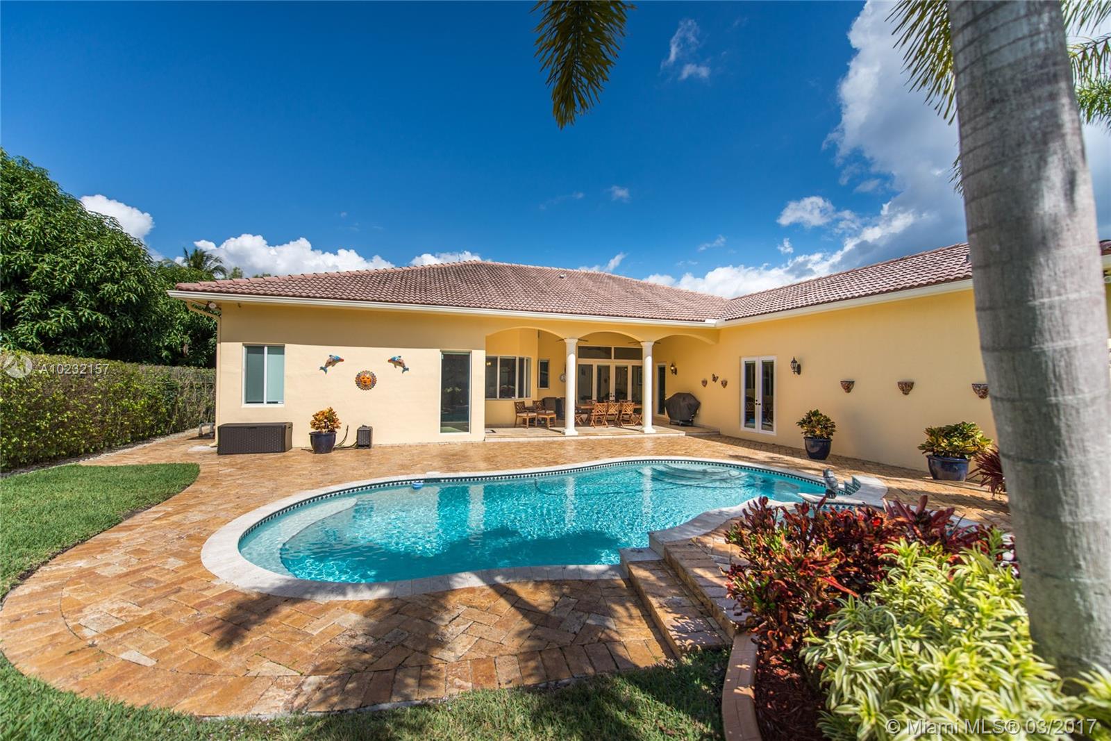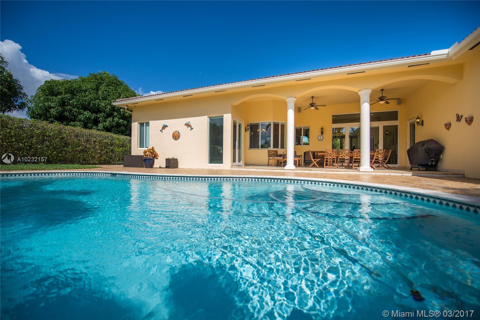 Tropical Delight! Beautiful newer construction, one-story 5/4 home, conveniently located in the heart of Pinecrest. Built in 2007, bright & spacious home offers all the perks of new construction; impact windows/drs, volume ceilings & functional design. Enjoy beautiful views of the sparkling pool & manicured yard from living, kitchen, & family rm. Large gourmet eat-in kitchen opens to family room, perfect for entertaining!Luxurious master bed suite w/his/hers closets & spa like bath. 2 CG. & 4,044 adj. sf.