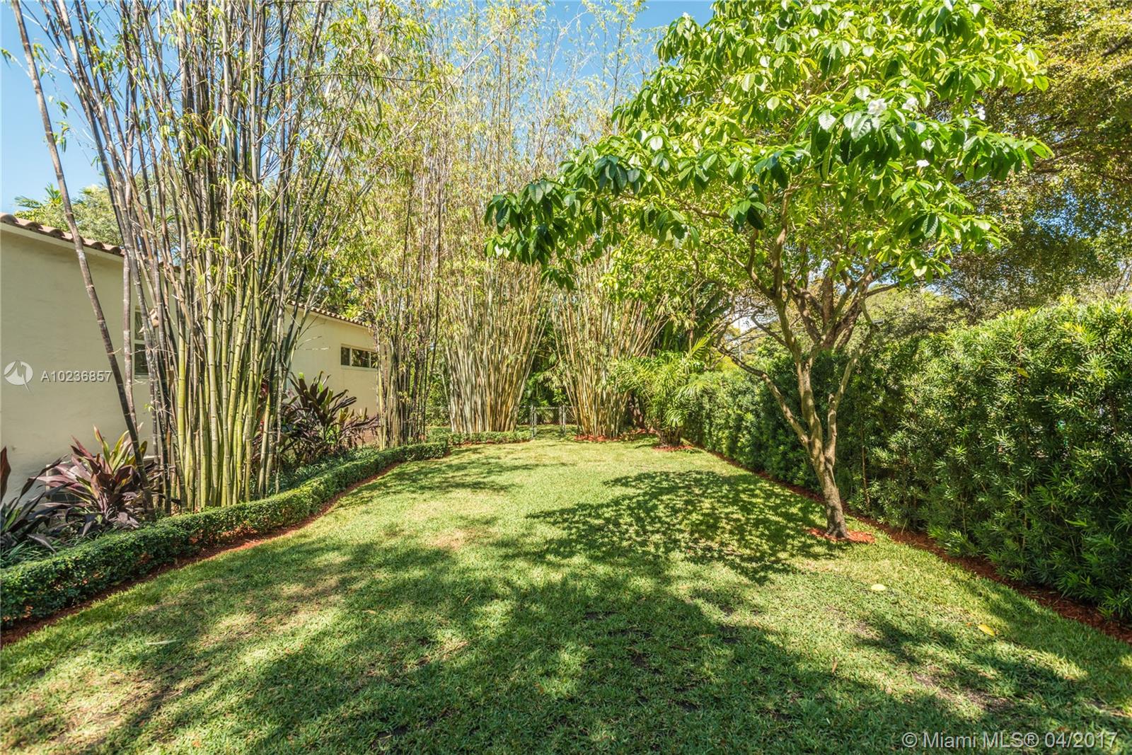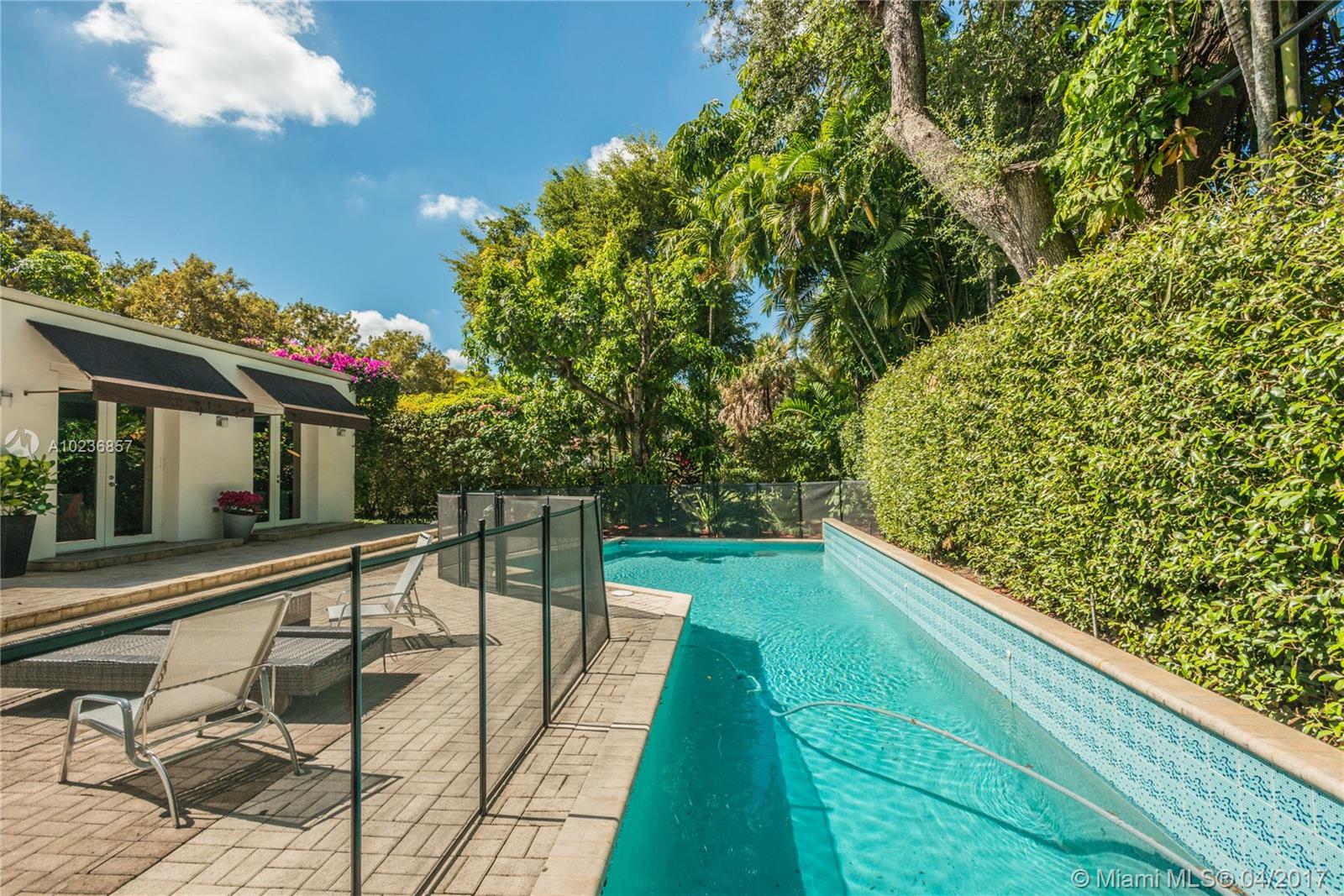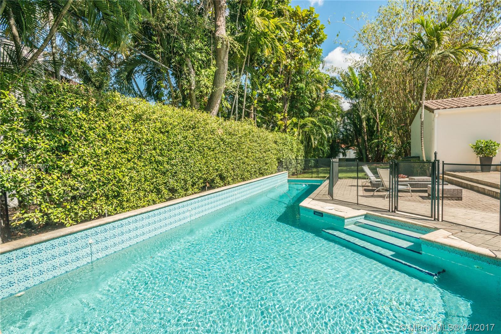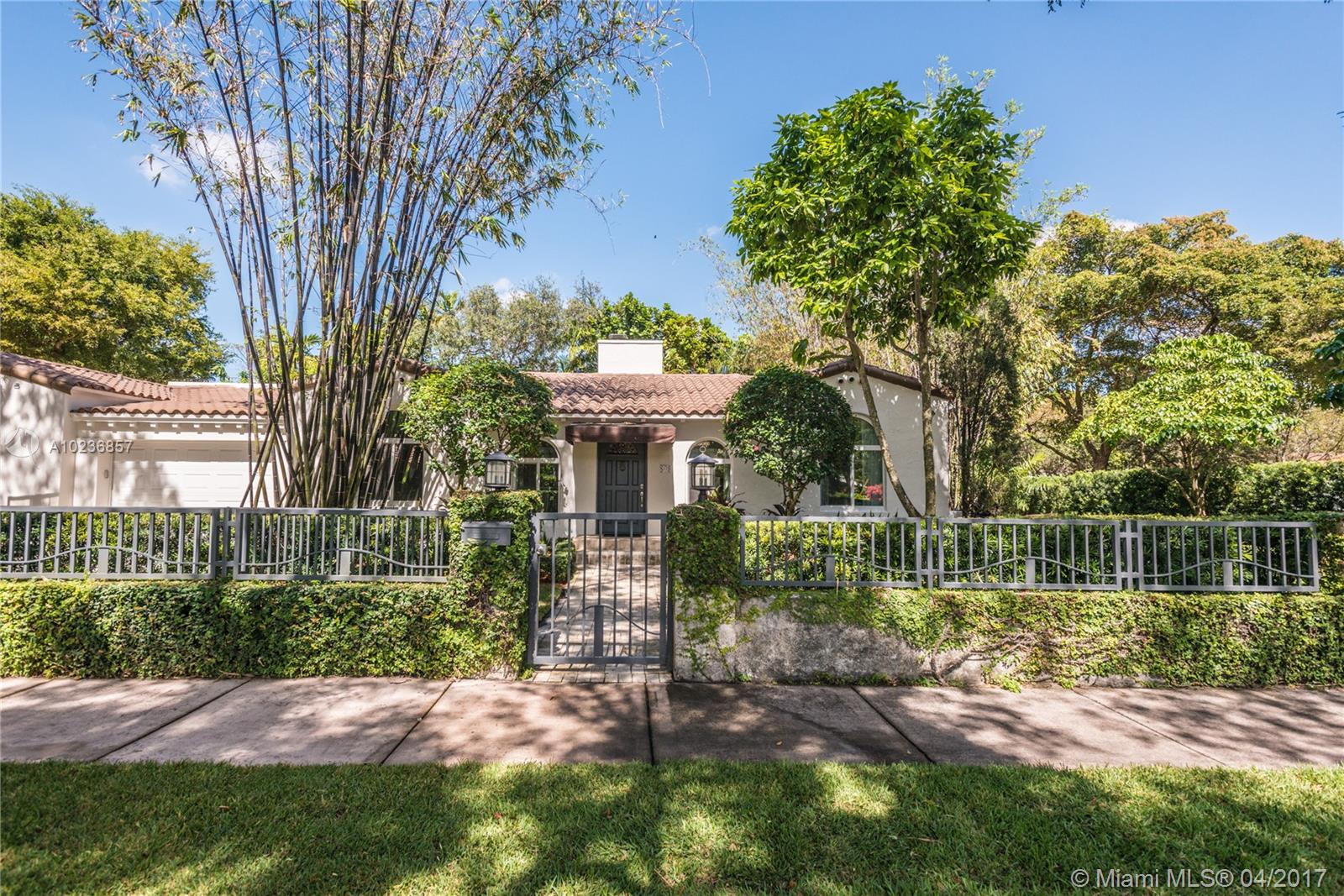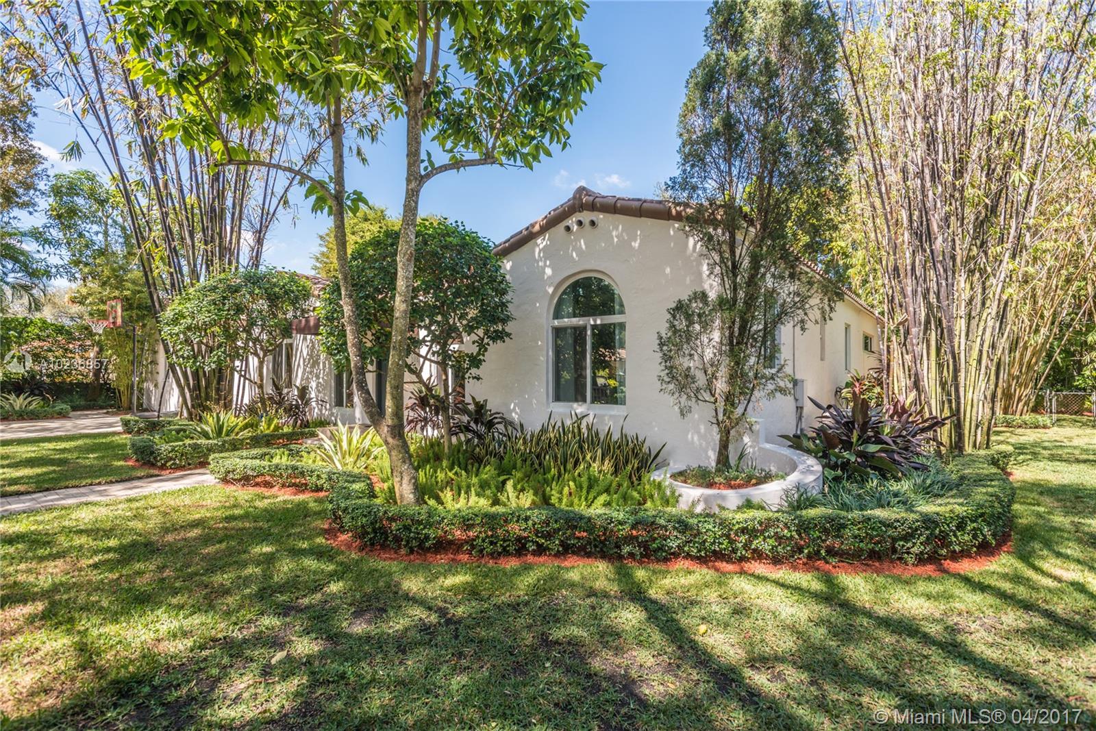 On a lush tree lined street in exclusive city of Coral Gables, modern elegance meets classic style. This charming home is surrounded by tropical landscaping & sits on an oversized 13,500 sq. ft. lot with pool & large patio, perfect for entertaining. This residence features vaulted ceilings, wood flooring, lots of light, internet wiring throughout, built in storage & computer nook, stainless steel appliances, ample storage, laundry area, new driveway with gate, spacious open kitchen & formal dinning room.