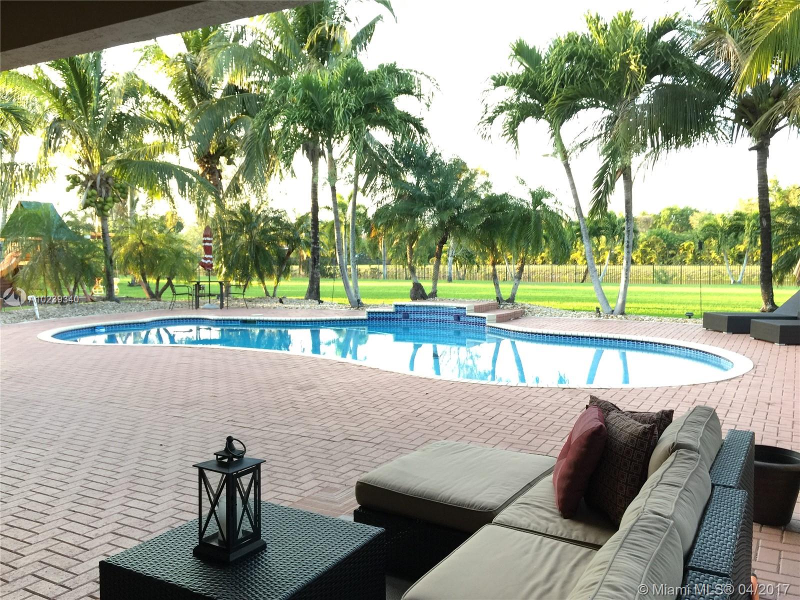 Imagination Farms is one of Davie's outstanding communities. On an acre + of land and the north end of the community, home backs to an equestrian trail; everyday the magnificent horses come by. The home features 12' ceilings, is flooded with natural light, has an open floor plan and split bedrooms. Kitchen has new stainless appliances and granite tops. Front doors and cabana bath door are impact glass. Landscaping frames the oversized pool and a large covered patio make outdoor entertaining a delight.