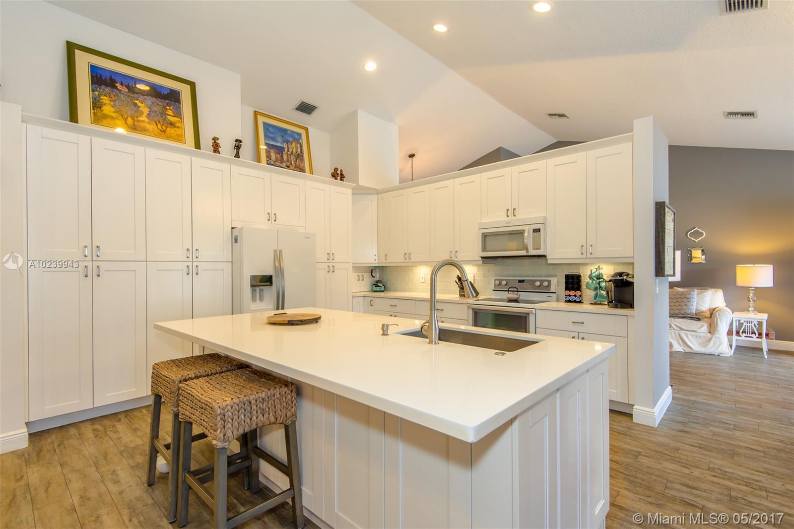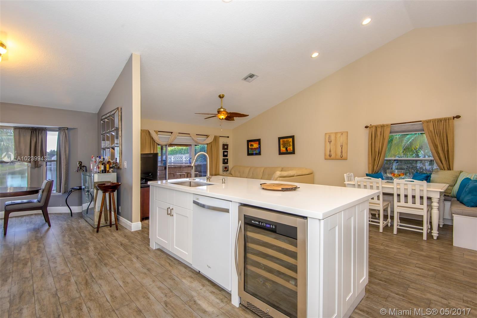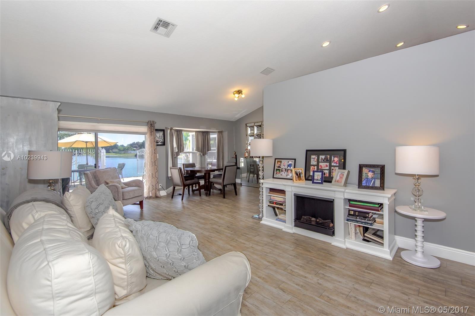 REDUCED! A-Rated Cooper City schools. Stylish, Family Friendly Waterfront in Cooper City! Dream kitchen All new white 42" cabinets with soft close hinges, quartz counters, Whirlpool's newest line: White Stainless Steel appliances incl a wine chiller; two pantries with pull-out drawers. Floors done with wood laminate in the BRs and porcelain wood grain tile in the living areas. Two bay windows, one with window seats (did someone say storage?) Laundry room converted into full-sized dream closet/dressing room. Best lake view in development from nearly every room. Screened porch w/bar for entertaining, completely fenced w separate dog run. Roof replaced in 2007.