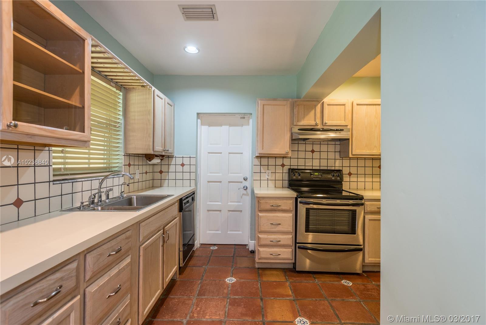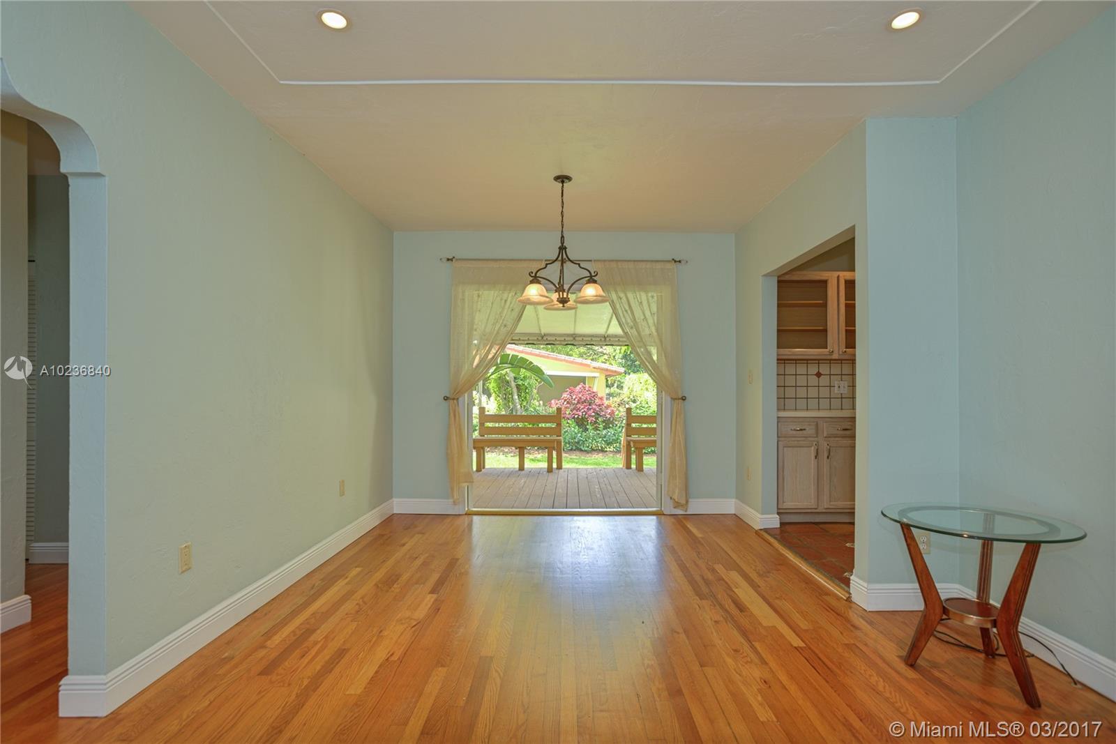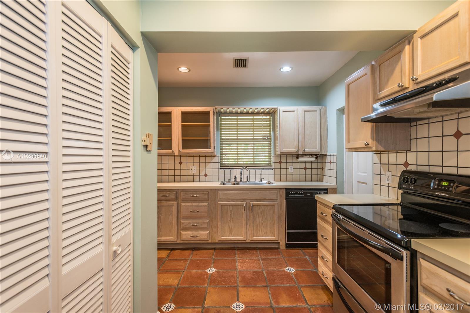 N. Gables gem on quiet & picturesque street, with ample L-shaped kitchen, good layout, covered back patio for outdoor entertaining or overflow room for kids to play. Beautifully maintained original features i.e. hardwood floors, stone fireplace, architectural arches, high ceilings, recessed lights, 1 car garage, barrel tile roof from 2006 w/many years of life. Recent updates are new wood deck, sprinkler system w/timer, new washer/dryer, recently tented, storm panels, fenced yard, alarm. Great schools!