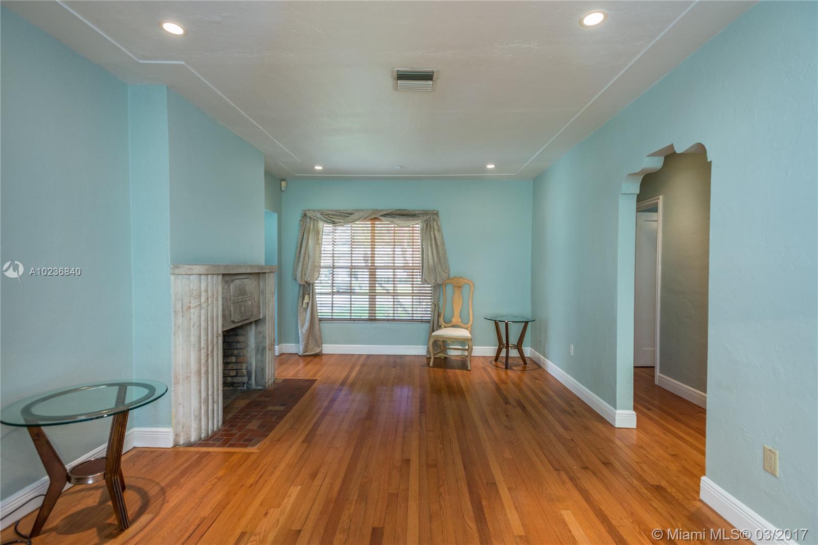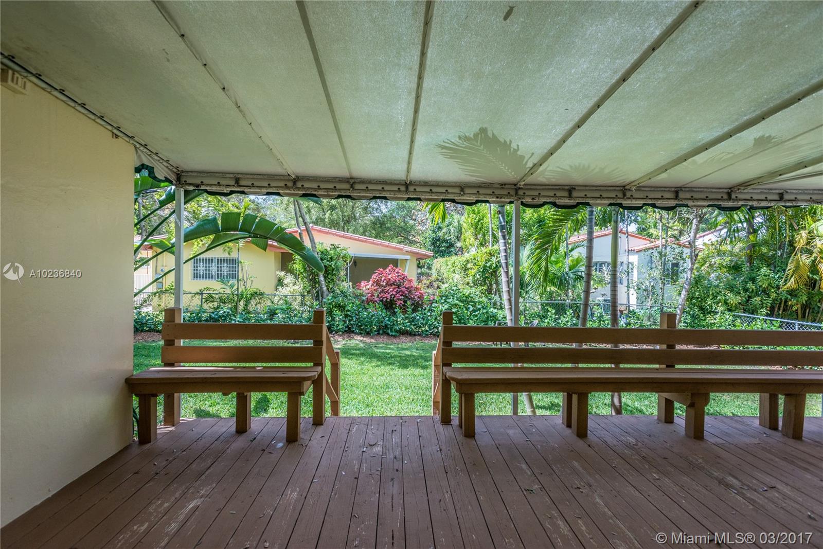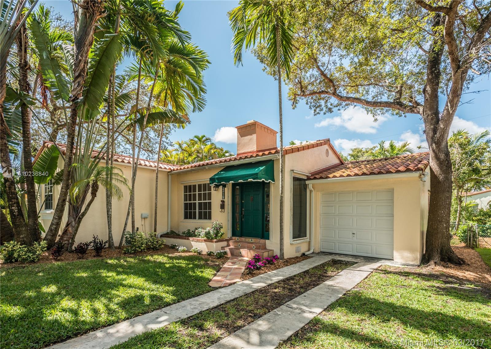 N. Gables gem on quiet & picturesque street, with ample L-shaped kitchen, good layout, covered back patio for outdoor entertaining or overflow room for kids to play. Beautifully maintained original features i.e. hardwood floors, stone fireplace, architectural arches, high ceilings, recessed lights, 1 car garage, barrel tile roof from 2006 w/many years of life. Recent updates are new wood deck, sprinkler system w/timer, new washer/dryer, recently tented, storm panels, fenced yard, alarm. Great schools!