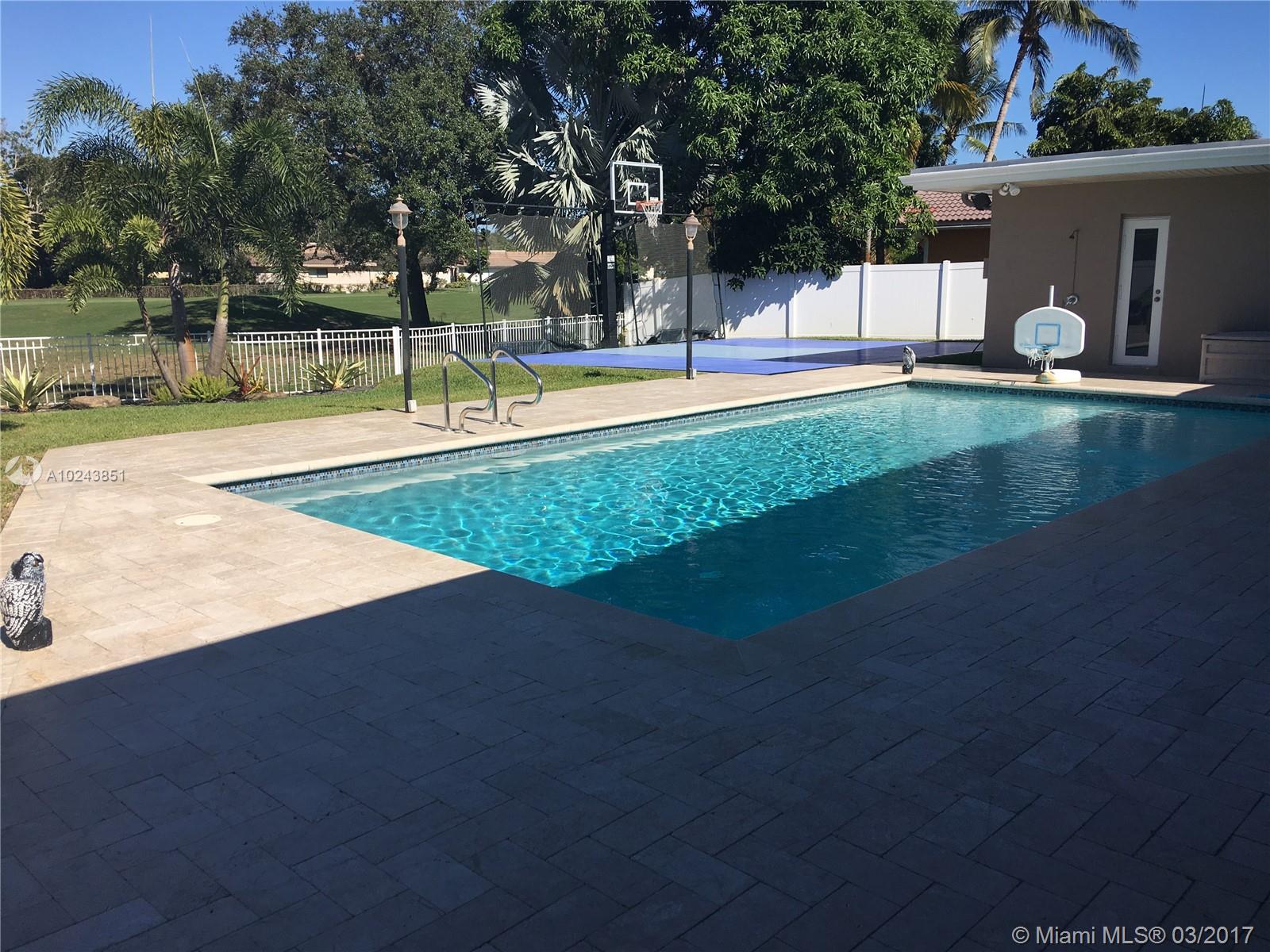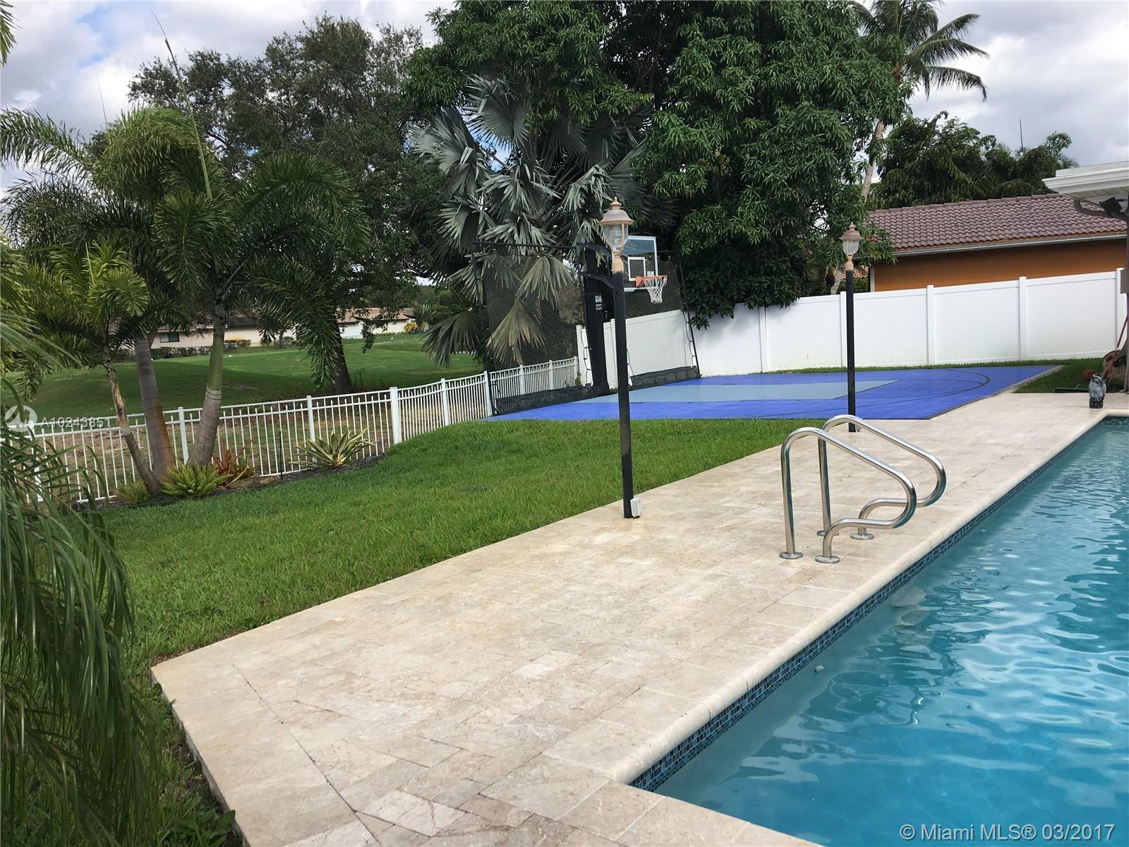 Beautifully renovated home, includes hurricane impact windows and doors throughout home, brand-new kitchen cabinets with stainless steel KitchenAid appliances and quartz counters. Kids bathroom features vanity with double sinks, light cabinets and quartz counters. Master bathroom with marble shower and Roman tub. Porcelain wood tile in all bedrooms. Beautiful backyard overlooking golf course with gorgeous heated pool. Includes professional Sports Court basketball. Walking distance to house of worship.