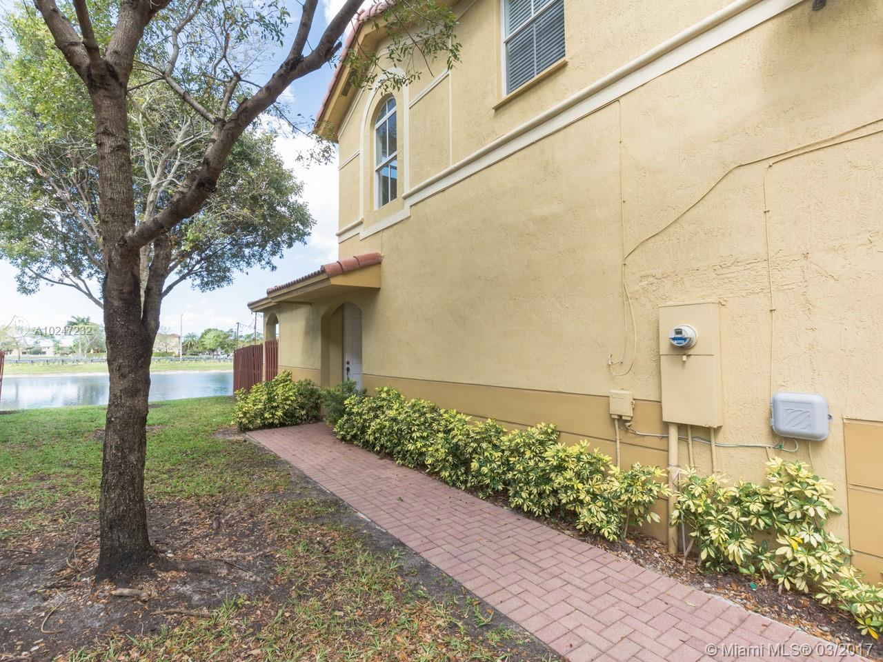 Great opportunity to buy a 3 bed, 2.5 baths corner townhouse with view to the lake. On the first floor is the master bedroom and a nice spacious combined living-dinning area with a half bathroom and kitchen. Two bedrooms and one bathroom upstairs. Kitchen has granite counter top and stainless stainless steel appliances. Nice fenced patio with lakefront. Covered garage that fits one car, a second car can be parked on the pavers. Nice community pool, playground and clubhouse.