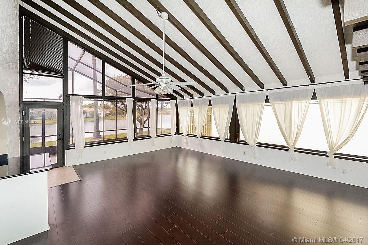Charming! One of a kind! Truly unique three bedroom one story home with wide water views features expansive great room (400 sq ft) with vaulted and beamed ceilings. In addition, there is a remodeled kitchen, wood floors everywhere, special mold resistant roof 2007 and A/C 2016. Large screened patio with retractable awning overlooks the lake for peaceful enjoyment. Community pool, Town Center and shopping are steps away. Maintenance includes lawn cutting & sprinklers.