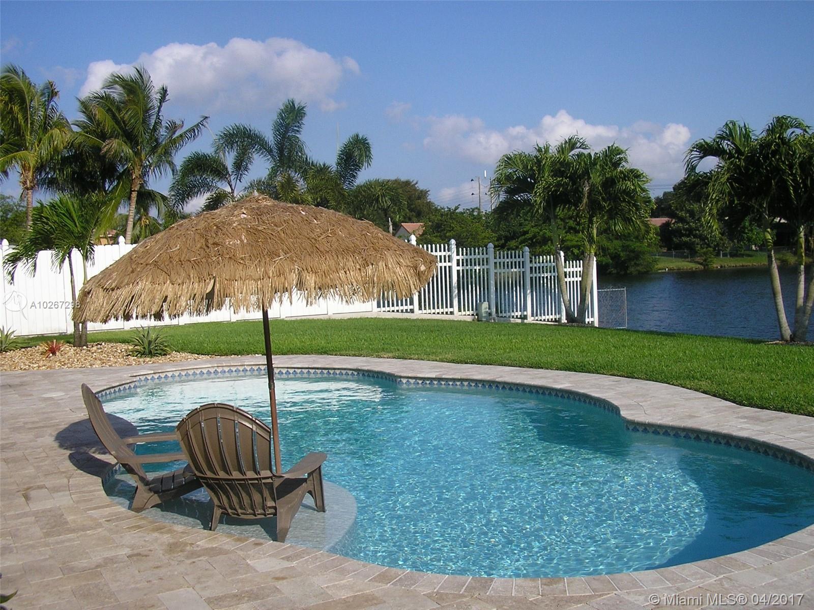 Welcome Home to this highly sought after 4 bedroom triple split design with 3 full bathrooms plus a half bath for guests. Vaulted ceilings and open floor plan make this home really spacious and perfect for entertaining and enjoying the tropical setting and view of waterway and swimming pool. Many recent upgrades throughout , Pool was installed in 2015, one 3 ton AC , appliances, bathroom fixtures and all interior doors are updated. Kept immaculate inside and professional landscaping is manicured outside. Washer and Dryer do not convey. Has accordion shutters and storm rated garage door. So close to easily commute.