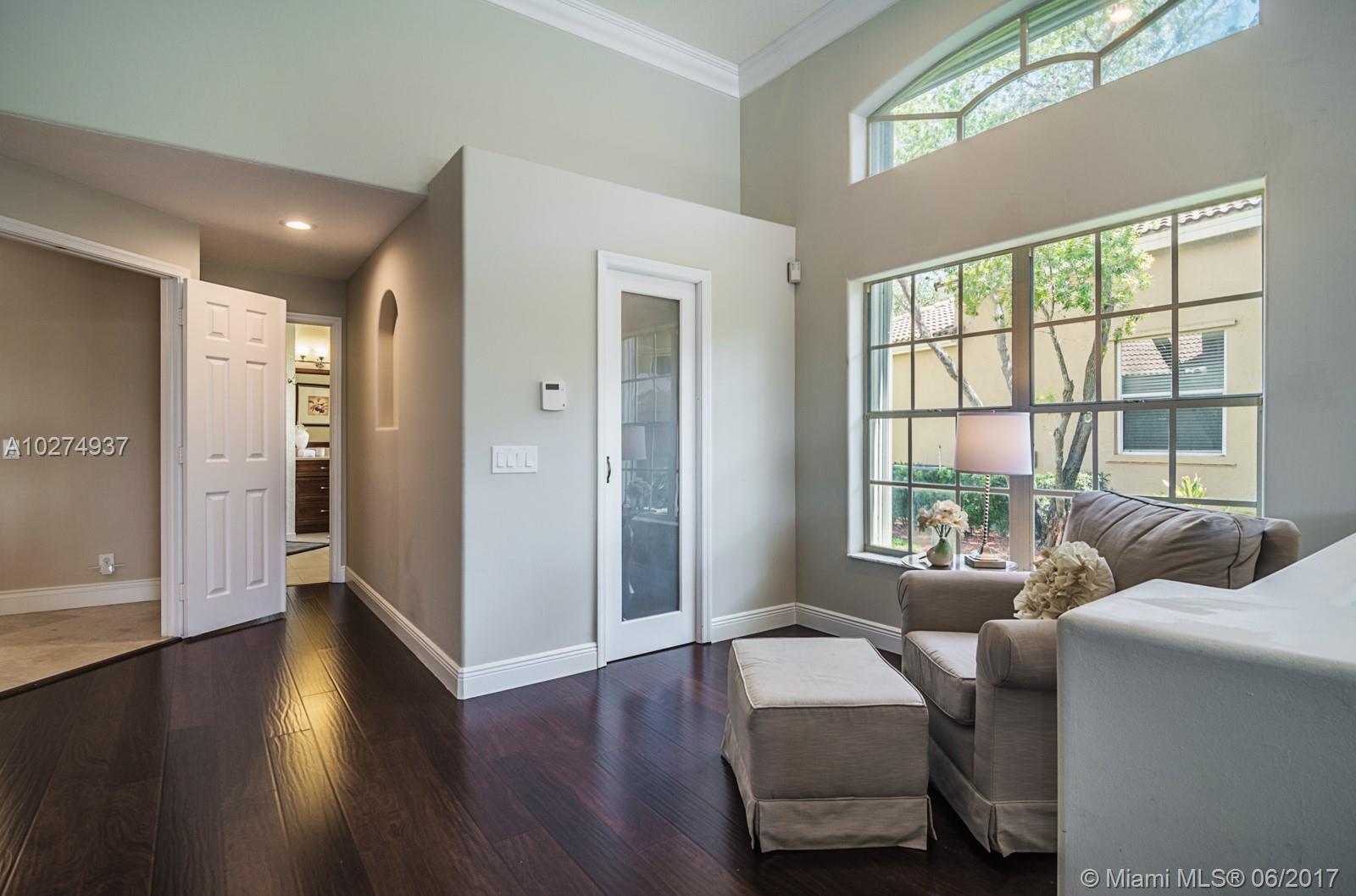 This home is immaculate. No detail has been spared. Beautiful porcelain marble look tile throughout living area and expresso wood flooring in all bedrooms. 4 bedrooms plus oversized Den/office. 3.5 gorgeous bathrooms. Home features centralized vacuum system. Extensive crown moldings, Renovated Gourmet kitchen with all Stainless Steel Bosch appliance, SubZero, wall oven, cooktop & granite countertops. Tucked on a quiet interior lot with low traffic. Screened heated pool/spa with paver patio, salt chlorinating system overlooks one of the widest lakes in Weston Hills. Additional side area, perfect for playset.