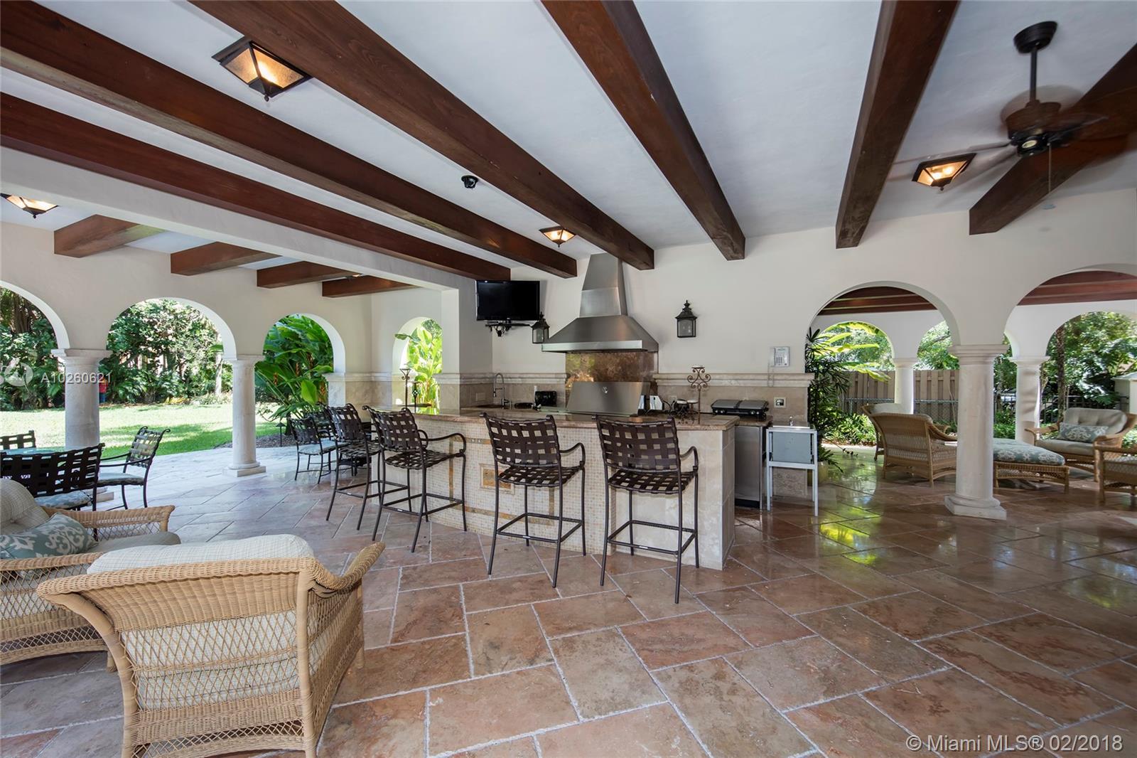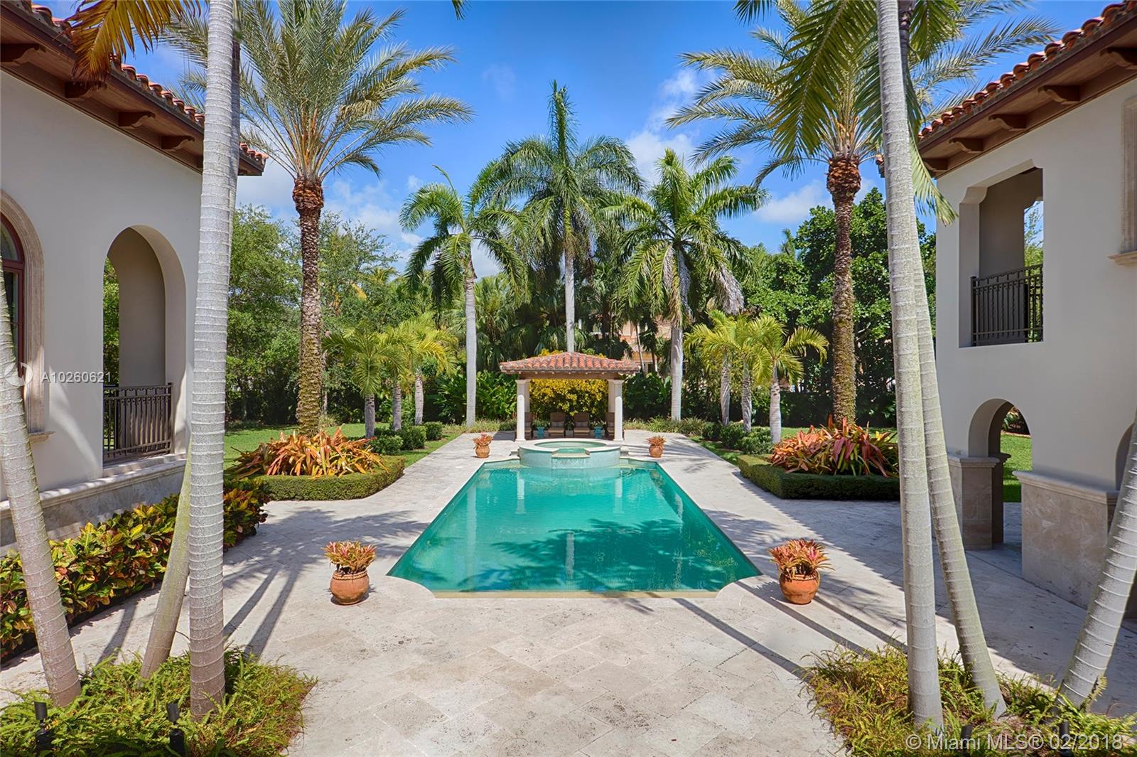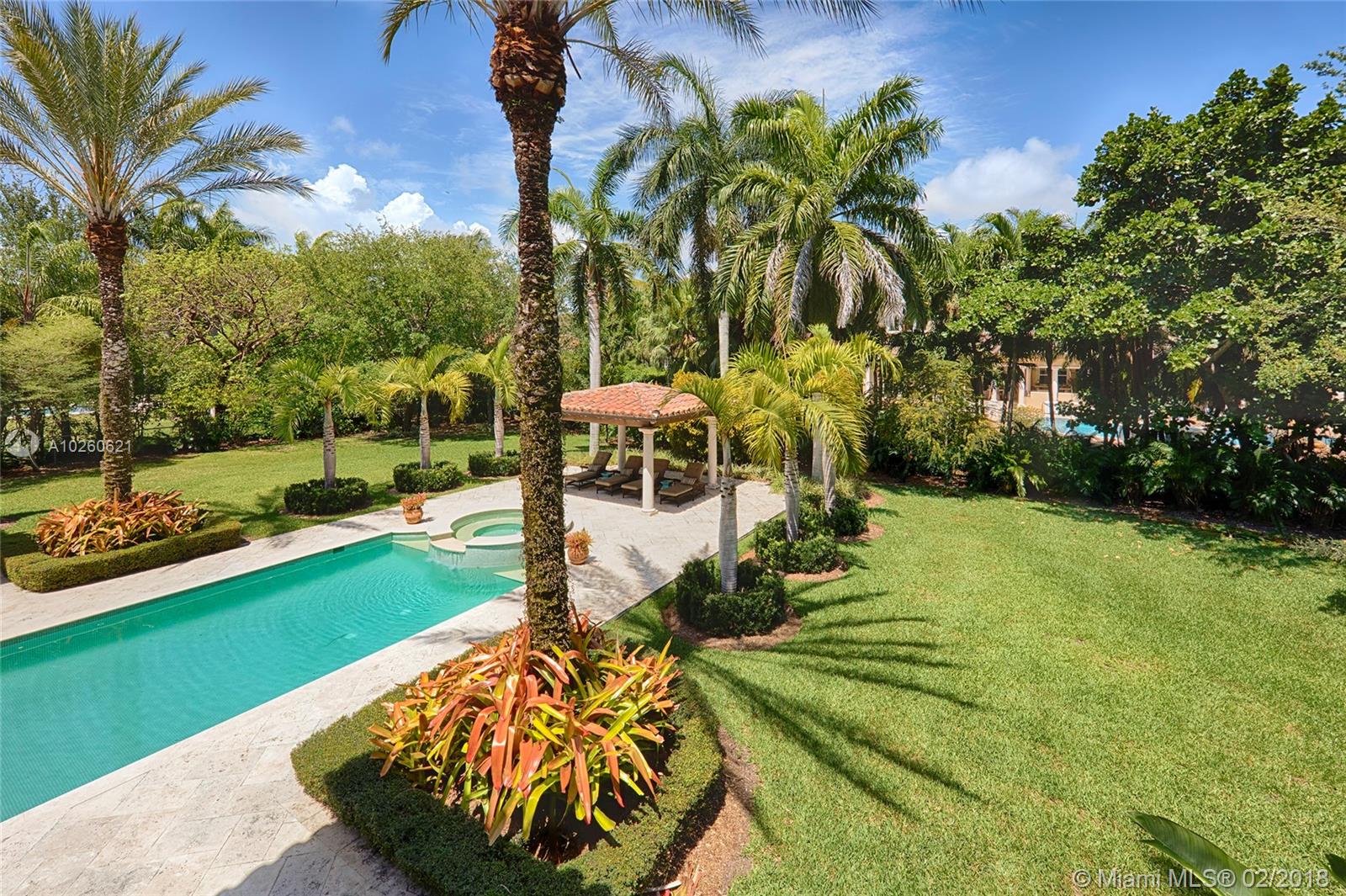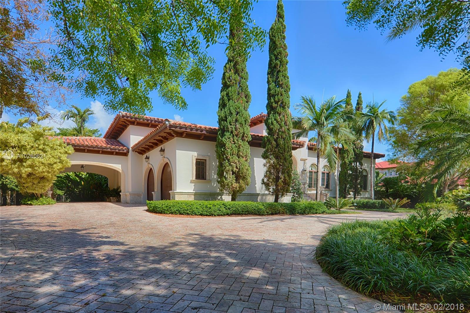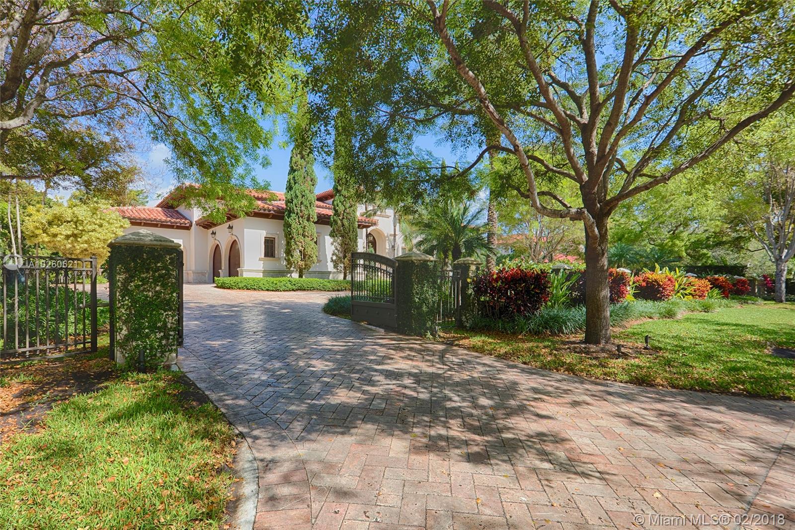 Stunning Mediterranean gem designed by Ramon Pacheco on gated beautifully landscaped 36,750 sf lot. Circular driveway,grand front entrance w/arched mahogany doors.Foyer,formal living & dining rm have high ceilings. Elegant custom finishes throughout:mahogany millwork, Roatan wood drs,built-ins,marble & wood flrs.The spacious kitchen has Sub Zero/Wolf appliances, large island,walk-in pantry. Breakfast area opens to family rm overlooking garden,pool area & covered terrace. Large sitting rm opening to master suite on a split level w/2 generous walk-ins, elegant new bathroom & private covered terr.Bedrooms wing has 3 addl en-suites.The pool deck & large yard feature a covered summer kitchen,built-in bar,full cabana bath.Separate staff quarters.SqFt is ADJ area as per owner.
