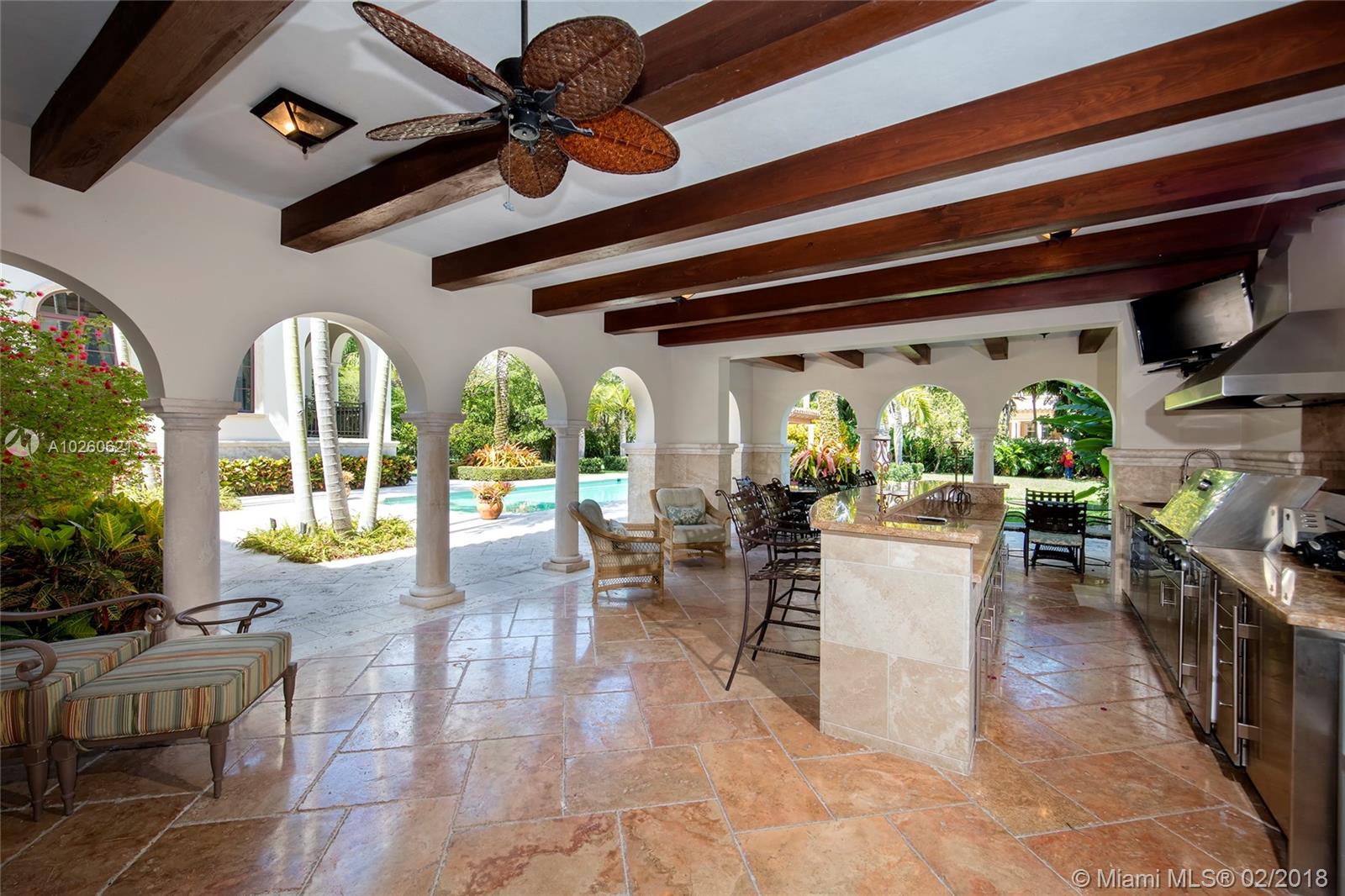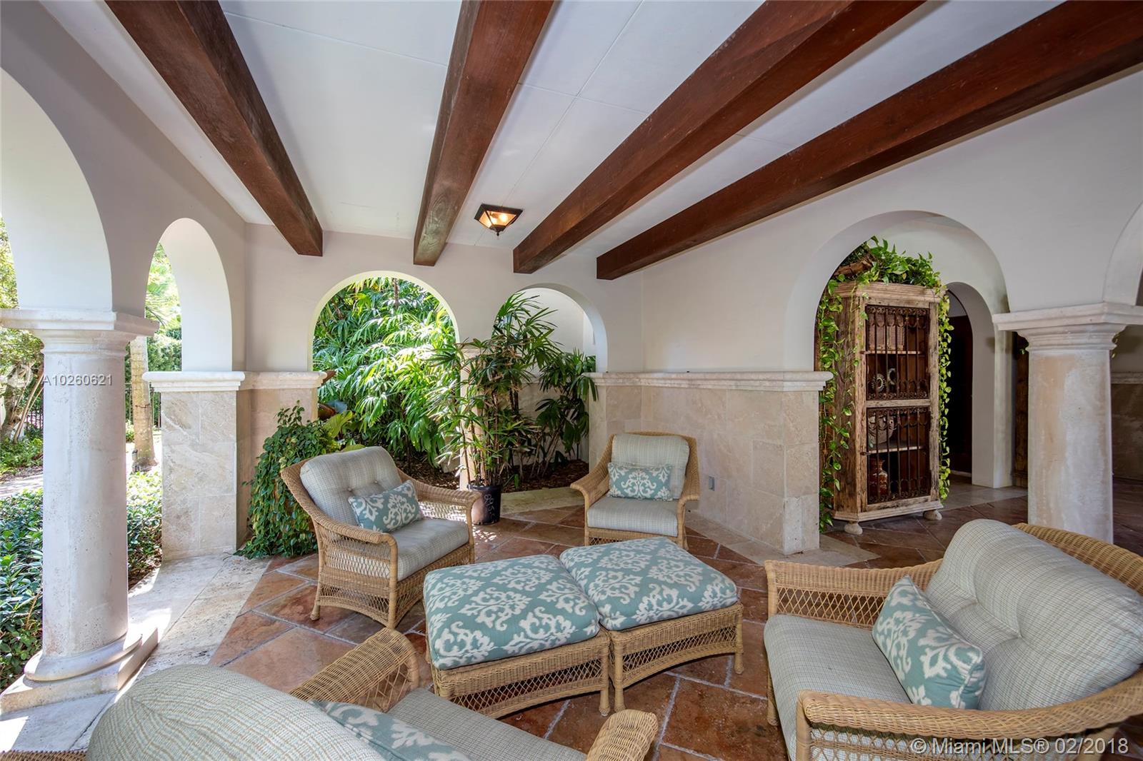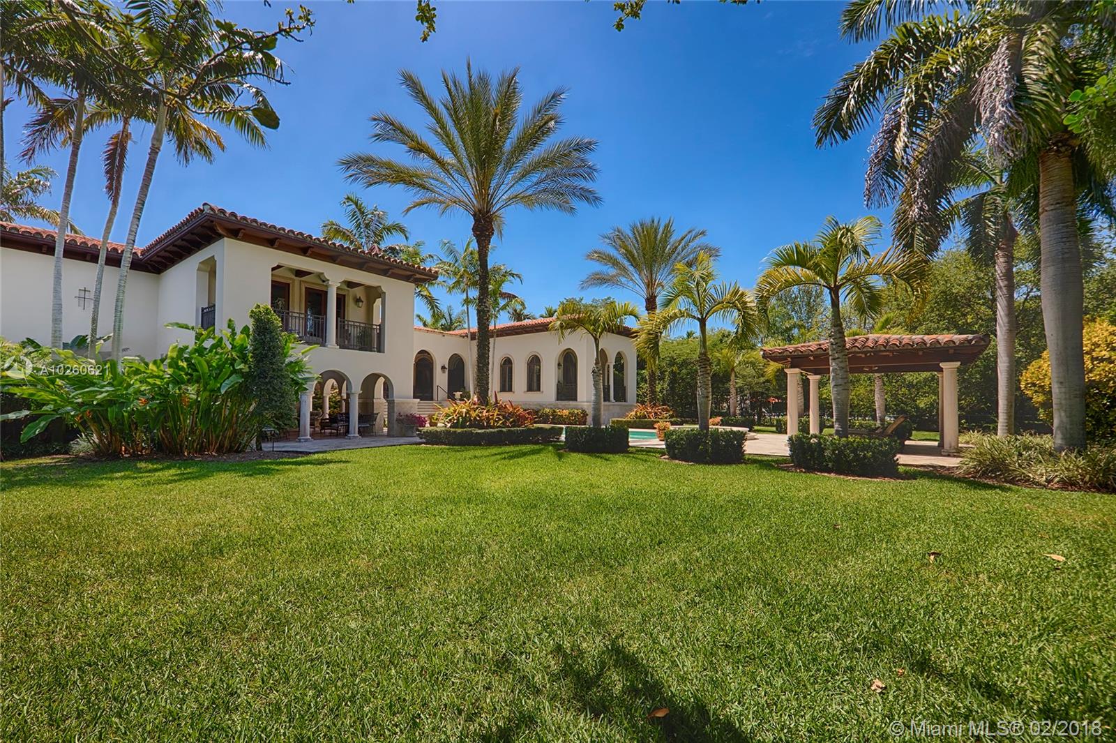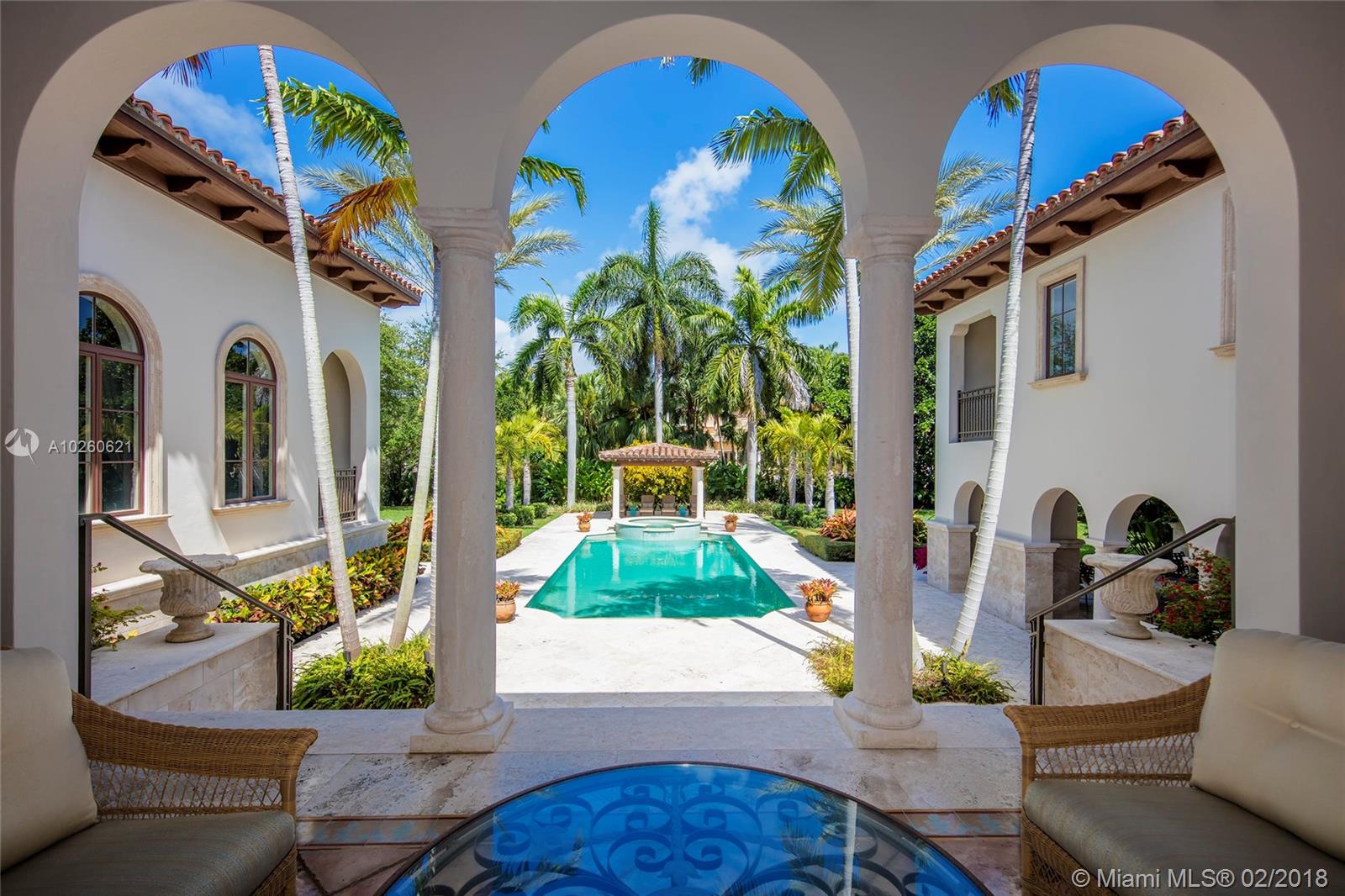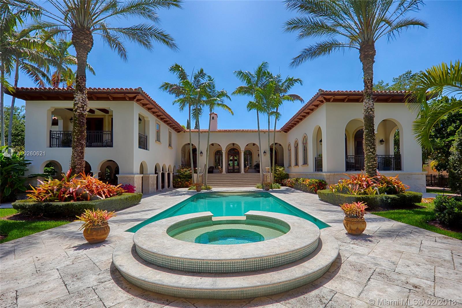 Stunning Mediterranean gem designed by Ramon Pacheco on gated beautifully landscaped 36,750 sf lot. Circular driveway,grand front entrance w/arched mahogany doors.Foyer,formal living & dining rm have high ceilings. Elegant custom finishes throughout:mahogany millwork, Roatan wood drs,built-ins,marble & wood flrs.The spacious kitchen has Sub Zero/Wolf appliances, large island,walk-in pantry. Breakfast area opens to family rm overlooking garden,pool area & covered terrace. Large sitting rm opening to master suite on a split level w/2 generous walk-ins, elegant new bathroom & private covered terr.Bedrooms wing has 3 addl en-suites.The pool deck & large yard feature a covered summer kitchen,built-in bar,full cabana bath.Separate staff quarters.SqFt is ADJ area as per owner.