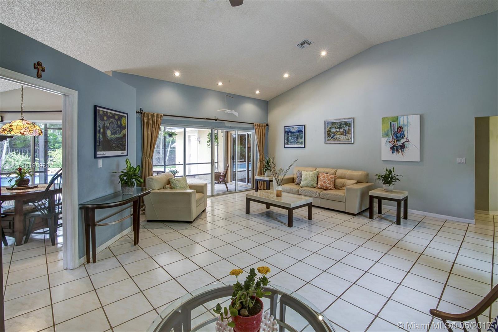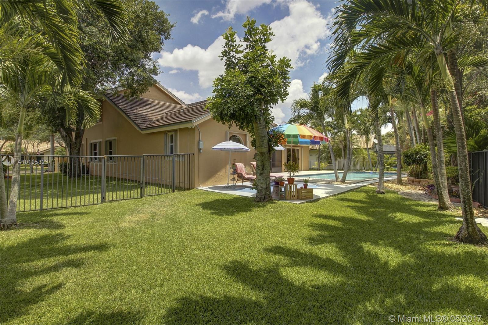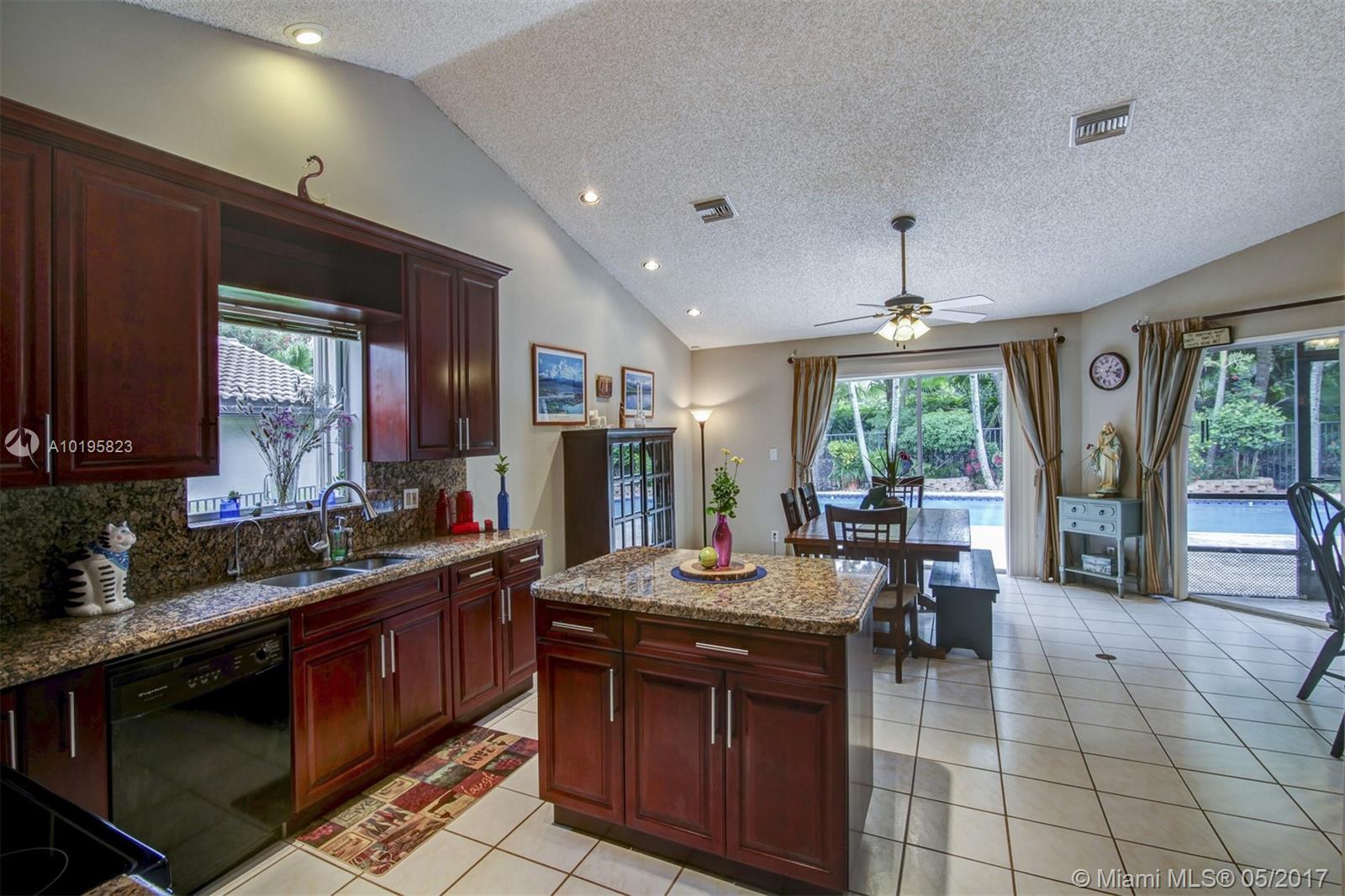 4 Bedroom, 3 Full Bathroom, Office (optional 5th Bedroom) well-kept home on quiet street near culdesac, A+ schools (Country Isle Elementary, Tequesta Trace Middle, Cypress Bay High, parks in walking distance, Weston Town Center in walking distance, sidewalks on both sides of the street, partial lake view, 40 x14 pool, roof 7 yrs, new sprinkler, accordion shutters, aluminum fence, two car garage, 4 car driveway, over 20 mature palm trees on property, all appliances included, high ceilings, new refrigerator and stove, granite counter tops, 44 inch cabinets (cherry wood), recessed lights, separate pantry, separate washer and dryer room, master BDR on ground floor with hardwood floors, 2 walk in MBR closets, large master suite with 2 cabinet sinks, shower, separate garden tub plus cabana door