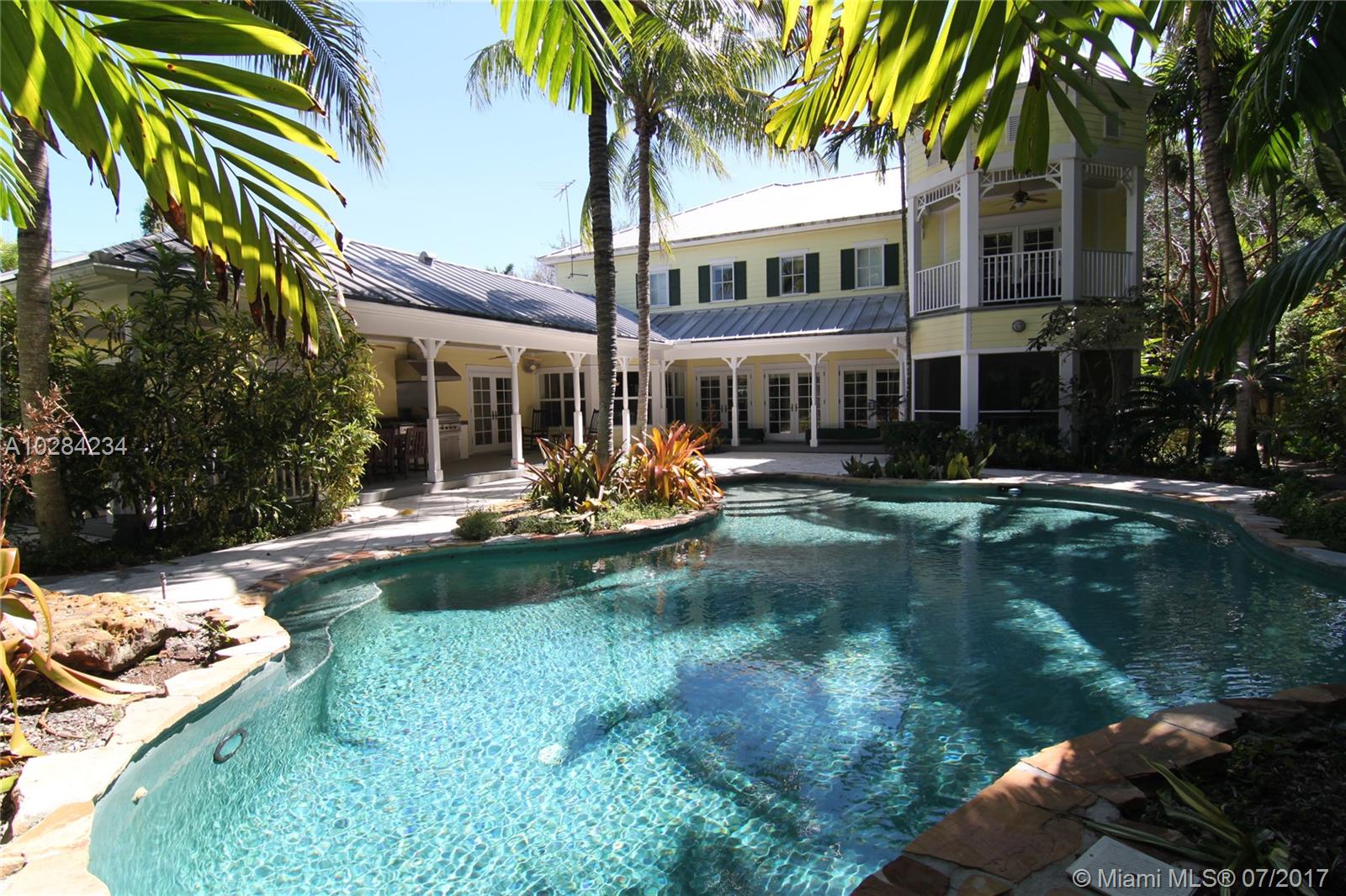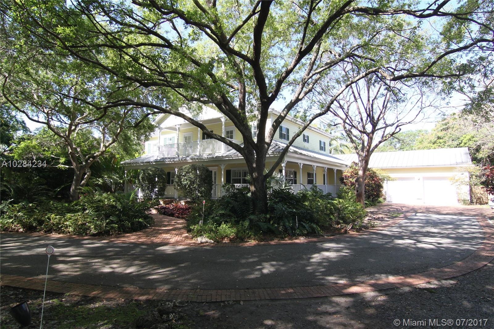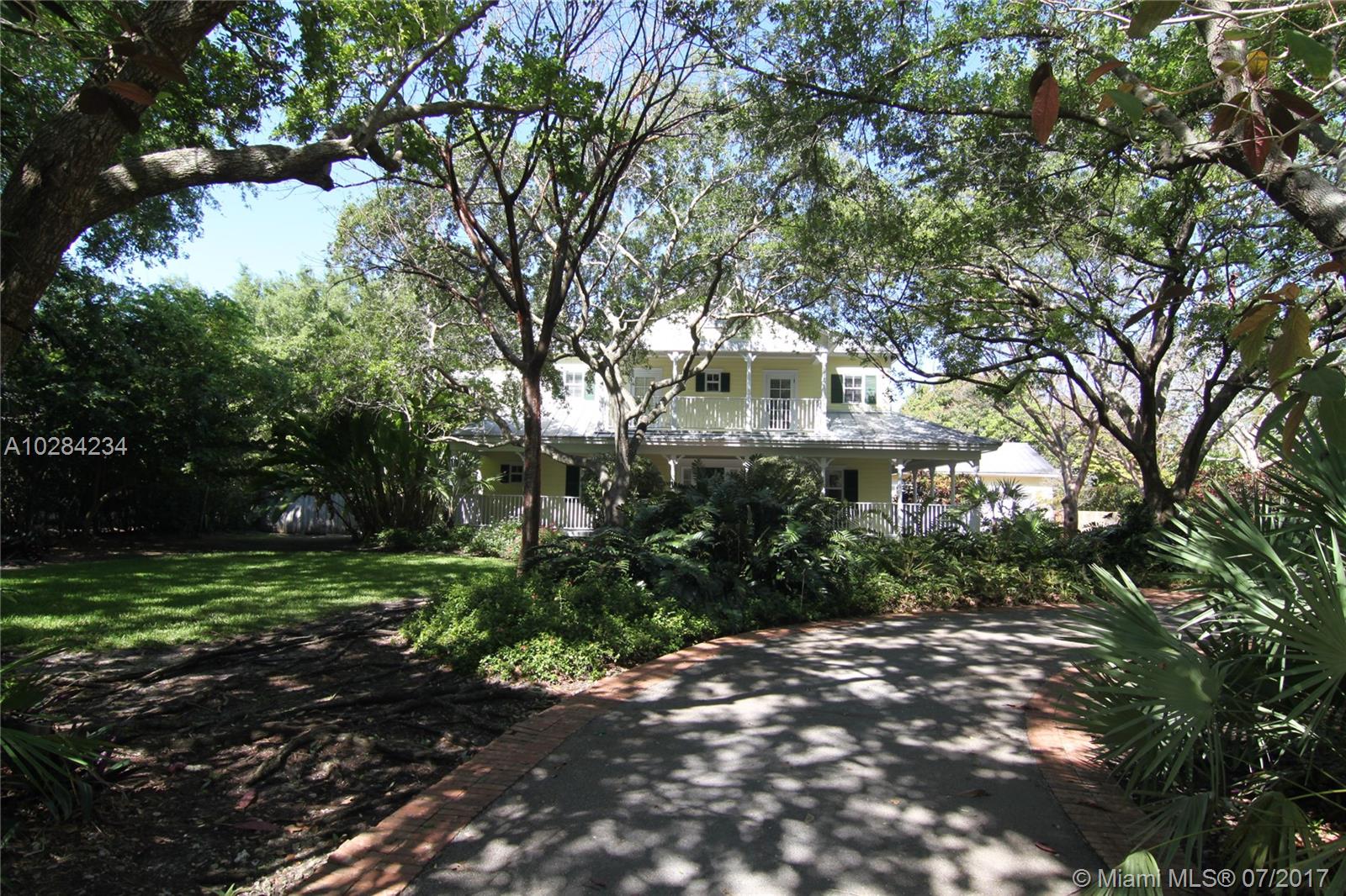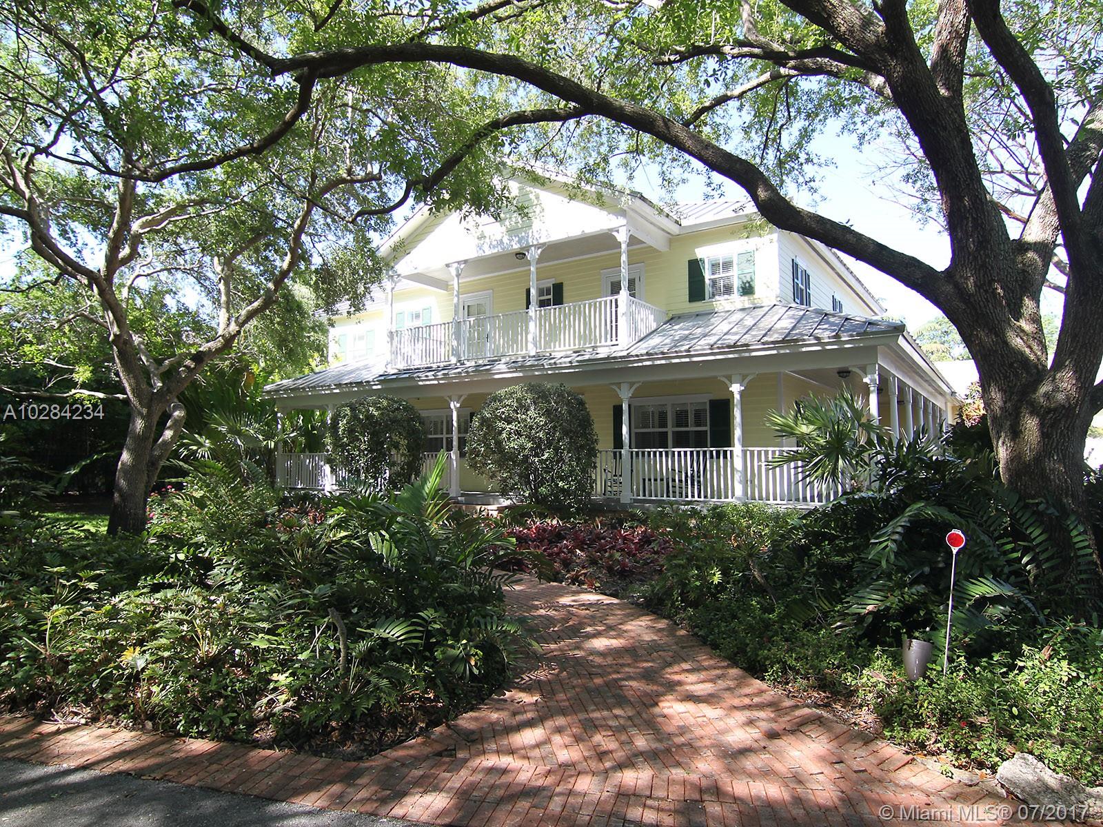Elegant and timeless Key West style estate on most sought after East Suburban Street (SW 60 Ct). Tropical paradise with lush plantings and foliage. Wrap around porch and balcony boast serenity and heavenly views! Imposing high volume ceiling, gracious formal living room with fireplace and dining room. Terrific floor plan! Inviting resort style pool, built-in BBQ, perfect for entertaining. Large open gourmet dream kitchen with spacious breakfast area. Marble baths, hardwood floors. Impact windows and French Doors. Summer Kitchen and saline pool. Lush deep acre. One of a kind!