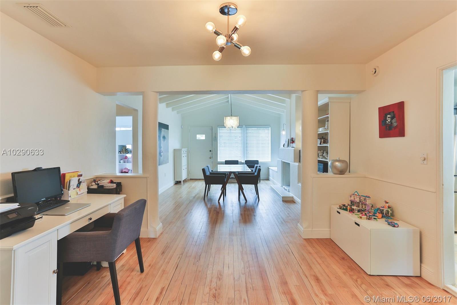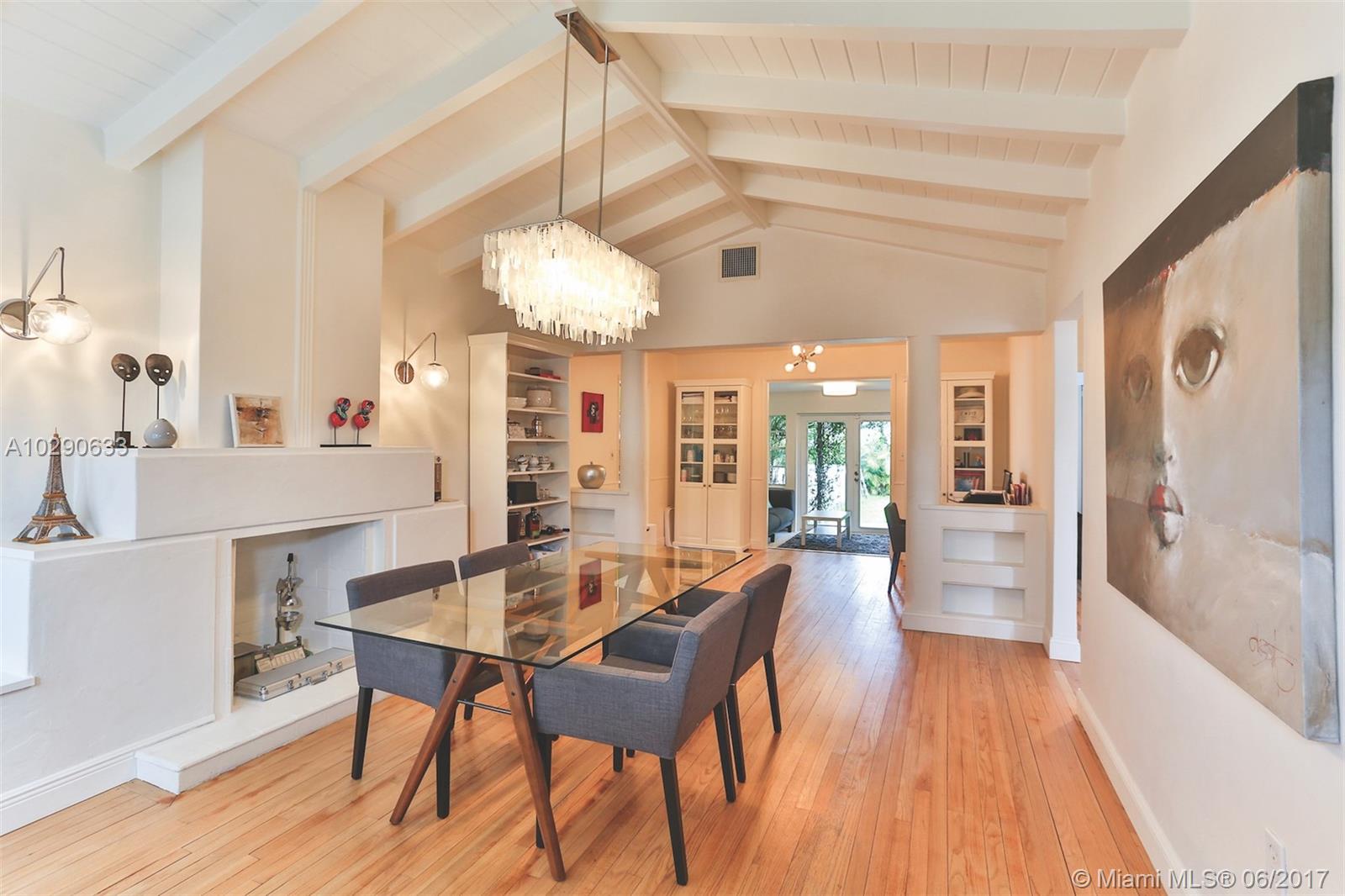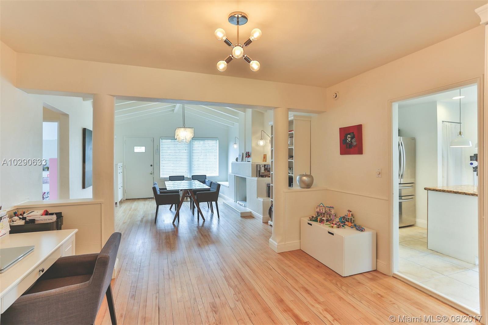 Art deco gem in the desirable Town of Surfside! This charming home has a great mix of original details and modern features, such as cathedral ceilings, lovely deco fireplace & wood floors, plus a newer tile roof and updated windows, electrical wiring, and water pipes. The house has 2 bedrooms and one bathroom, plus a large storage room (converted garage) that could be made into a 3rd bedroom and 2nd bathroom. All of the appliances in the home are only one year old. The huge, private backyard has a deck and an above-ground pool. Best of all, this house is just 3 blocks to the beach! Walk to the beach, Surfside community center/pool, Four Seasons Surf Club, restaurants & Bal Harbour Shops! Zoned for A rated Bay Harbor schools. Call today!