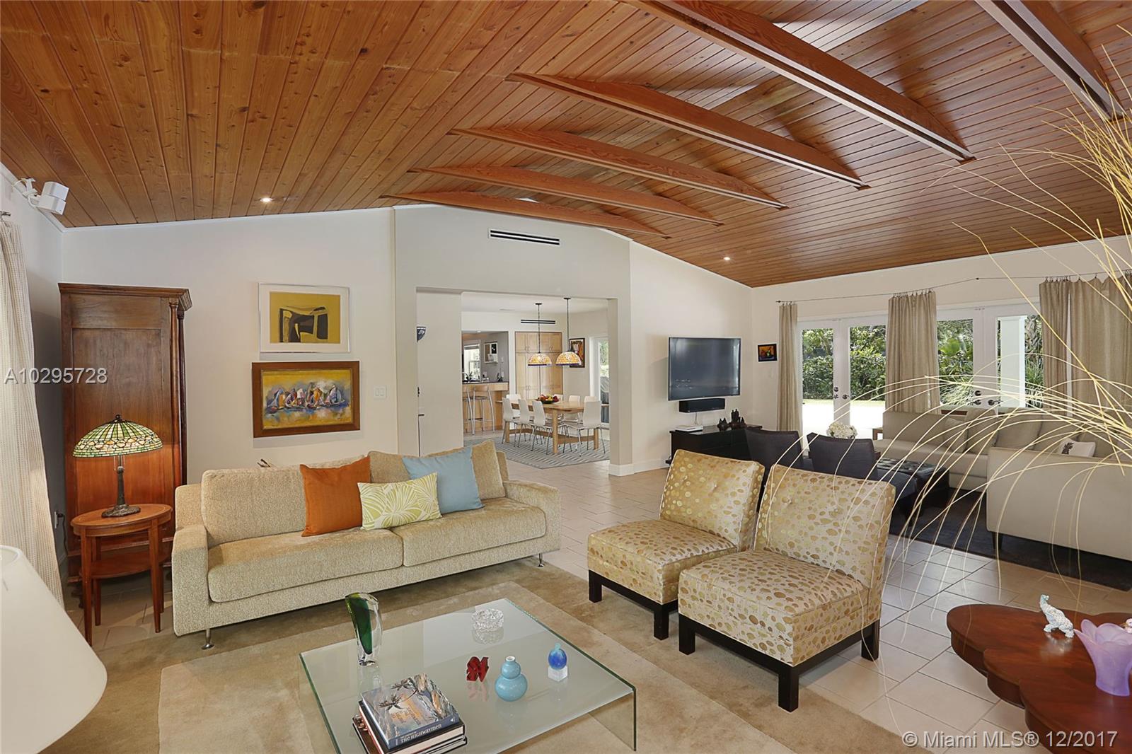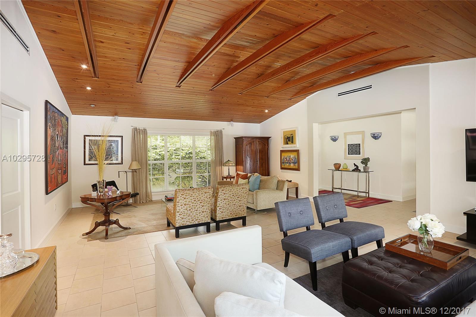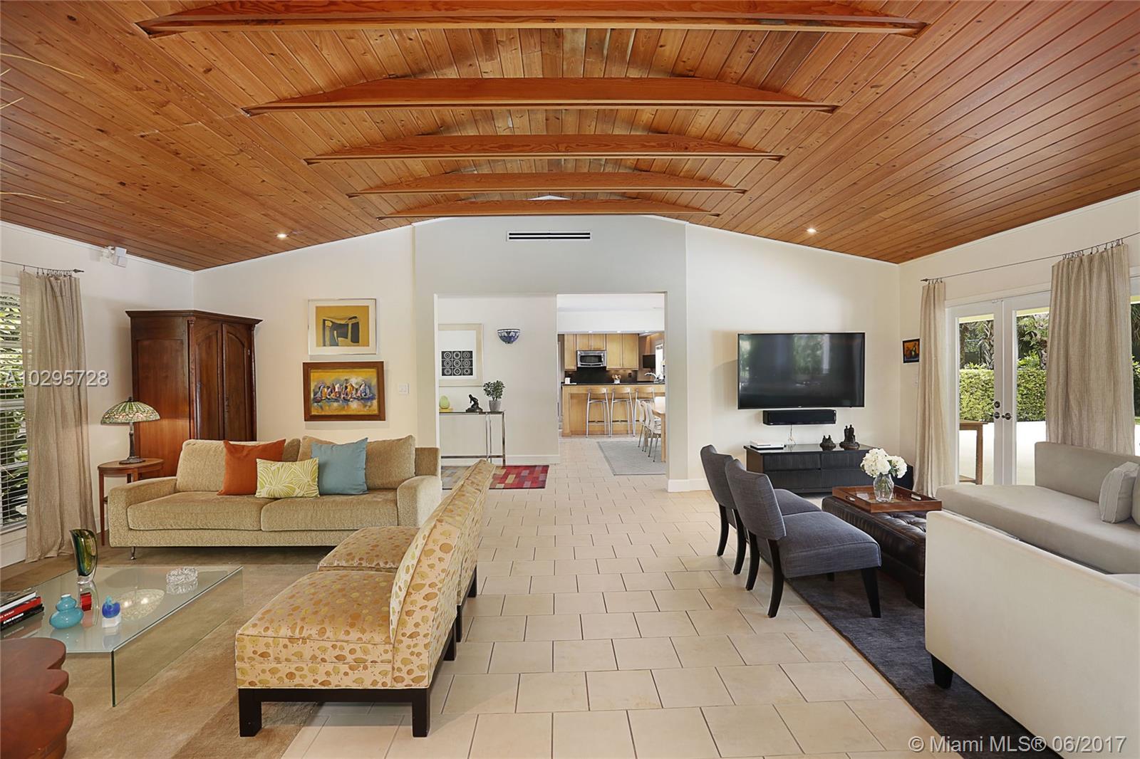 Go ahead and grab a milkshake at Wayside Market as you head to this wonderful North Pinecrest home! Located on a quiet street surrounded by lovely, updated houses, this one is a stunner. Living Area=2,556 sf. The foyer entry leads into a spacious living room with vaulted wood ceilings and French doors opening out to the deep covered porch that is truly another living space. Beautifully updated, the open kitchen looks over the dining and family rooms. This 4 bedroom/3 bathroom home has a split floorplan perfect for guests. The master features soaring ceilings, large walk-in closet, and recently renovated bathroom. Impact glass windows and French doors, laundry and storage rooms, 14,985 SF lot, sparkling pool, metal roof, and Pinecrest Elementary…this house has it all!