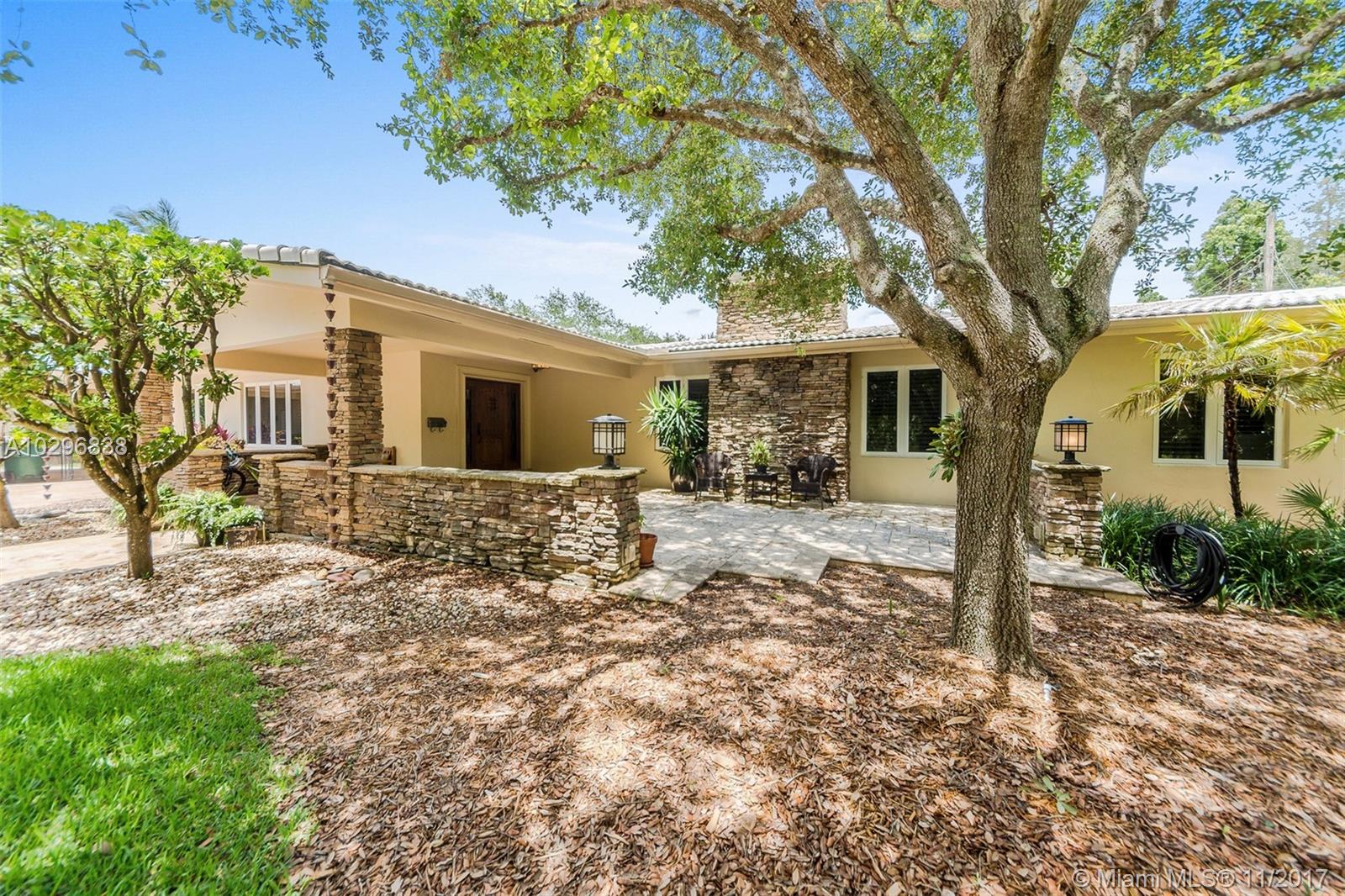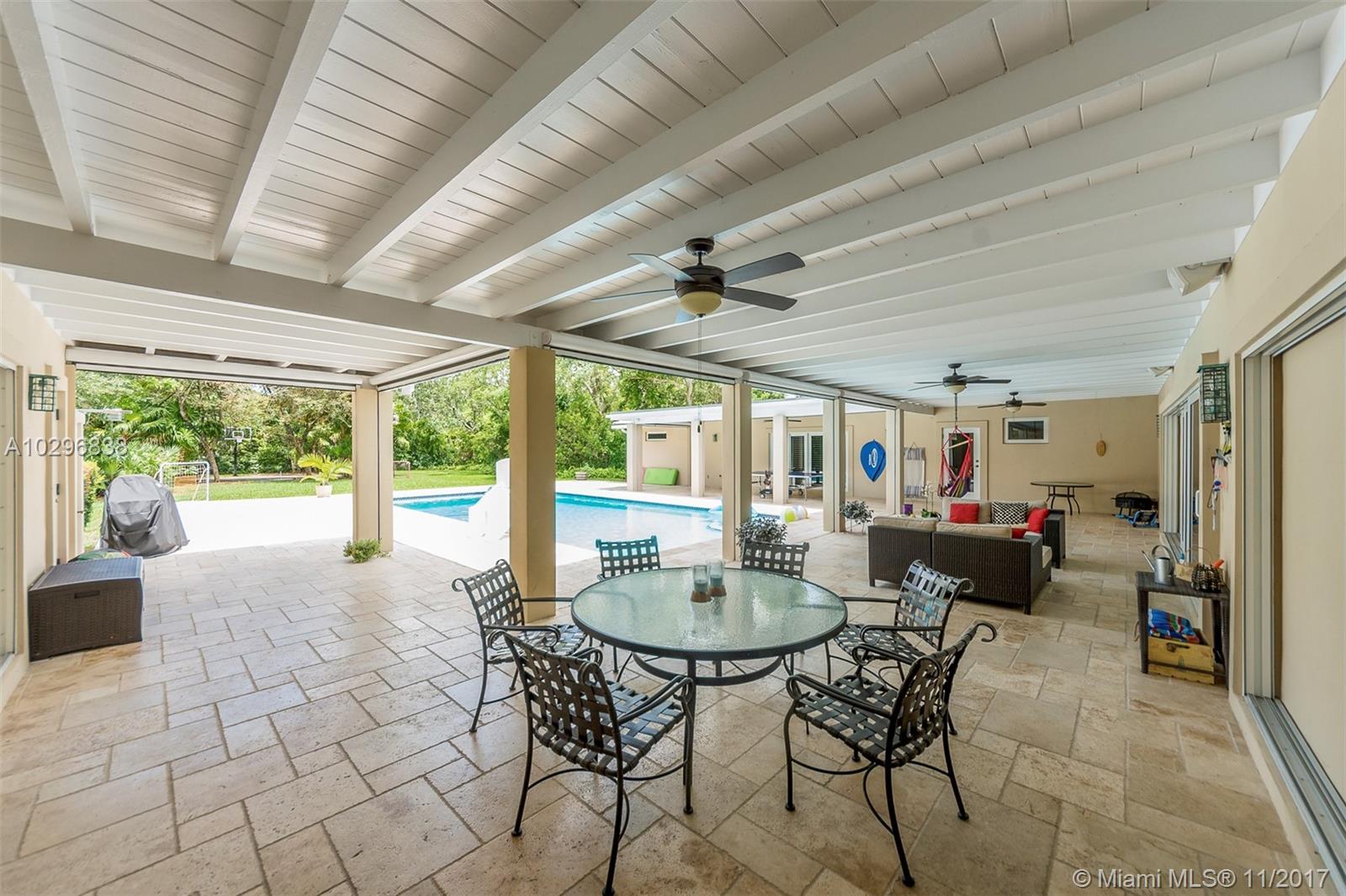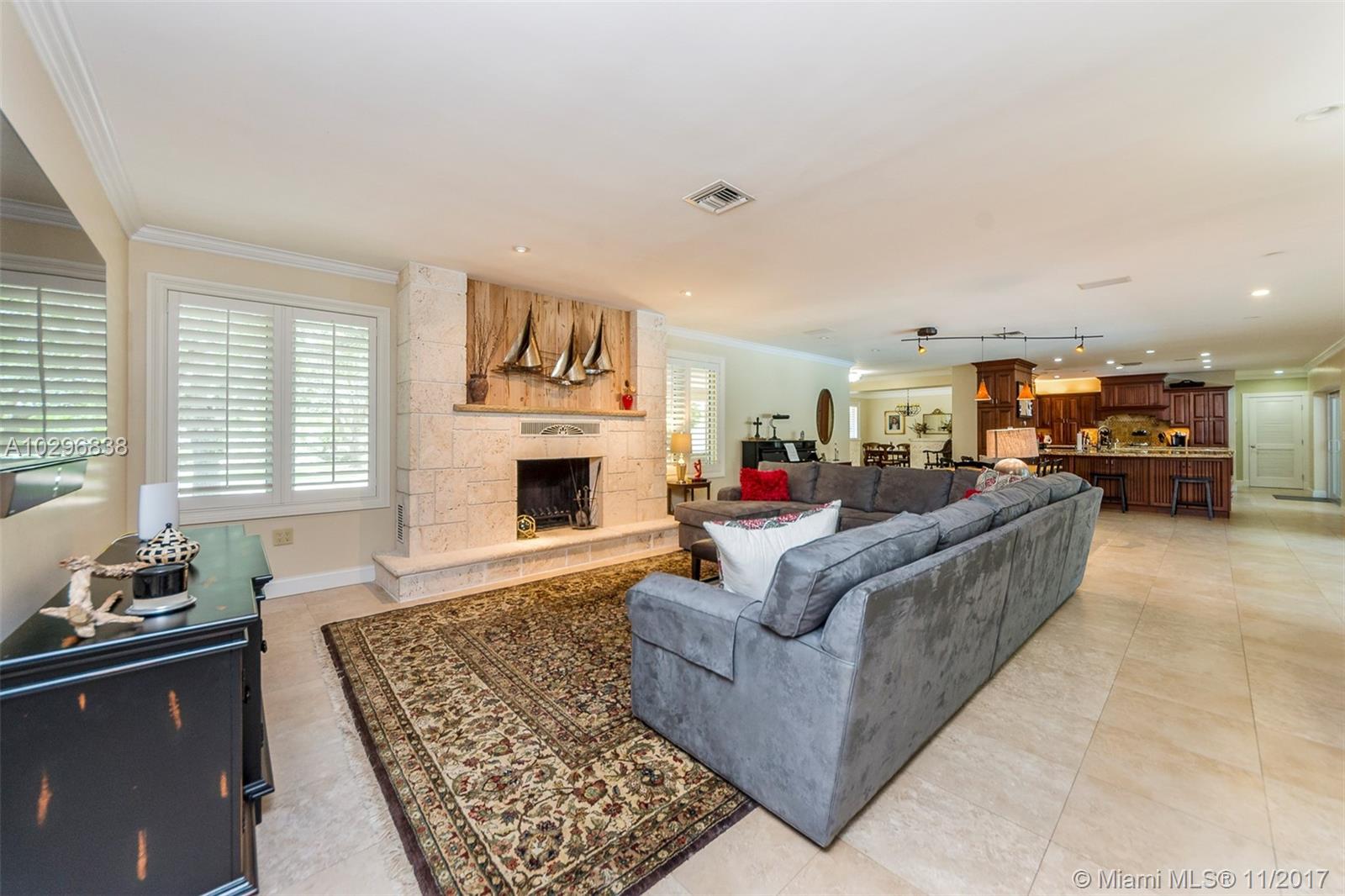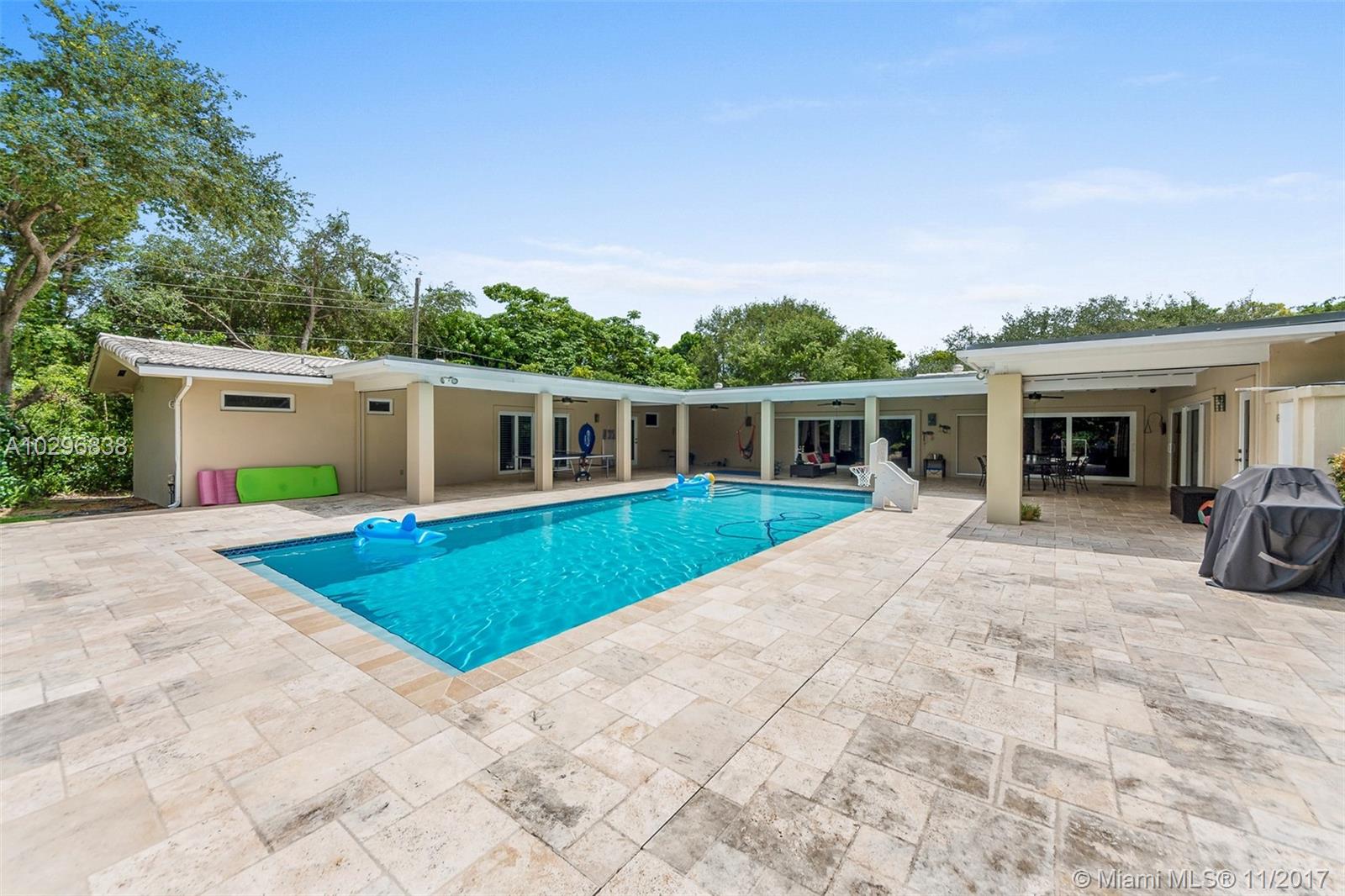 Fantastic 4 bedroom + office, 4 bathroom remodeled home situated on almost an acre on a quiet street in the Village of Pinecrest. Open concept living area includes large living room with charming keystone fireplace, casual dining area & beautiful kitchen with stainless steel appliances, island, wooden cabinetry, and eat in snack bar. Formal dining room. Family room with wet-bar and full cabana bath. Master suite features customized walk in closet with built in shelving. Master bath has vanity, double sinks, separate shower and tub, beautiful stone tile. Expansive covered patio with retractable electric screen. Tile flooring, plantation shutters and impact windows throughout. Indoor laundry room. Wonderful, private back yard with swimming pool & basketball court. Oversized two car garage.