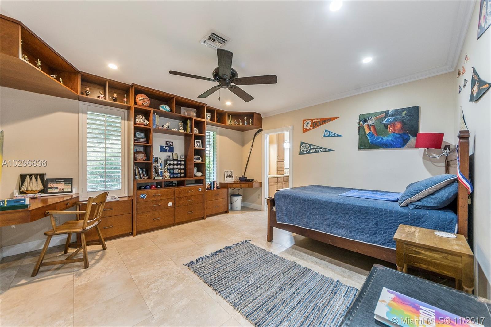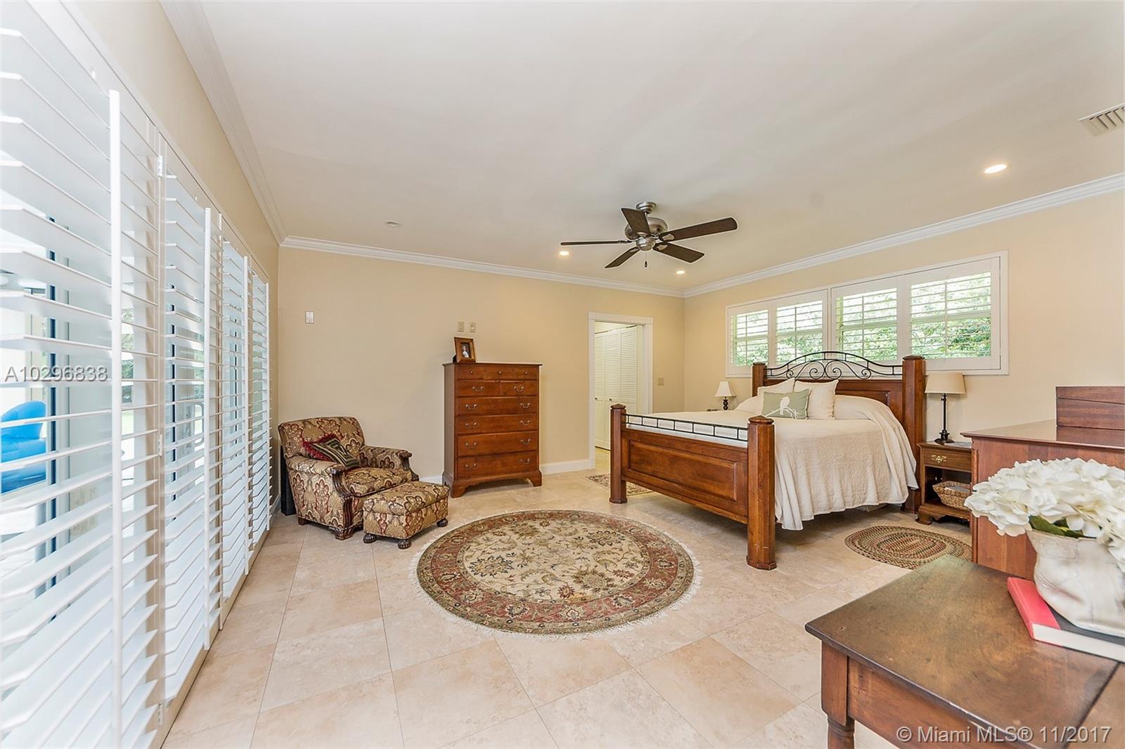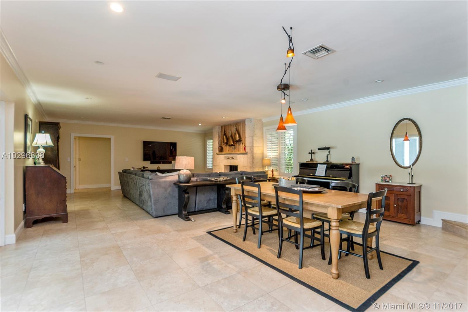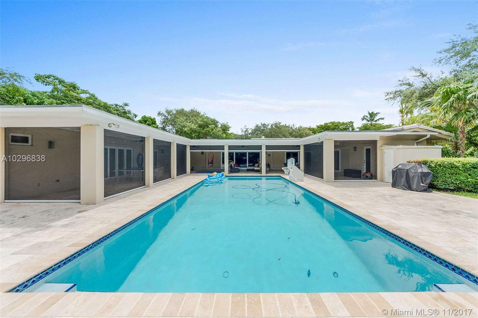 Fantastic 4 bedroom + office, 4 bathroom remodeled home situated on almost an acre on a quiet street in the Village of Pinecrest. Open concept living area includes large living room with charming keystone fireplace, casual dining area & beautiful kitchen with stainless steel appliances, island, wooden cabinetry, and eat in snack bar. Formal dining room. Family room with wet-bar and full cabana bath. Master suite features customized walk in closet with built in shelving. Master bath has vanity, double sinks, separate shower and tub, beautiful stone tile. Expansive covered patio with retractable electric screen. Tile flooring, plantation shutters and impact windows throughout. Indoor laundry room. Wonderful, private back yard with swimming pool & basketball court. Oversized two car garage.