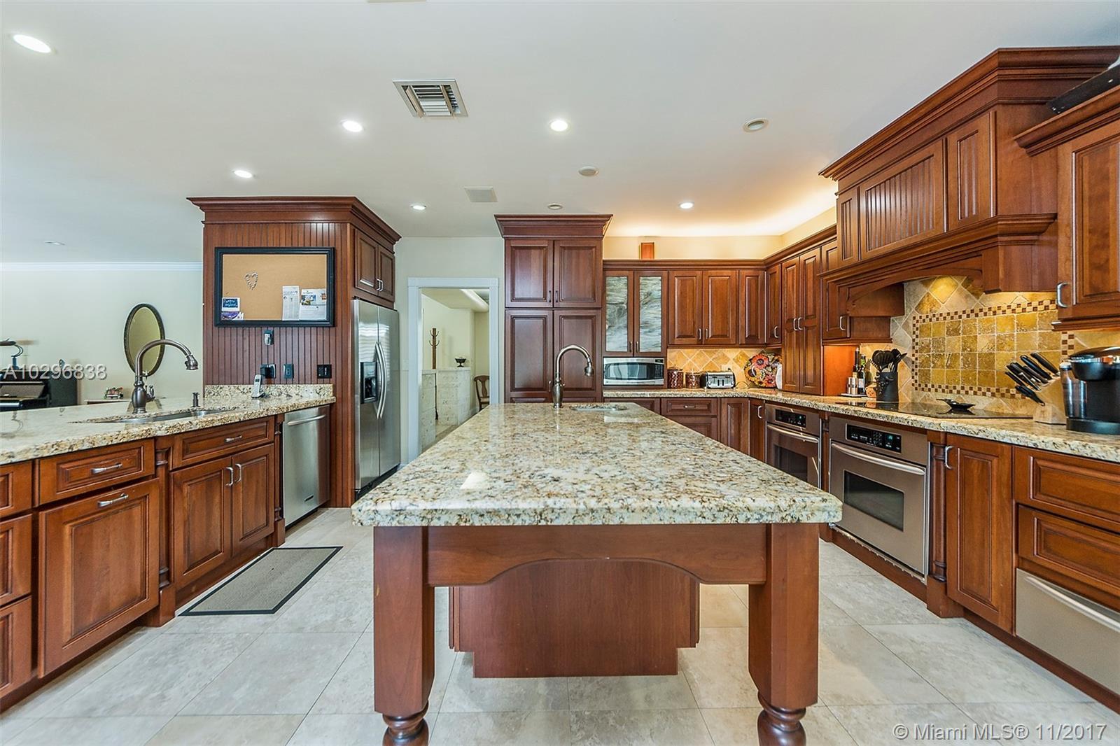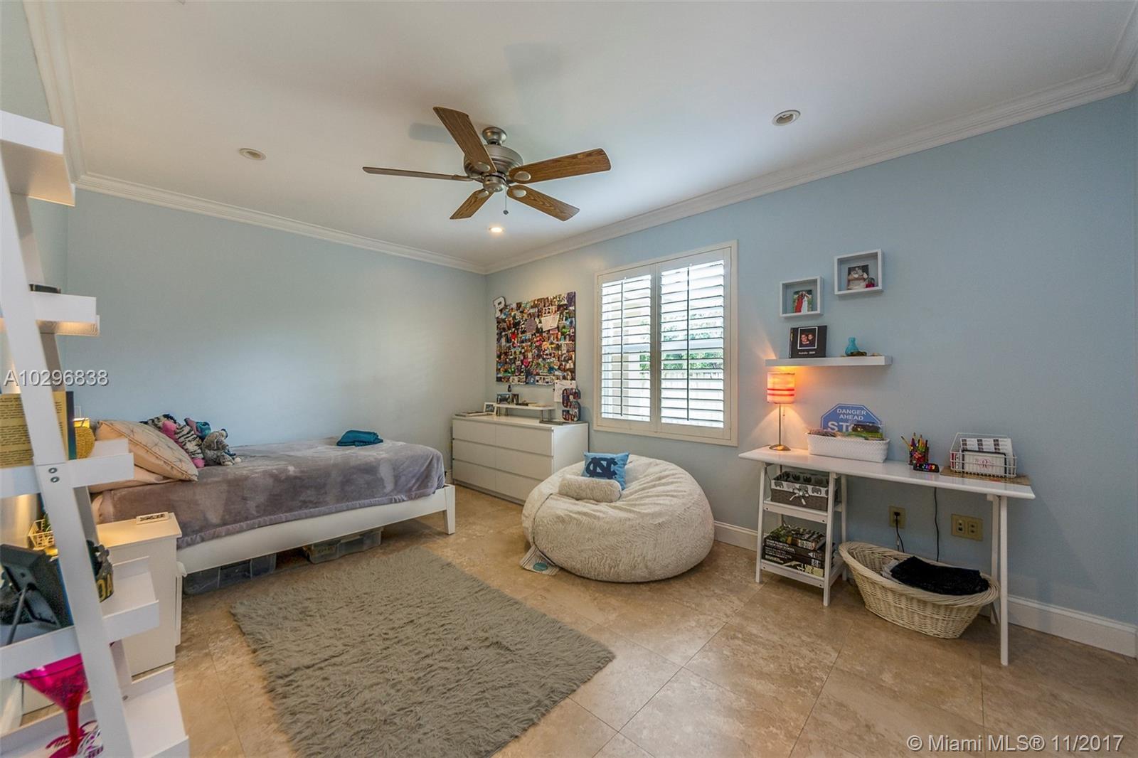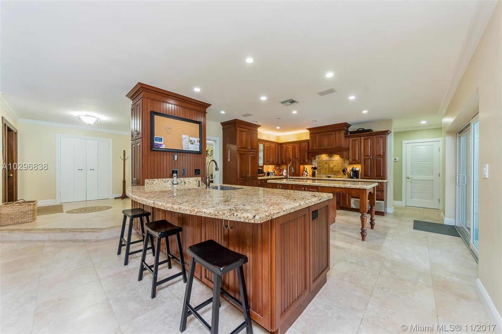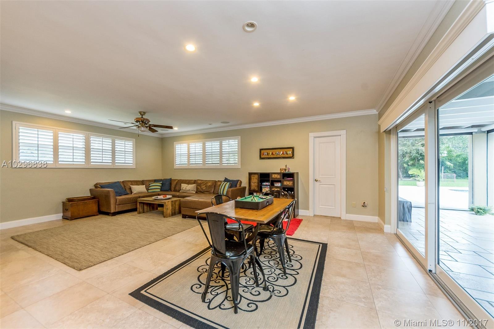 Fantastic 4 bedroom + office, 4 bathroom remodeled home situated on almost an acre on a quiet street in the Village of Pinecrest. Open concept living area includes large living room with charming keystone fireplace, casual dining area & beautiful kitchen with stainless steel appliances, island, wooden cabinetry, and eat in snack bar. Formal dining room. Family room with wet-bar and full cabana bath. Master suite features customized walk in closet with built in shelving. Master bath has vanity, double sinks, separate shower and tub, beautiful stone tile. Expansive covered patio with retractable electric screen. Tile flooring, plantation shutters and impact windows throughout. Indoor laundry room. Wonderful, private back yard with swimming pool & basketball court. Oversized two car garage.