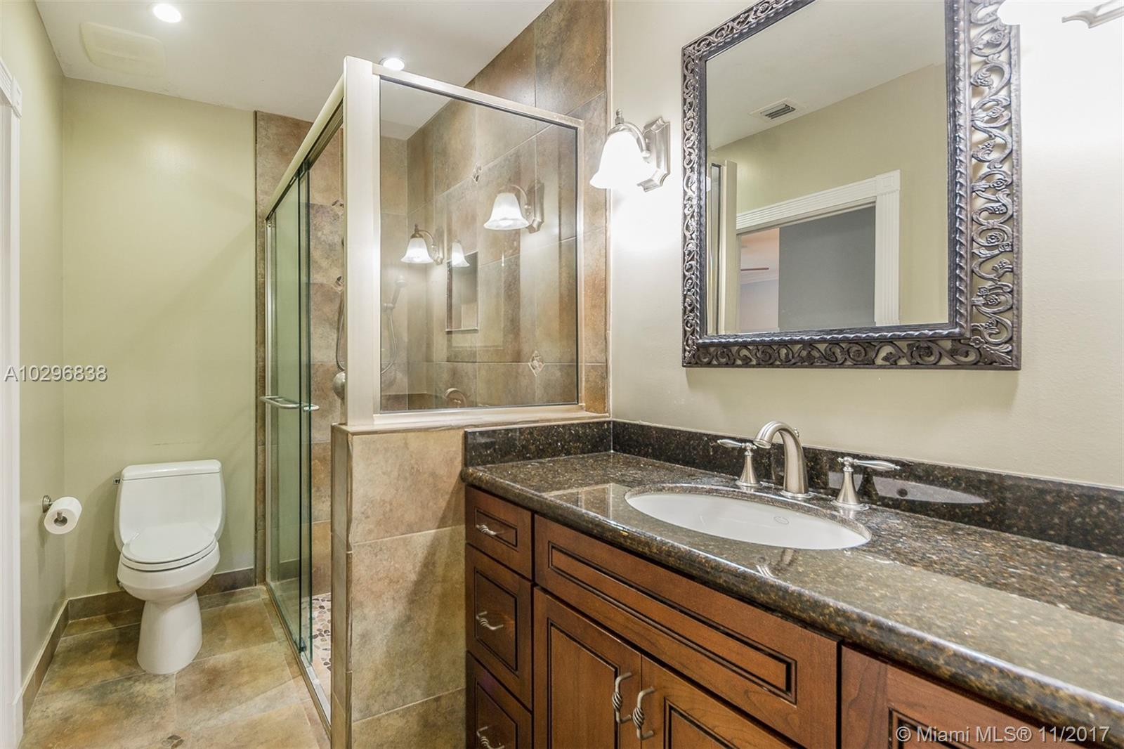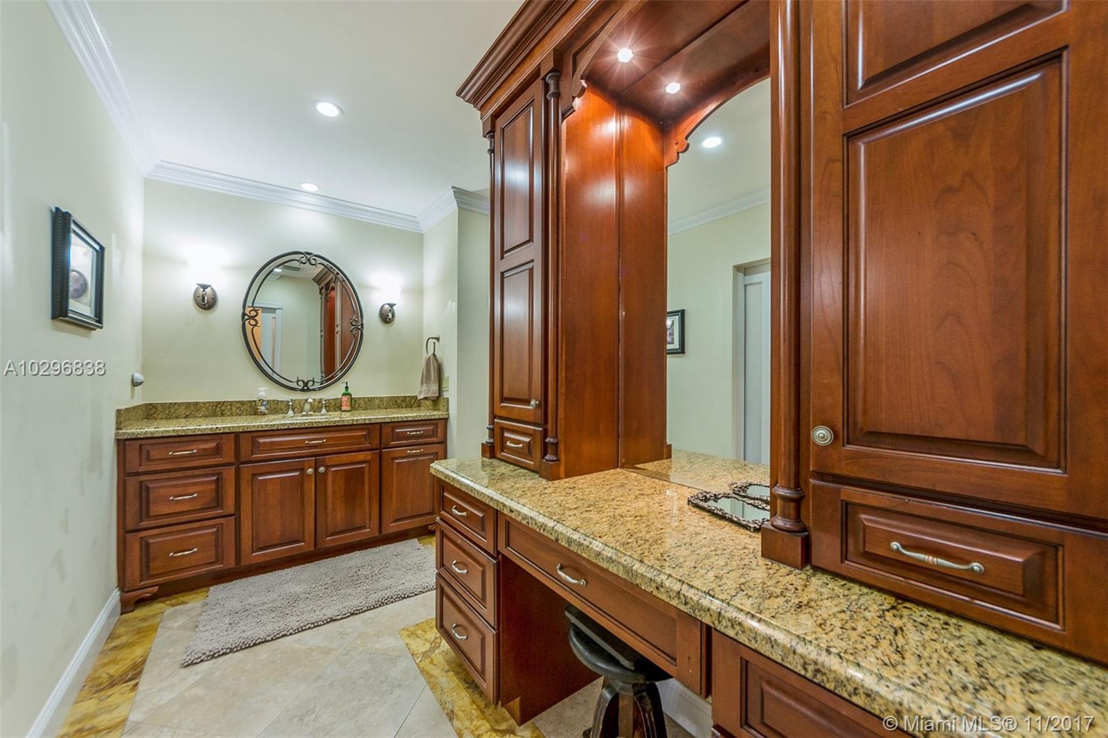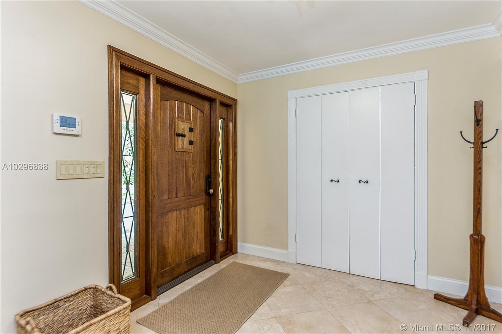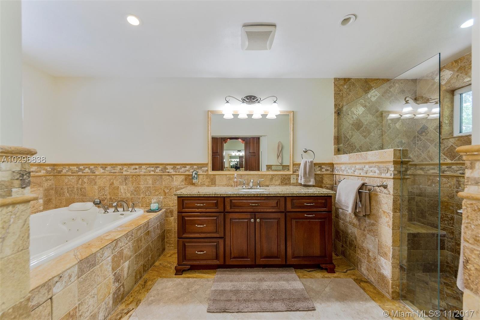 Fantastic 4 bedroom + office, 4 bathroom remodeled home situated on almost an acre on a quiet street in the Village of Pinecrest. Open concept living area includes large living room with charming keystone fireplace, casual dining area & beautiful kitchen with stainless steel appliances, island, wooden cabinetry, and eat in snack bar. Formal dining room. Family room with wet-bar and full cabana bath. Master suite features customized walk in closet with built in shelving. Master bath has vanity, double sinks, separate shower and tub, beautiful stone tile. Expansive covered patio with retractable electric screen. Tile flooring, plantation shutters and impact windows throughout. Indoor laundry room. Wonderful, private back yard with swimming pool & basketball court. Oversized two car garage.