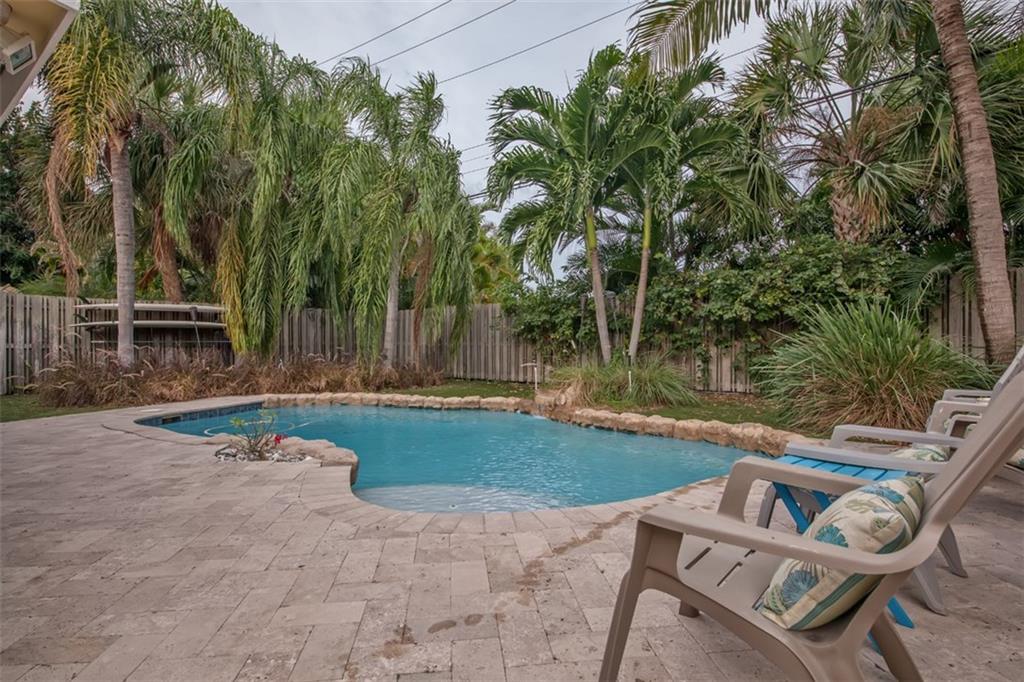 Don't miss this opportunity just steps from the beach! This 4/3 partially furnished family home is move-in ready with updated kitchen and baths. This home boasts a fully equip laundry room, hurricane impact windows, salt water pool, low maintenance lawn, built-in outdoor grill zone, fireplace, tons of closets, new plumbing, electrical, roof and A/C. The newly renovated master suite has two expansive closets, a large master bath with soaking tub, shower, double vanity sink and separate water closet.