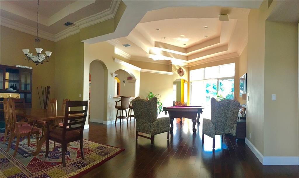 Spectacular wide open triple split floor plan with 17 foot ceilings.Durable wood floors throughout. Large deep pool equipped with swim in place propulsion,LED lighting(controlled from inside house) & 3 fountains. Intercom throughout house. 4 ceiling flush mounted speakers. Extended fenced yard. Beautiful views of lush landscaping on a wide area of HB lake. Very little traffic due to location. Huge kitchen pantry. 2 walk in closets in MB. Walk in closet in princess suite. Bonus room instead of 5th BR