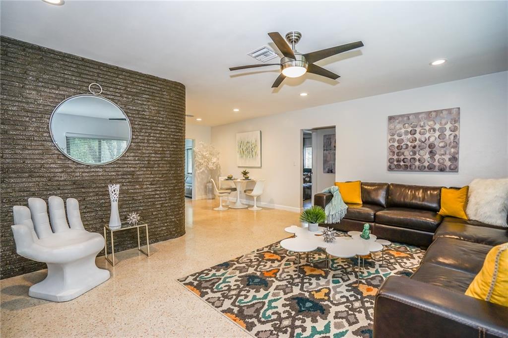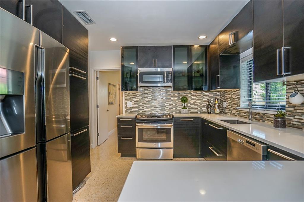 MID CENTURY BEAUTY in VICTORIA PARK w/ CURVED BRICK WALL in LIVING ROOM & TERRAZZO FLOORS THRU-OUT. UPDATES IN 2016: NEW IMPACT WINDOWS & DOORS, ELECTRICAL WIRING & PANEL BOXES, NEW S- TILE ROOF w/ STRAPS, BOTH BATHS REMODELED, NEW OPEN KITCHEN w/ BREAKFAST BAR & ESPRESSO TONE CABINETRY, WHITE QUATRZ COUNTERTOPS & TOP OF THE LINE APPLIANCES, NEW LANDSCAPING FRONT & REAR, 35X15 POOL RE-MARCITED, NEW ALL LED LIGHTING, NEW FENCE, NEW AC DUCT WORK & GUTTERS. OFFICE OFF KITCHEN COULD BE 3rd BEDROOM.