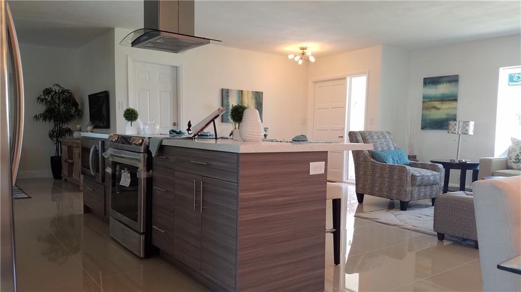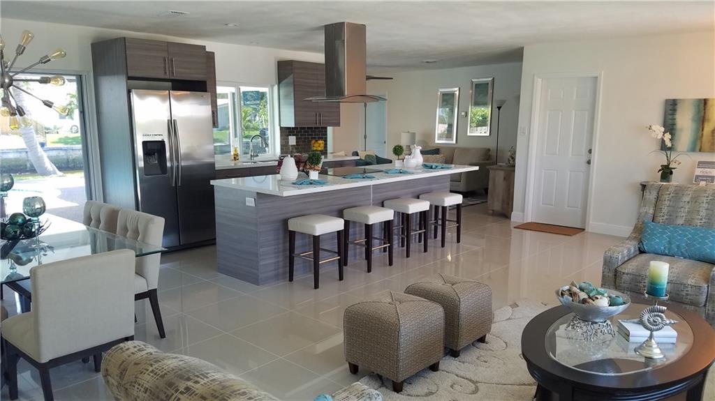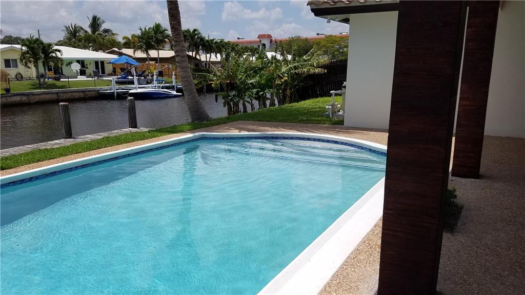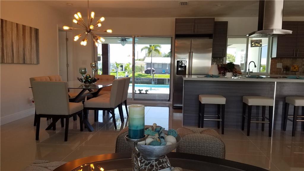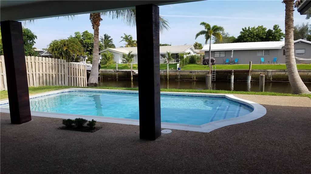 Spectacular sought after Coral Ridge Isles Ocean access waterfront home w/pool & 2 car garage. A complete remodel w/permits! Euro kitchen, quartz counters, stainless steel appliances, oversized cooking island w/hood & seating. 24x24 porcelain tiles throughout, impact windows & sliders, new roof, new a/c, new pool equipment. large covered patio plenty of room for a summer kitchen perfect for entertaining, soothing views of pool, canal & lush mature tropical landscape. Dock & seawall will be redone too.