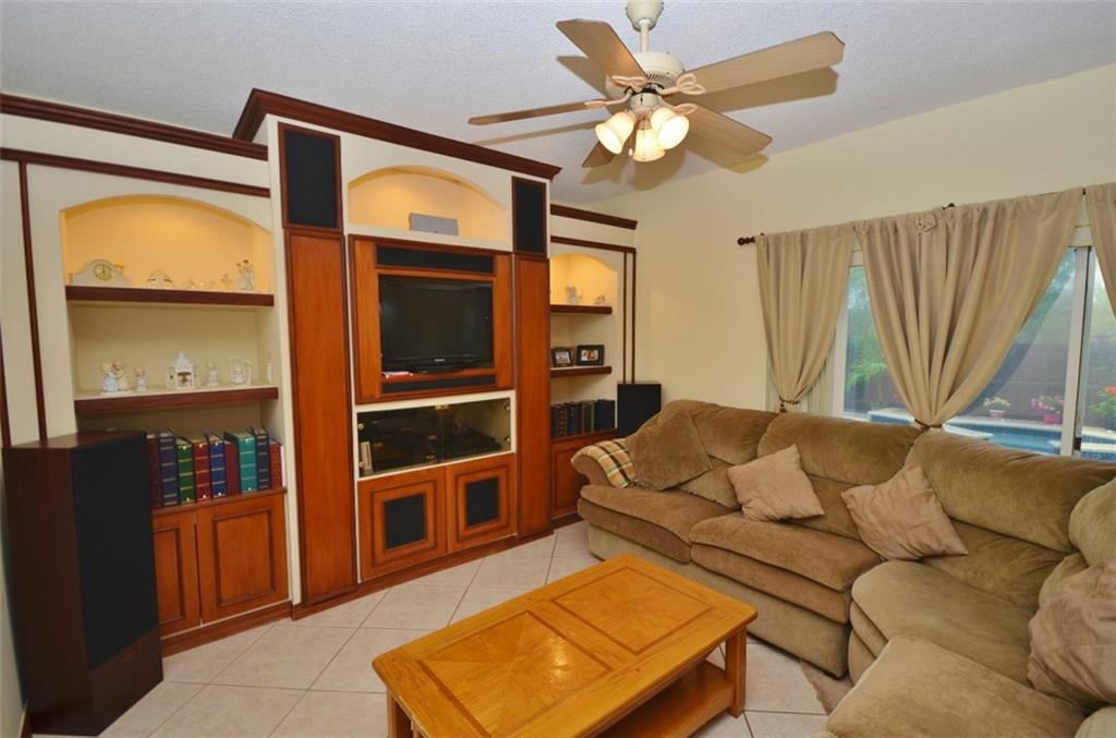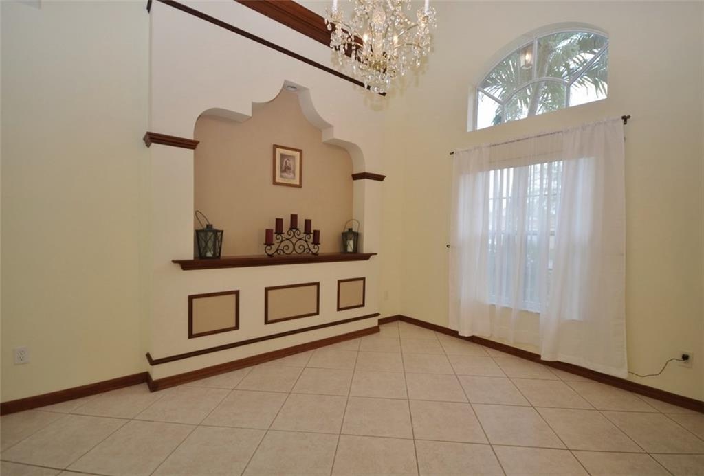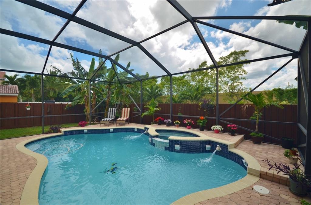 Perfection for Sale! This uniquely designed home in 24/7 guard-gated community, grand foyer entry/expansive ceilings, eat-in kitchen with large pantry, granite & wood cabinetry, gorgeous upgraded master bath, with glass shower door, sparkling, screened/newly remarcited pool & spa, living rm with wet bar, & formal dining, freshly painted, tinted windows, brick paved patio, driveway/walk-ways, alarm, & hurricane accordion shutters! Comm Rec Center/Pools, fitness...mtn fee covers water for sprinklers. Wow!!