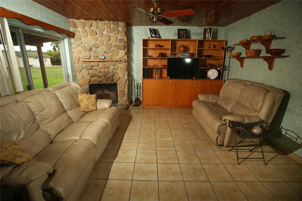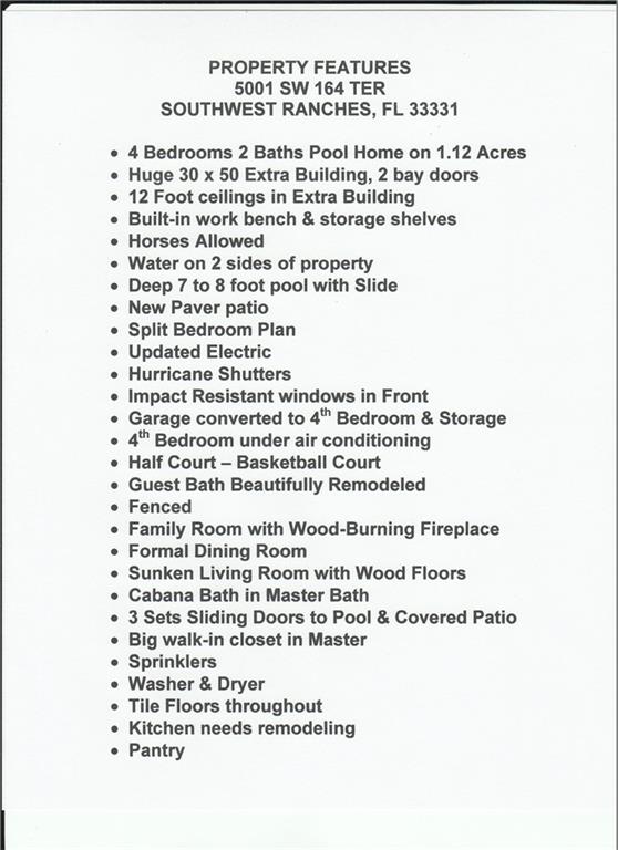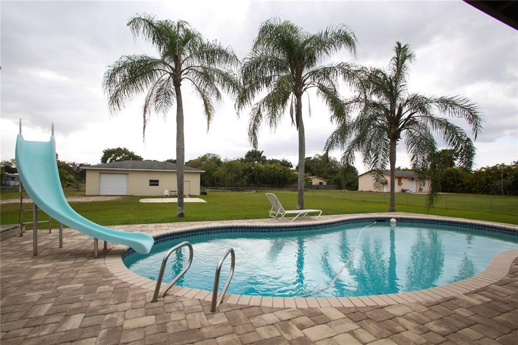 Priced reduced below market value 4/2 waterfront home on 1.12 acres with deep pool. 4th Bedroom under air in partially converted 2 car Garage HUGE 30x50 Bldg w/2 bay doors, fenced, bordered on two sides by water, tile & wood floors. NO HOA! Has Tremendous Potential. Updating needed, 1 bathroom beautifully remodeled. Enjoy So Fla living under a covered paver patio or in front of wood burning fireplace. Bring horses or park boats, RV's, custom cars or more. Minutes to shopping, highway, top rated schools.