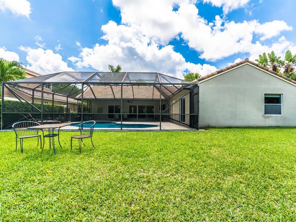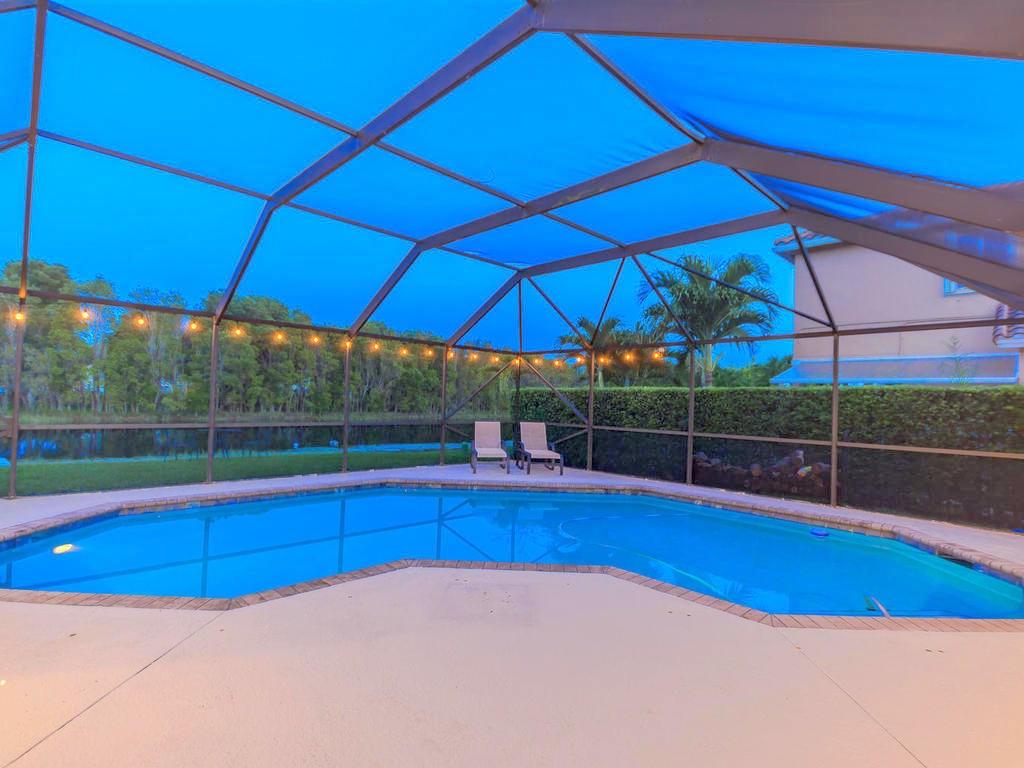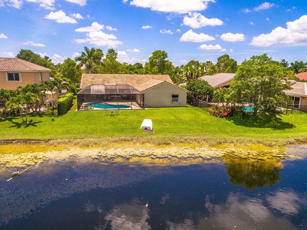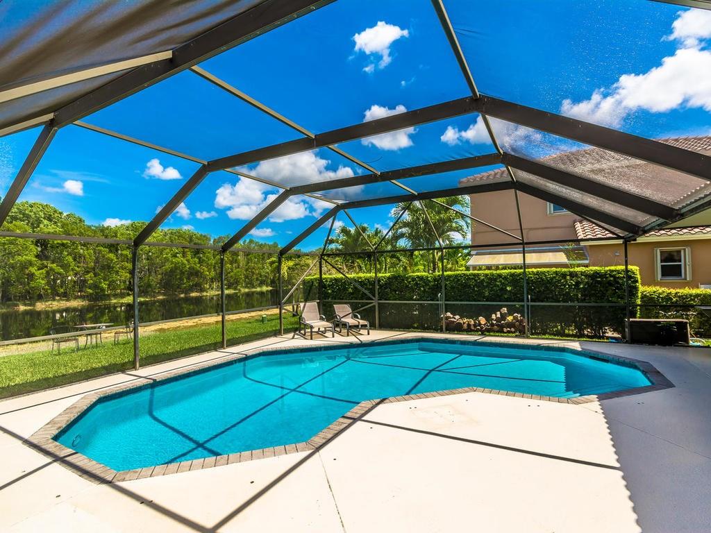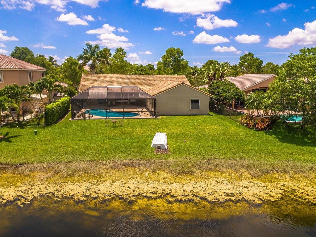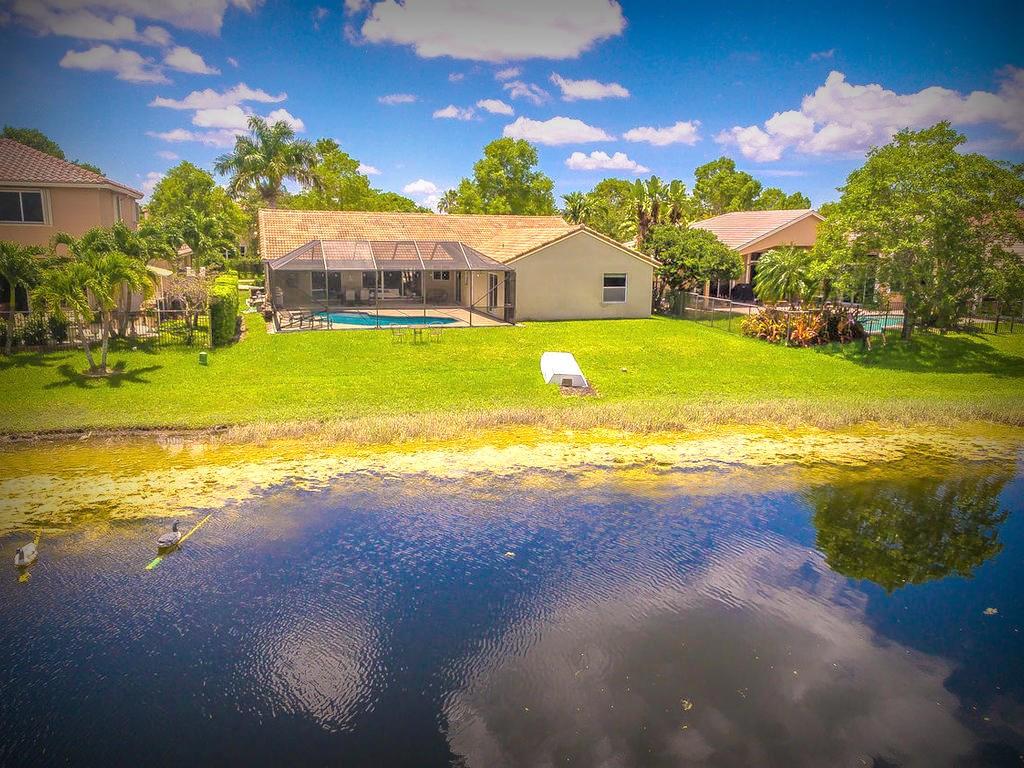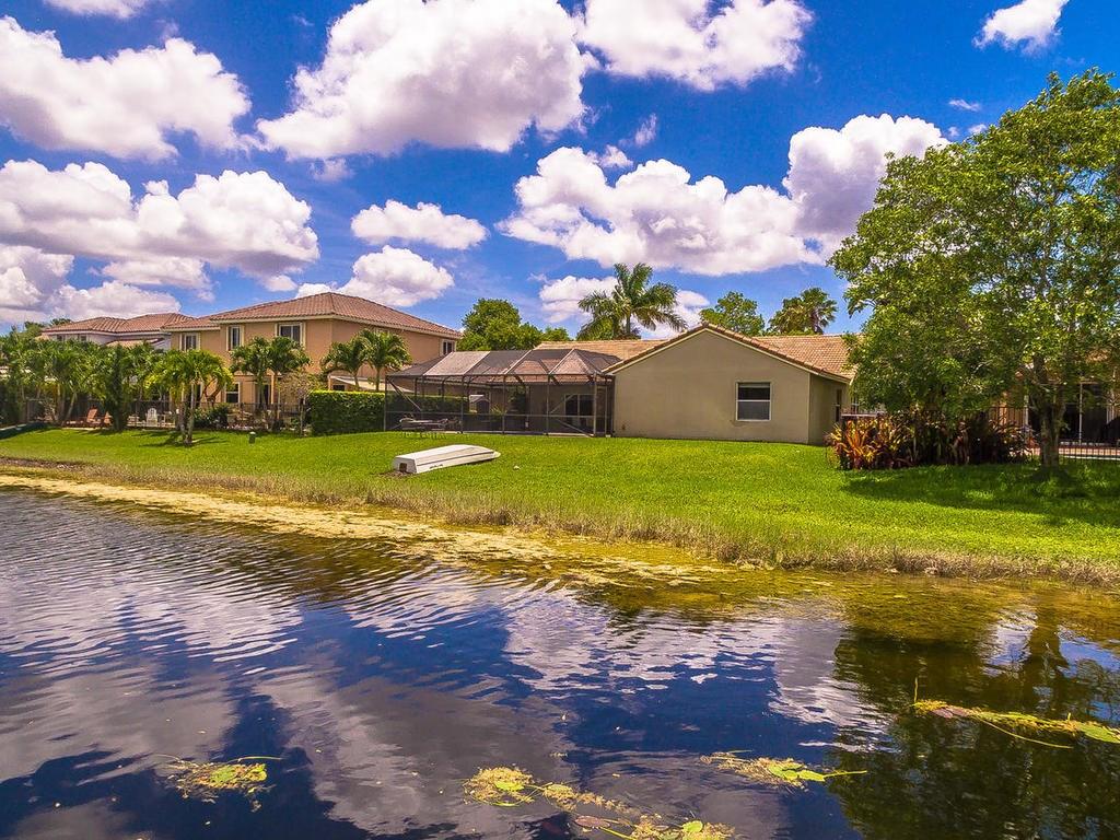 GORGEOUS 4/2.5/2CG SINGLE STORY ON PEACEFUL LAKEFRONT LOT W/LUSH PRIVACY BERM & HUGE YARD FOR PLAY! AN ENTERTAINERS DREAM! LARGE COVERED SCREENED PATIO W/EXTENDED OVERHANG, TWINKLING LIGHTS & HEATED POOL, PERFECT FOR YEAR-ROUND ENJOYMENT! SPACIOUS SPLIT FLR PLN W/HIGH CEILINGS, WOOD LAM FLOORS IN LIV AREAS, REMODELED GRANITE KITCHEN, WOOD CABS, NEWER SS APPLI INCL DOUBLE OVENS & LARGE SNACKBAR ISLAND. NEW ROOF! CABANA BTH, NEW WASHER, OUTDOOR SPEAKERS. GUARD GATED, CLUBHOUSE, TOTLOT, BALL PARK, A+SCHOOLS!