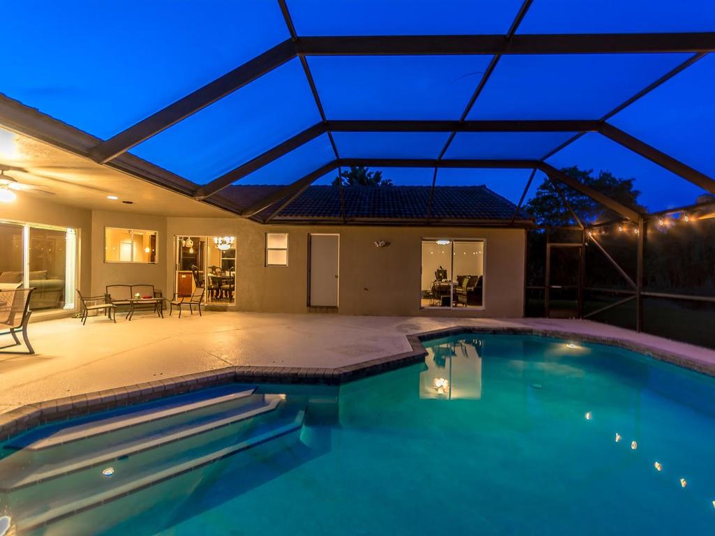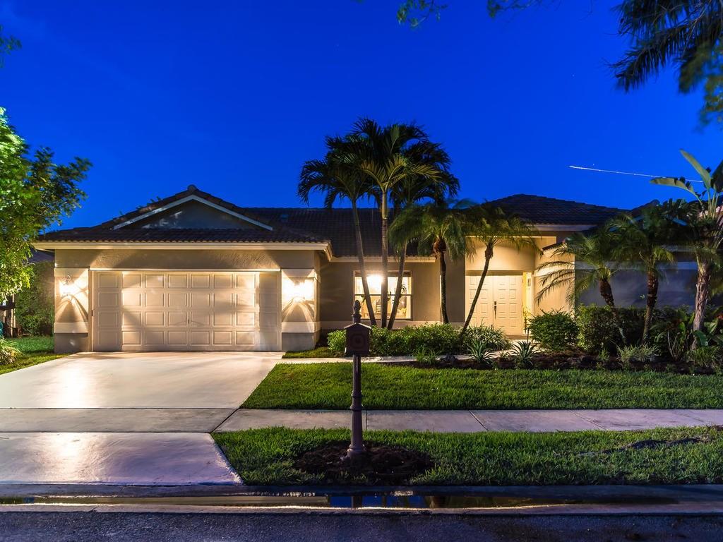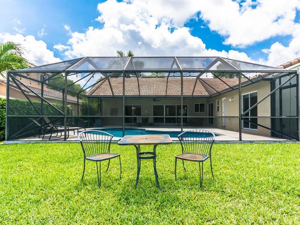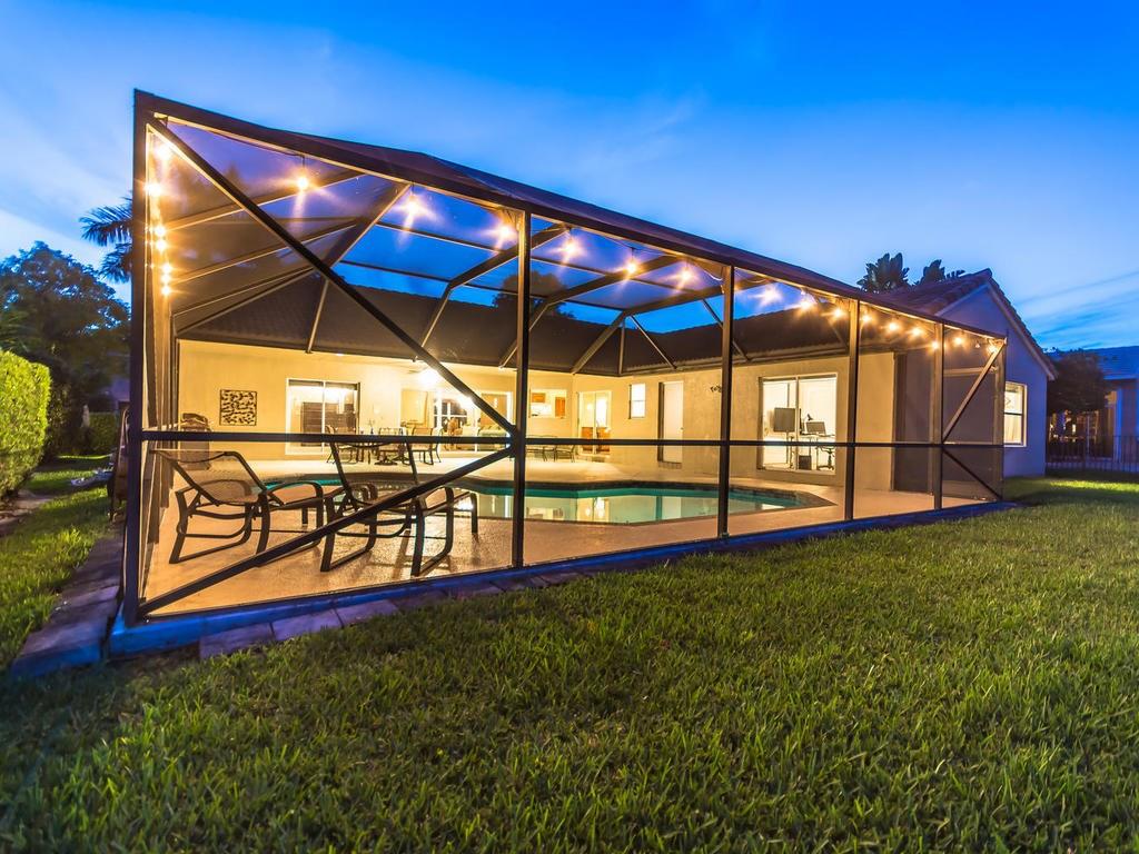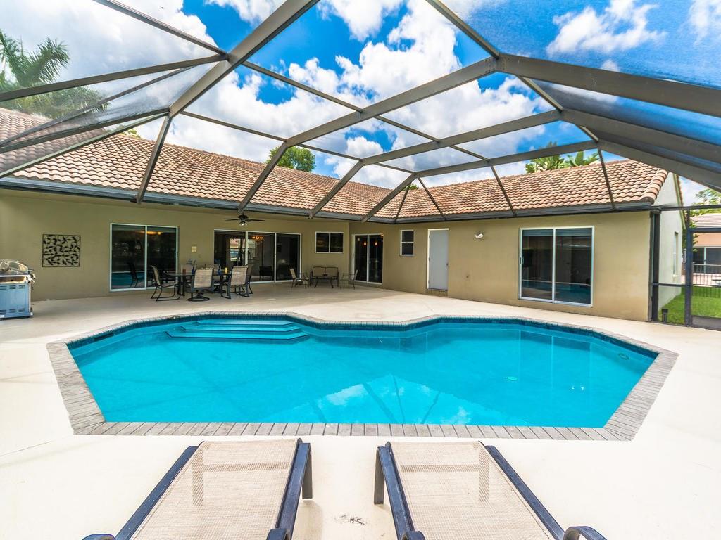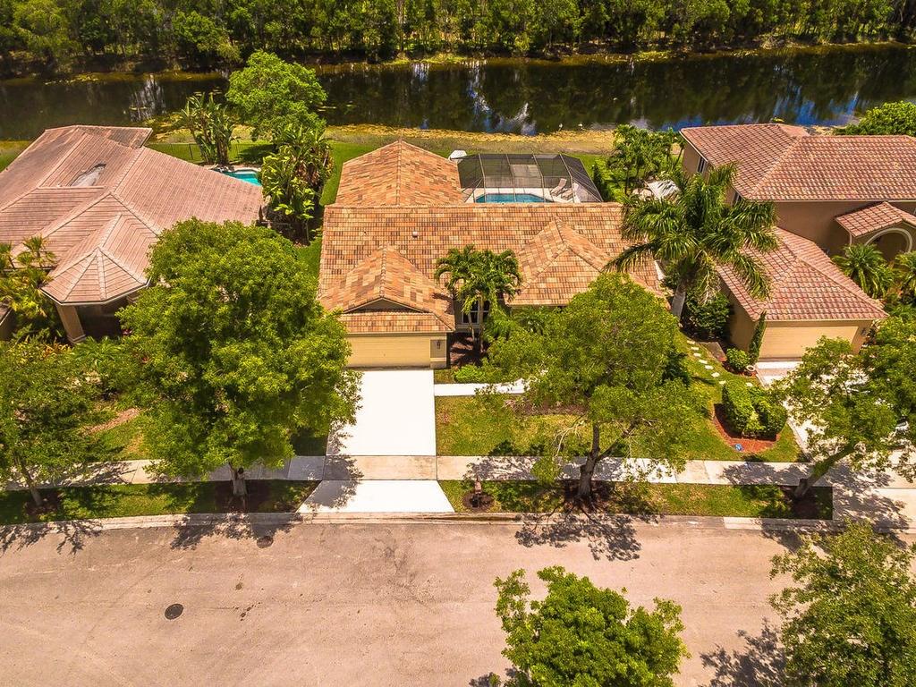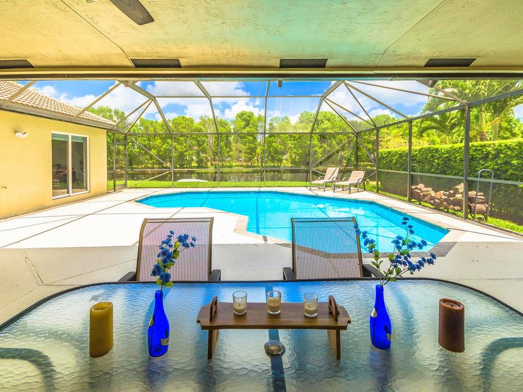 GORGEOUS 4/2.5/2CG SINGLE STORY ON PEACEFUL LAKEFRONT LOT W/LUSH PRIVACY BERM & HUGE YARD FOR PLAY! AN ENTERTAINERS DREAM! LARGE COVERED SCREENED PATIO W/EXTENDED OVERHANG, TWINKLING LIGHTS & HEATED POOL, PERFECT FOR YEAR-ROUND ENJOYMENT! SPACIOUS SPLIT FLR PLN W/HIGH CEILINGS, WOOD LAM FLOORS IN LIV AREAS, REMODELED GRANITE KITCHEN, WOOD CABS, NEWER SS APPLI INCL DOUBLE OVENS & LARGE SNACKBAR ISLAND. NEW ROOF! CABANA BTH, NEW WASHER, OUTDOOR SPEAKERS. GUARD GATED, CLUBHOUSE, TOTLOT, BALL PARK, A+SCHOOLS!