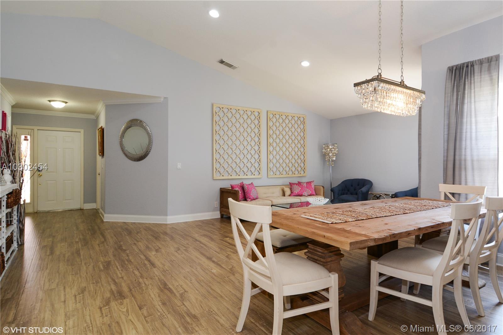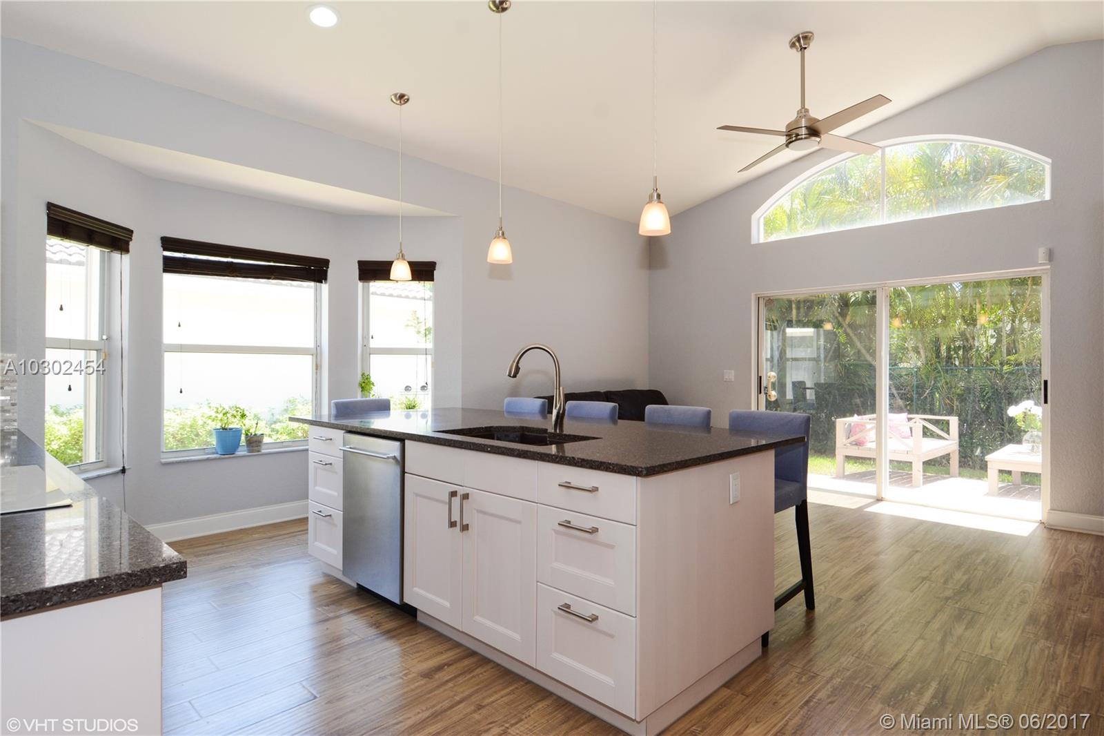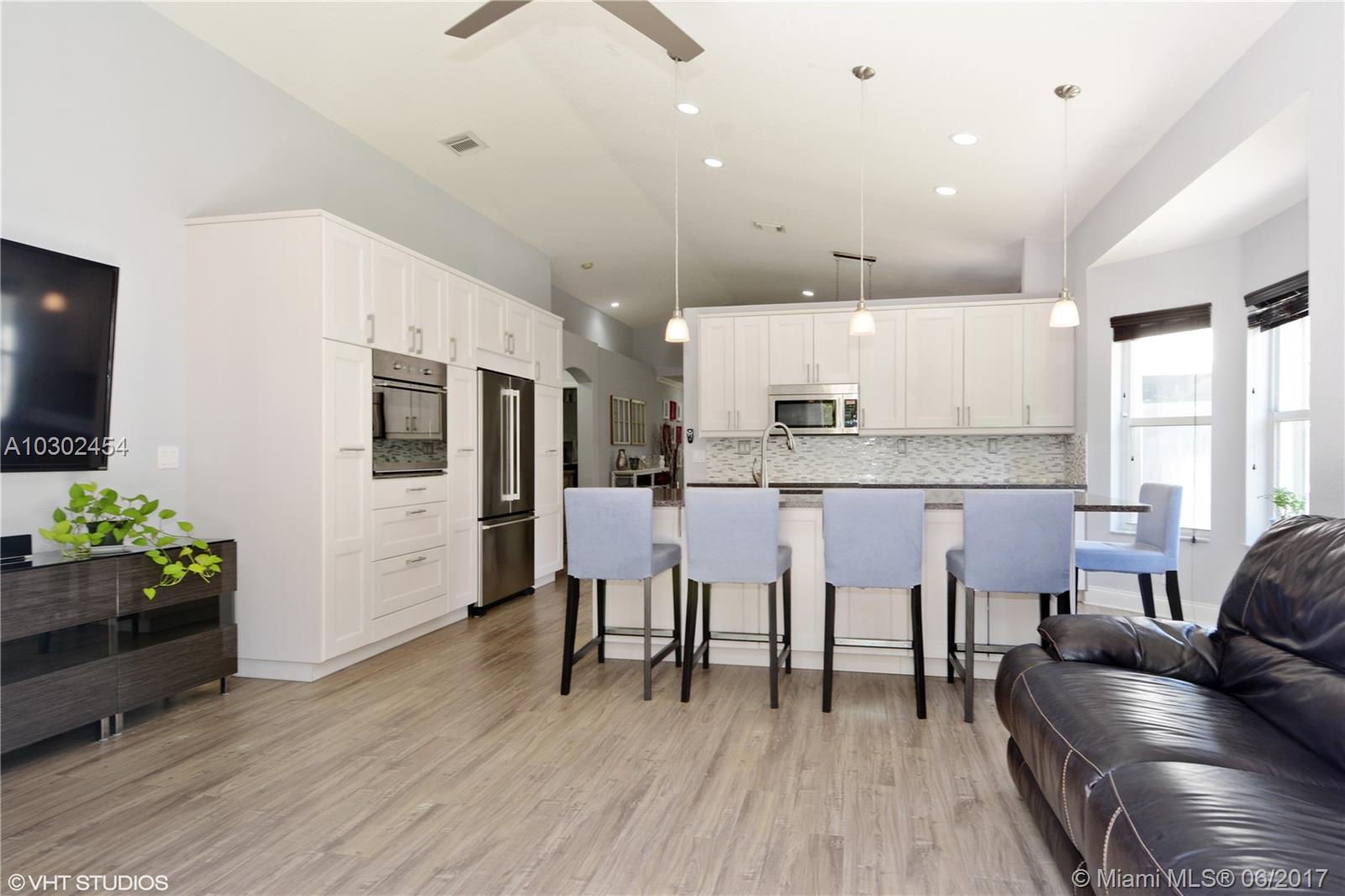 Splendid home in MapleRidge community located between to 95 and the Turnpike on Griffin Rd. Close to Ft Laud airport, 30 minutes from Miami, community pool, dogpark, child playground, and front lawn care included. Fully fenced yard with no neighbors offers private patio space, great for entertaining. Large open kitchen features 12' vaulted ceilings, beautiful island, new appliances, french door fridge, plenty of light, and more than enough storage. Home has been upgraded with tank-less hot water heater, crown molding and tall baseboards throughout, new paneled doors, California closets, recessed LED lighting, and ceiling fans in bedrooms and living area. Separate laundry room with extra large Samsung washer/dryer. Large two car garage improved with built in storage lofts and extra fridge.