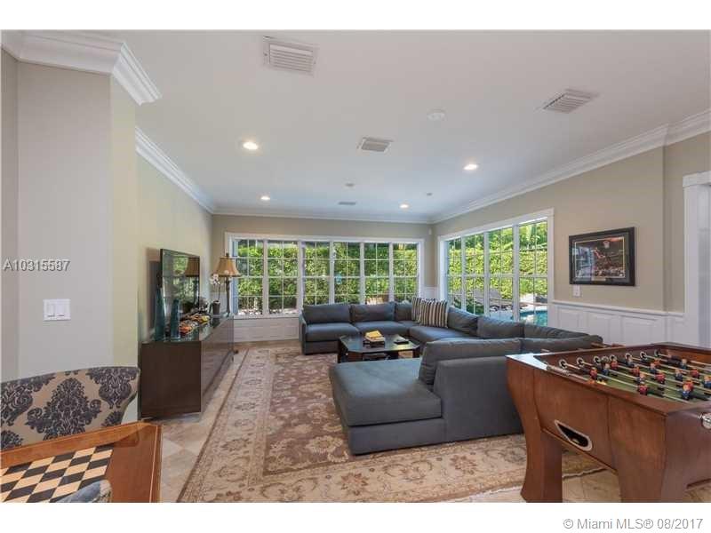 Beautiful finishes and prime location on gated acre in north Pinecrest. This 2 story 6BR/5.5BA home includes library, bar, gym & 4 car garage. Lofty ceilings shed abundant light throughout the home. Marble & wood flooring. Enormous Chef's kitchen overlooks resort style pool, Jacuzzi & lighted sports court. Elegantly appointed Master suite. Fireplace, generator & more. Lushly landscaped on very quiet street.