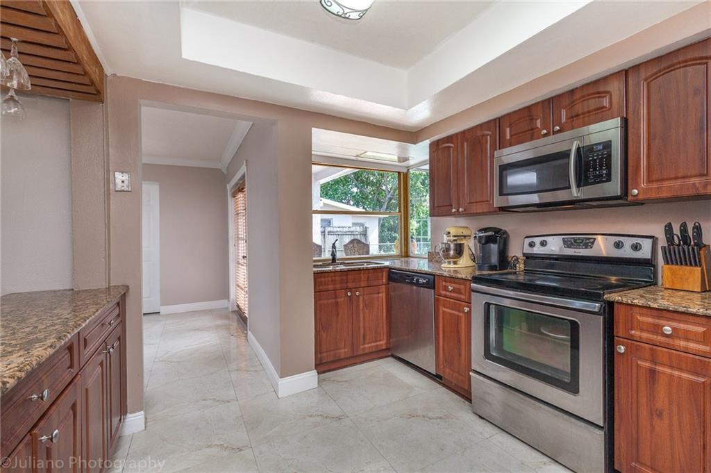 Lovely & Spacious 3 bedroom 2 bath Pool (Den has been made into a 4th bedroom). Open and airy with lots of windows & light. New A/C and Beautiful Kitchen with granite countertops & SS appliances, there are windows that open to the pool creating a lovely view from the kitchen. This home has lots of Curb Appeal- new stucco and freshly painted exterior. New pavers in front & Pool area. New Hurricane shutters and more.