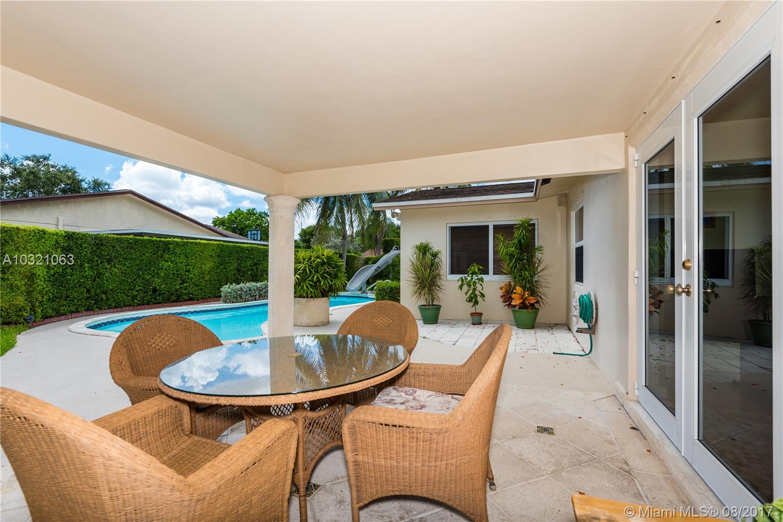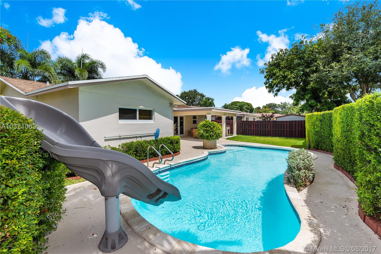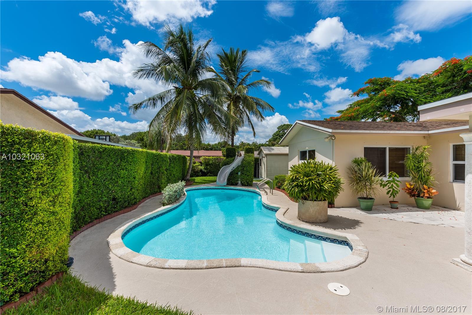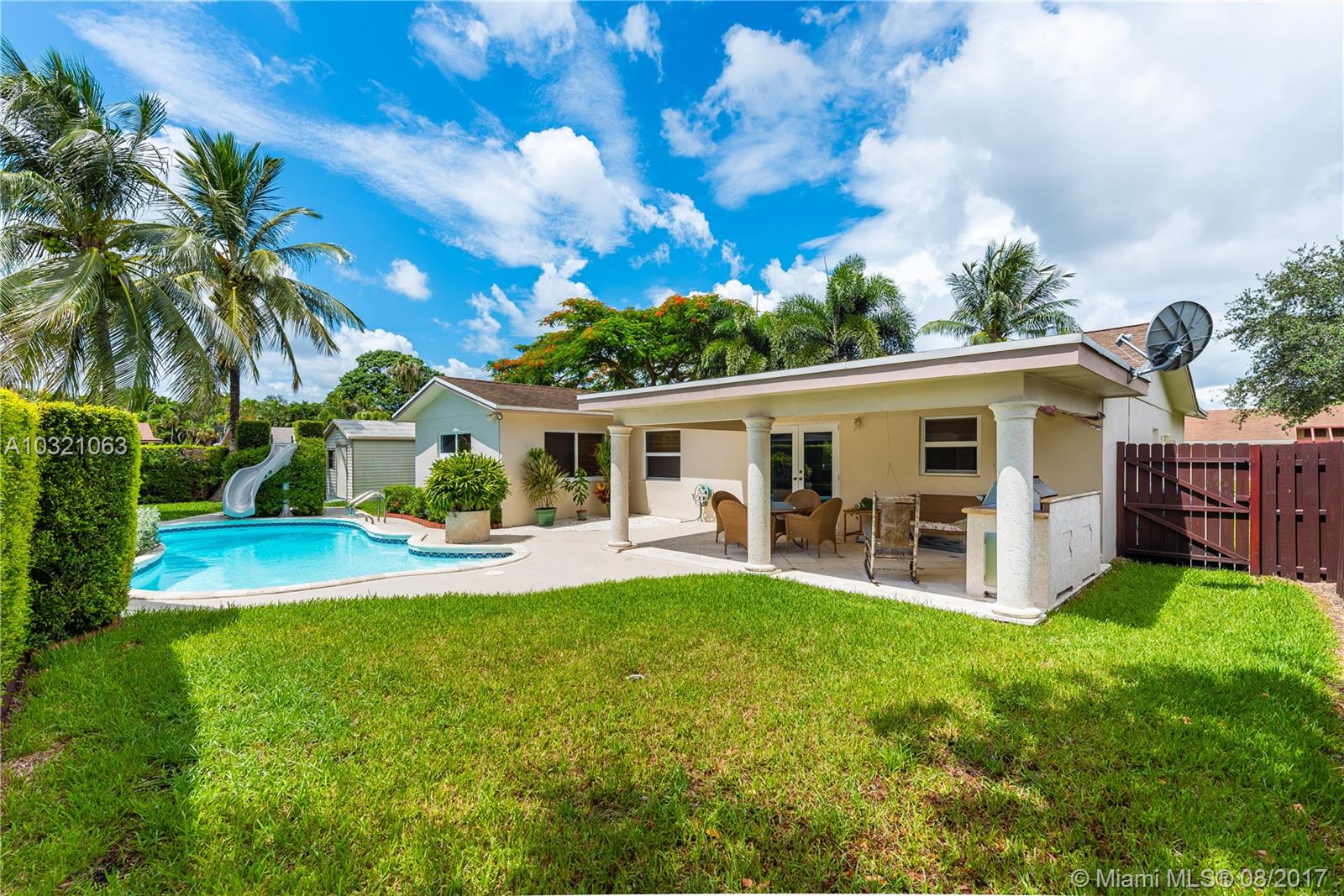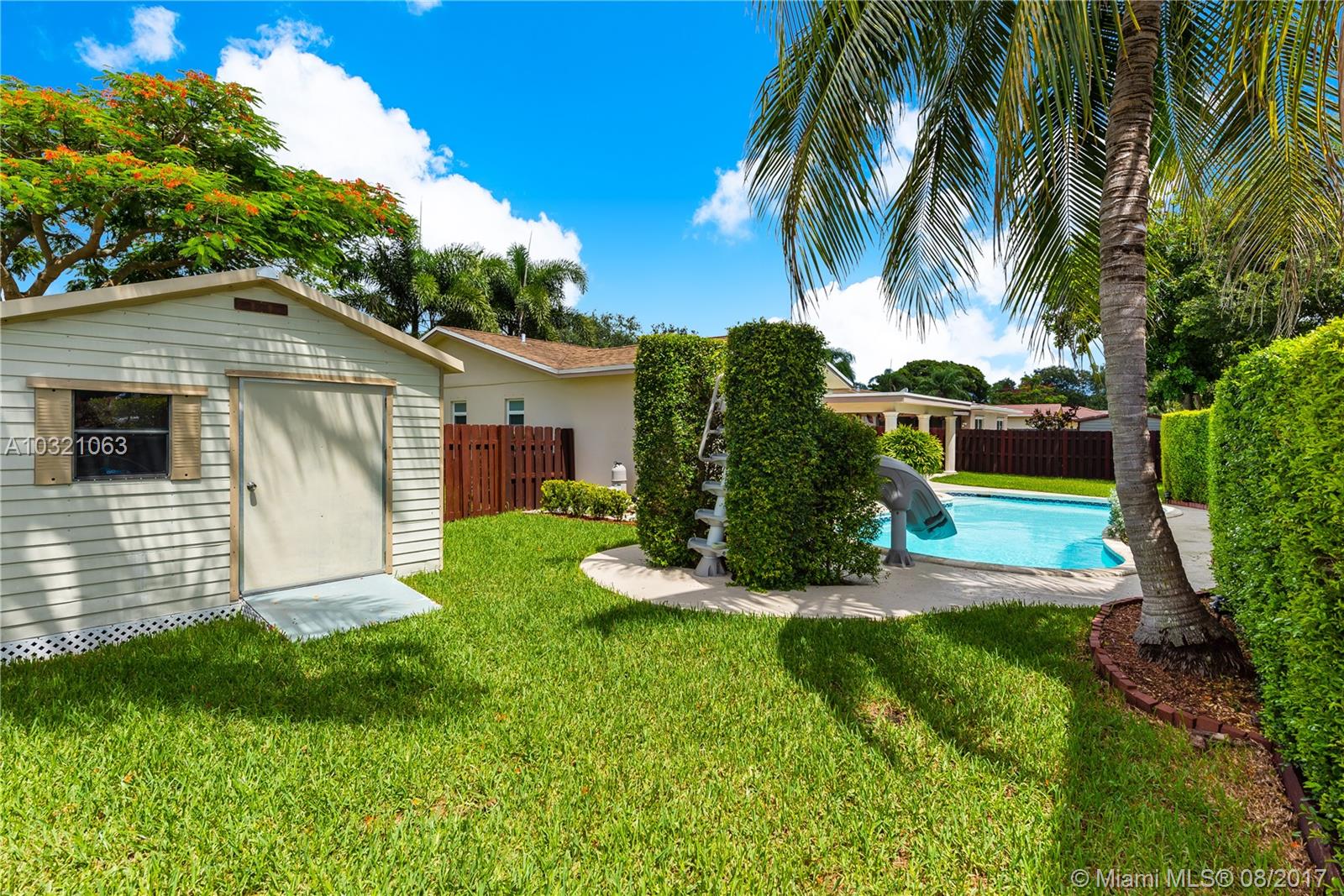 Enjoy a beautiful retreat in your own fenced backyard with beautiful lanai with outside kitchen and pool. Impact windows and doors, updated electrical, newer a/c, all stainless steel appliances, new dishwasher, updated bathrooms, 1 car garage with oversize driveway to fit 2 cars side by side. Beautiful lush landscaping with palm trees. Shed also provides great storage space.